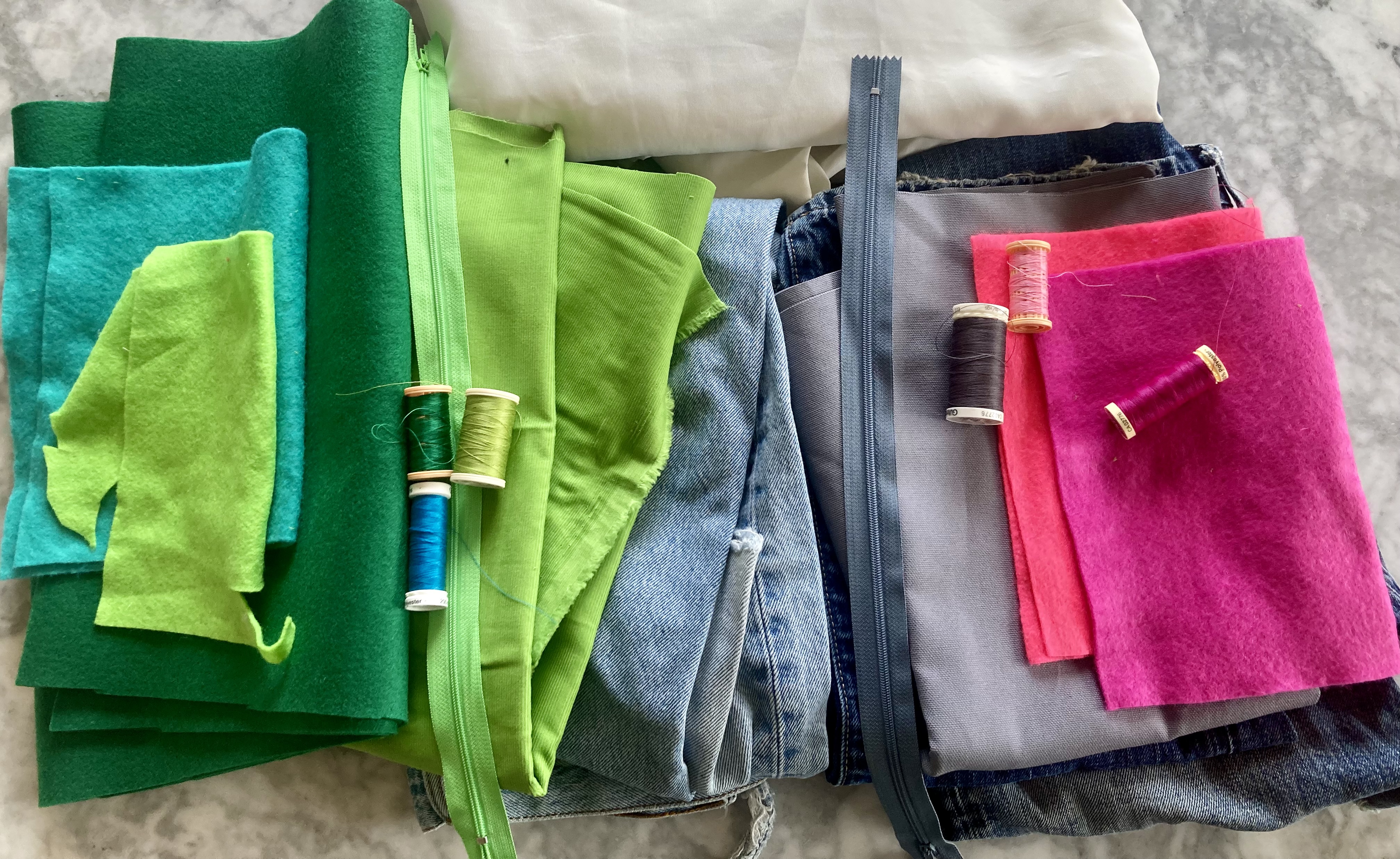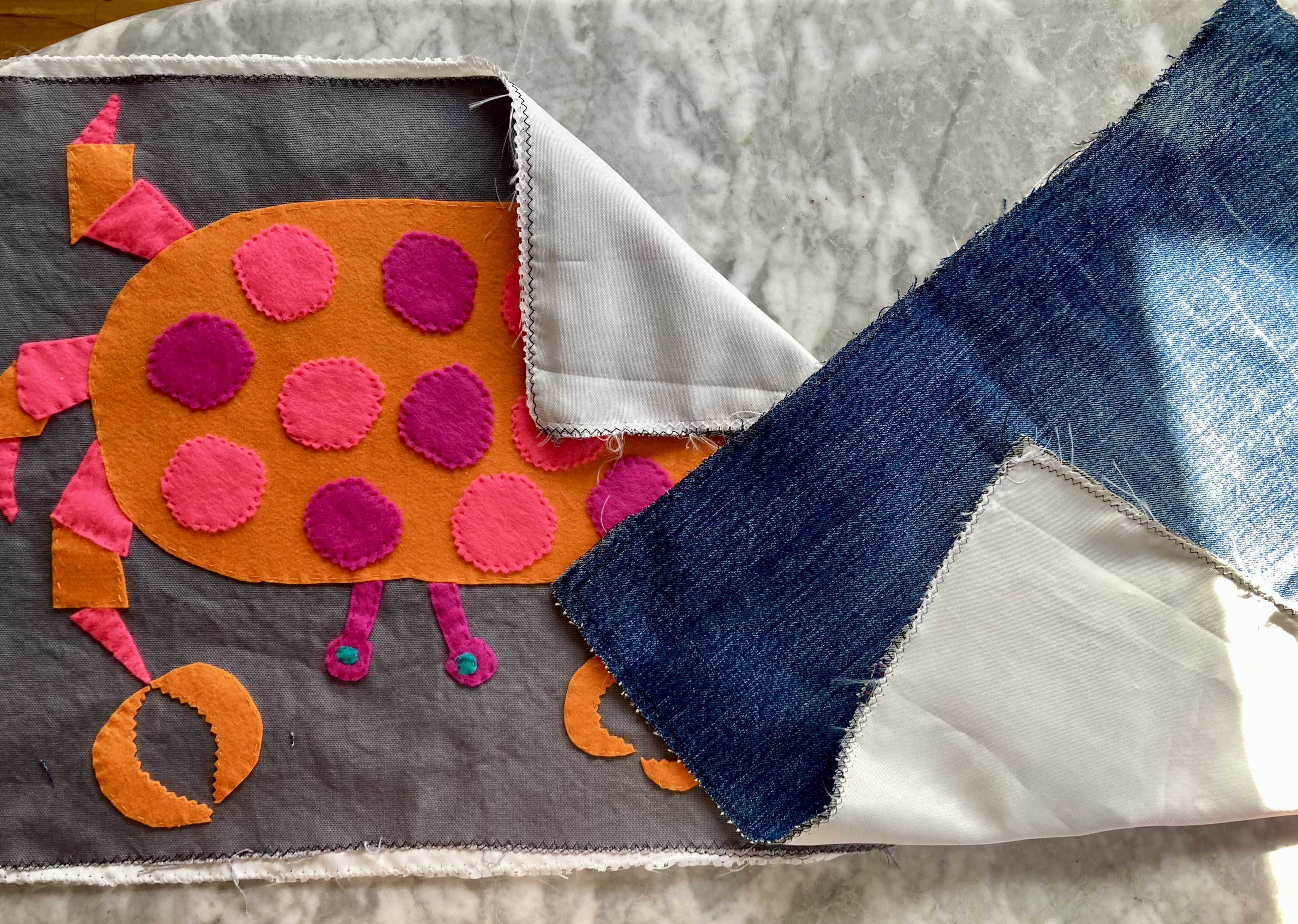 My backing fabric was from the leg of an old pair of jeans from the upcycling drawer. I used the leg seam as the bottom of the bag and found some lining material to match. Cristanne Miller’s book on Emily Dickinson’s grammar made an excellent straightening guide.