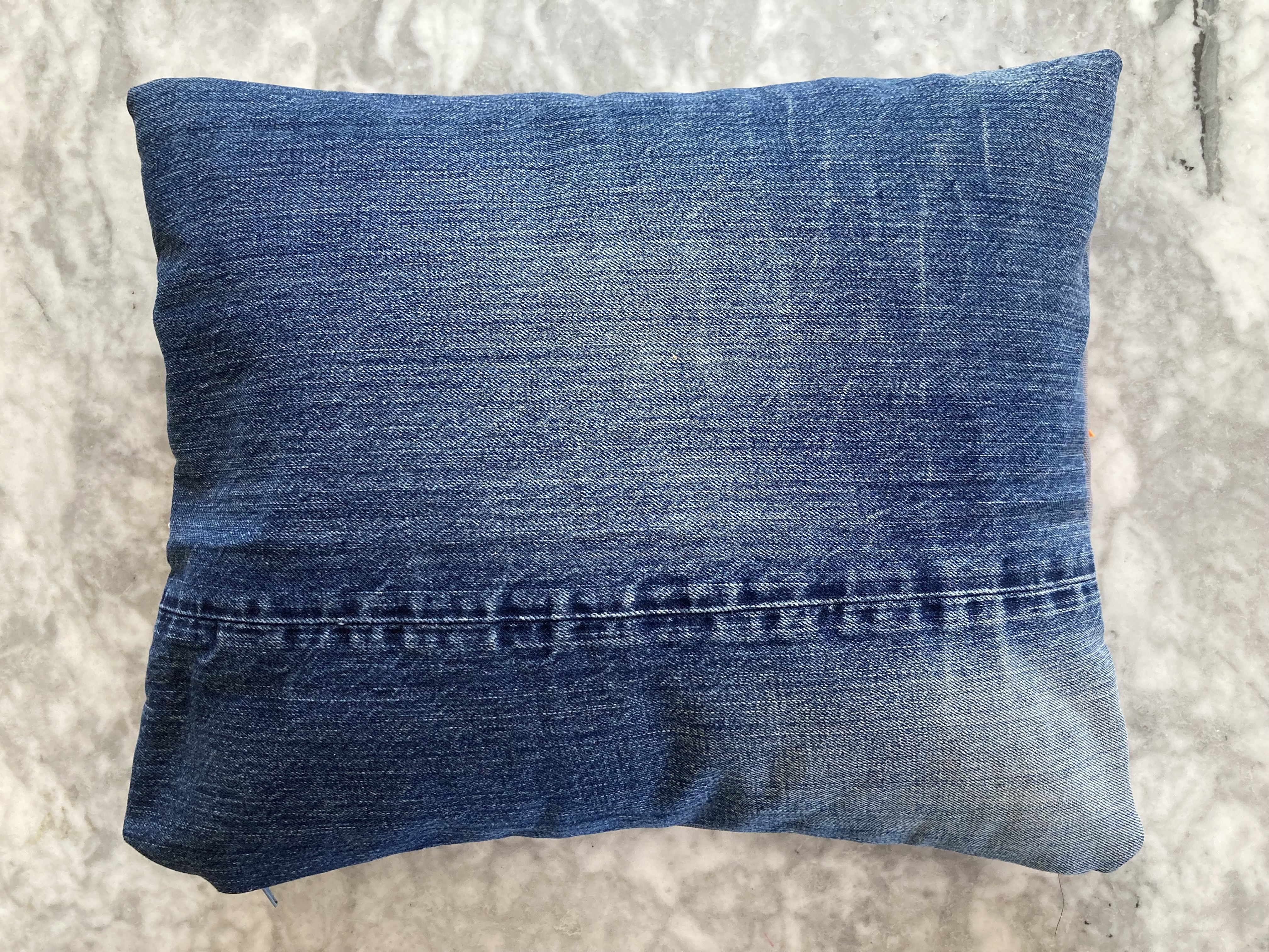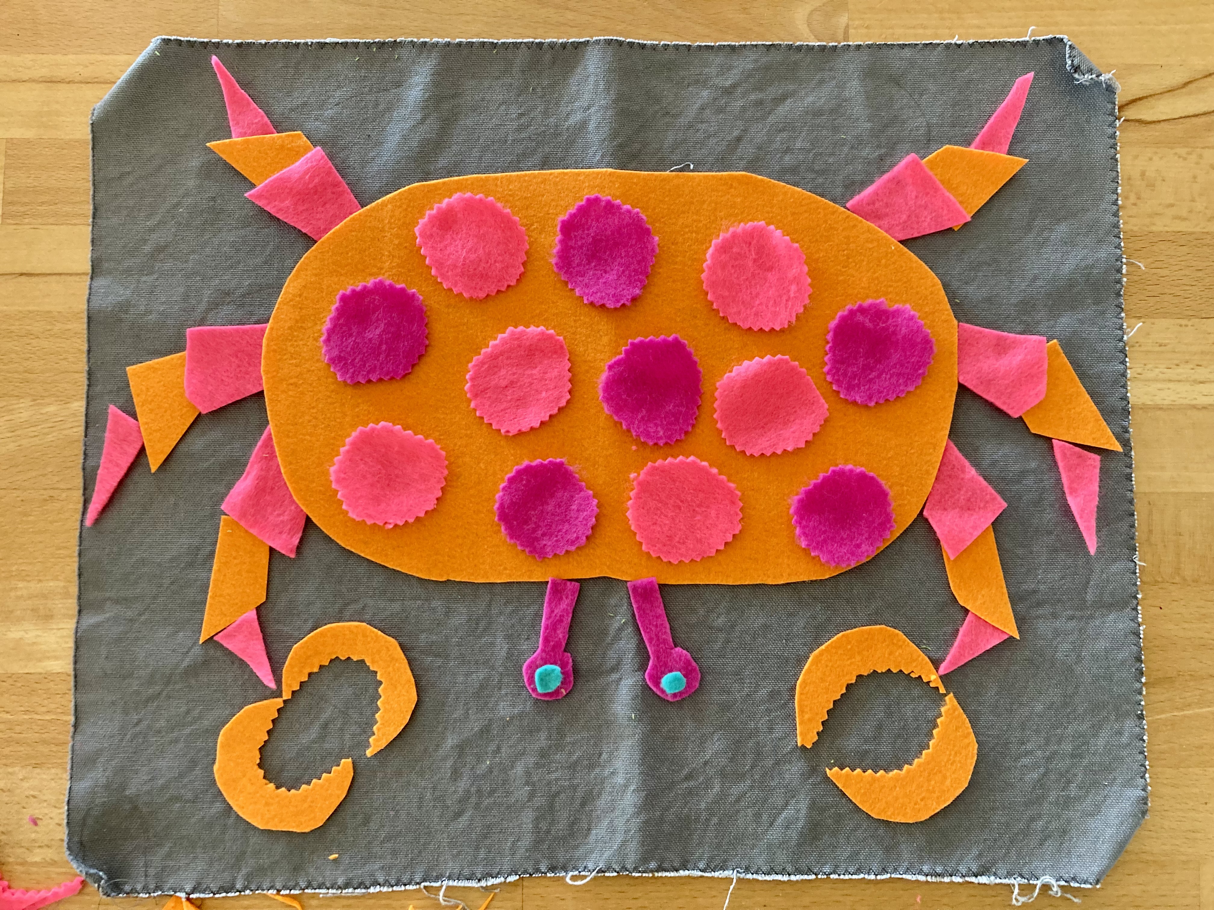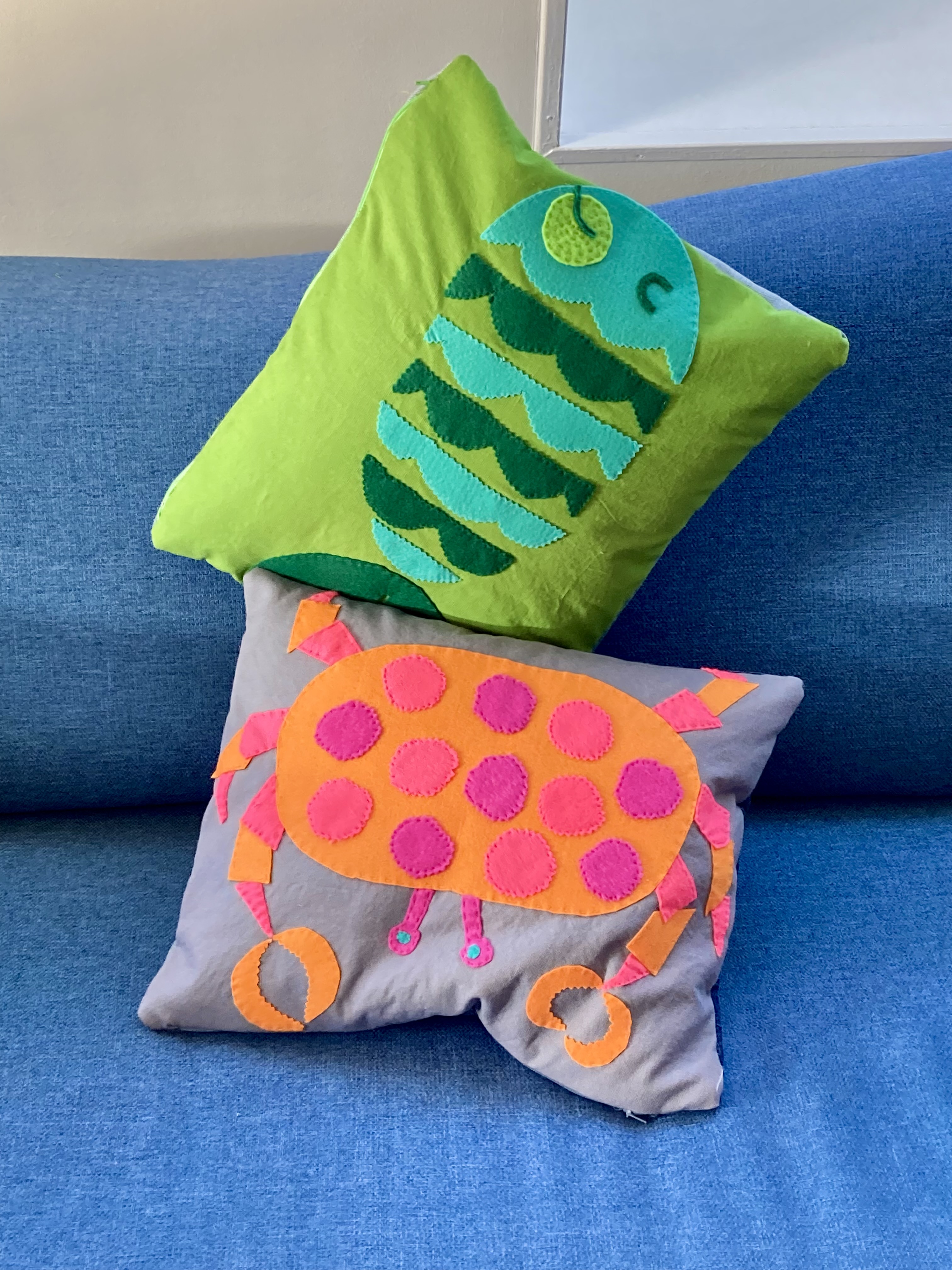 What colour cat? The cats in the pattern are white (rug, on royal blue background), white (nightcase, on light blue background), or blue (cushion, on cream background). I could have gone more realistic, with light grey or charcoal grey or brown. It didn’t seem whimsical enough, though. The design is so cute and cartoony that I found it better to use an entirely unrealistic colour, like the blue cat on the cushion. I had a big piece of pink felt that looked great on the blue jeans, so there it was. I made a cut-out template by photocopying the magazine page enlarged.
