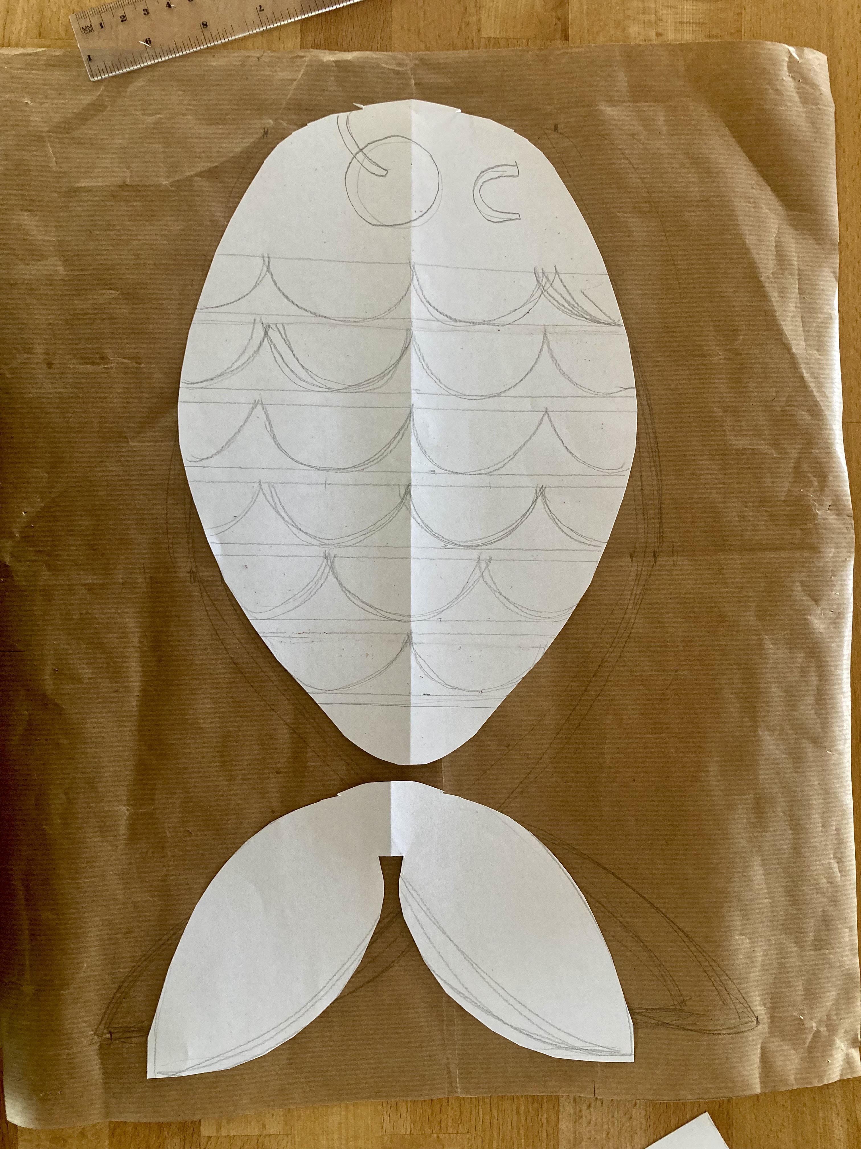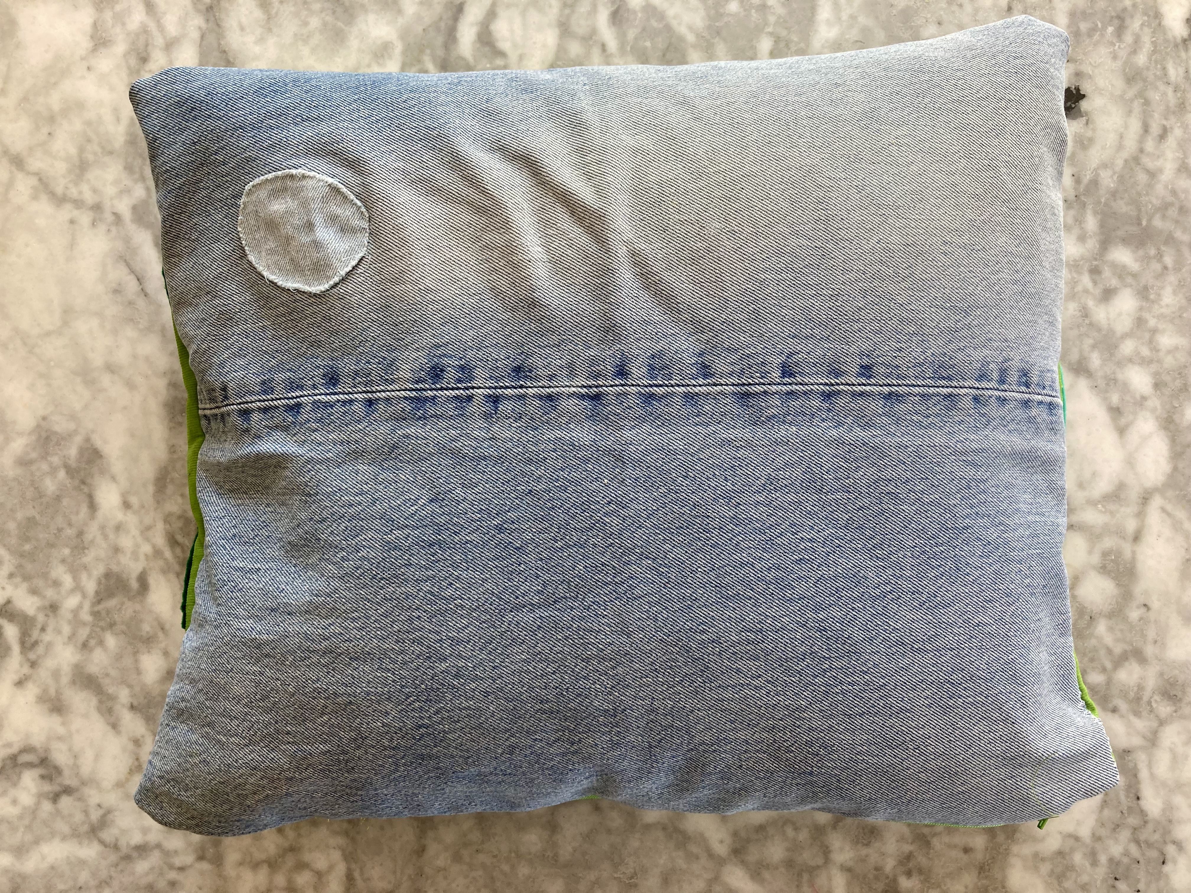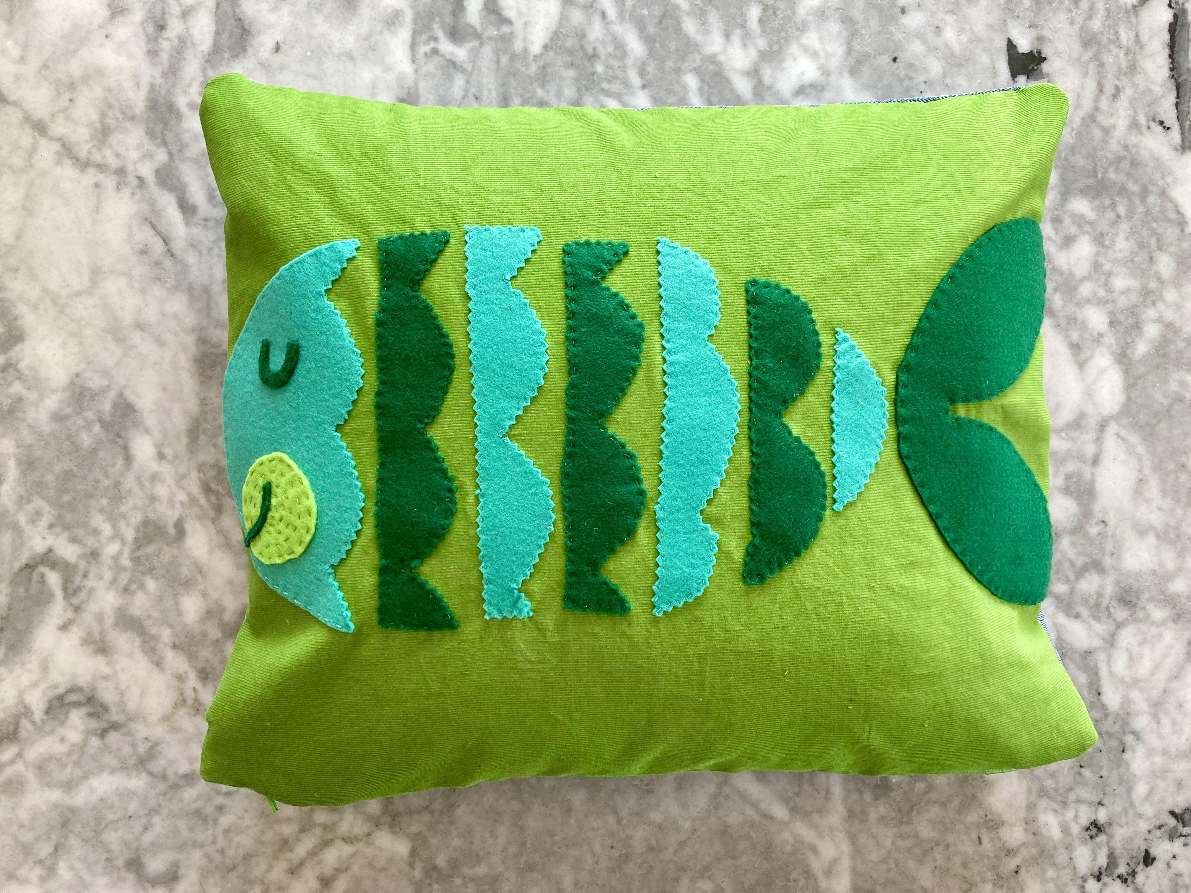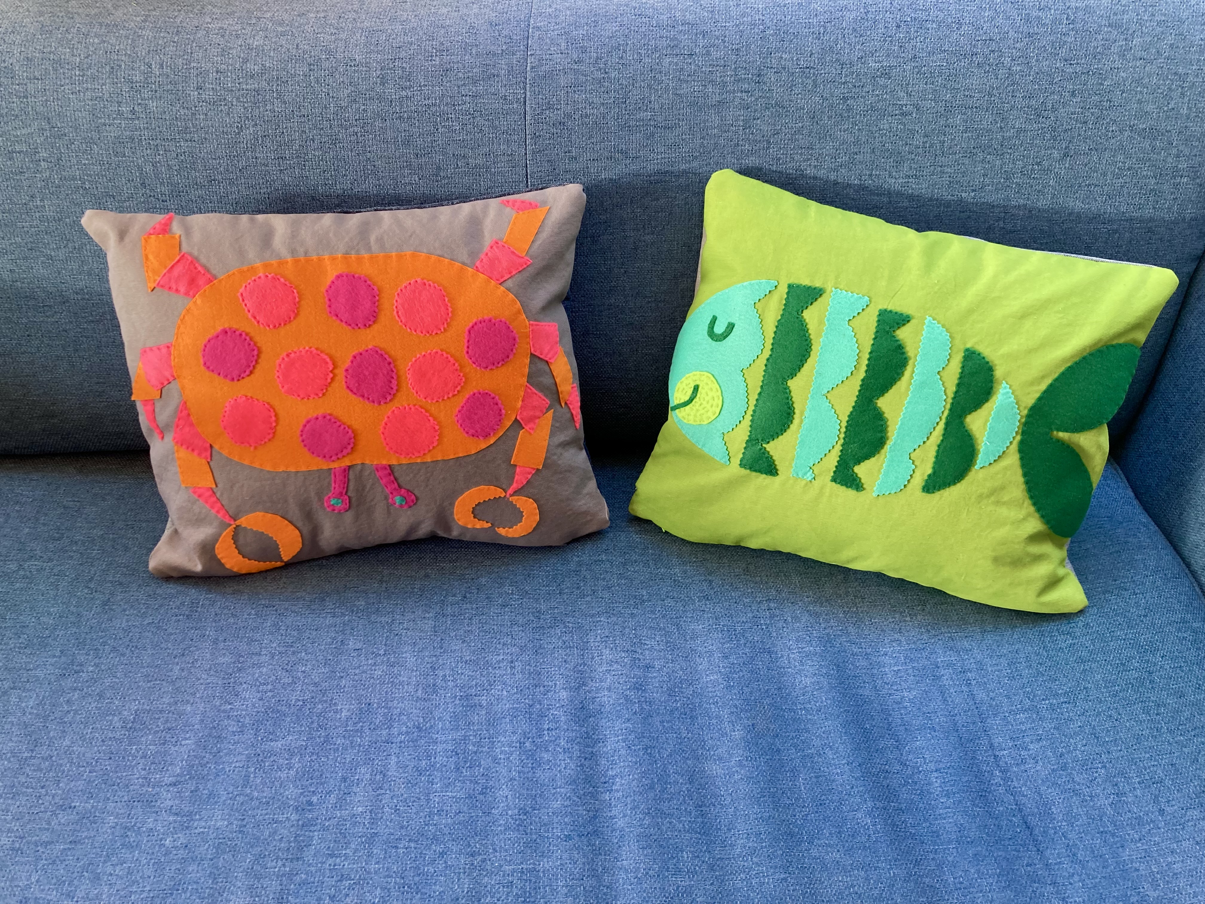 What colour cat? The cats in the pattern are white (rug, on royal blue background), white (nightcase, on light blue background), or blue (cushion, on cream background). I could have gone more realistic, with light grey or charcoal grey or brown. It didn’t seem whimsical enough, though. The design is so cute and cartoony that I found it better to use an entirely unrealistic colour, like the blue cat on the cushion. I had a big piece of pink felt that looked great on the blue jeans, so there it was. I made a cut-out template by photocopying the magazine page enlarged.