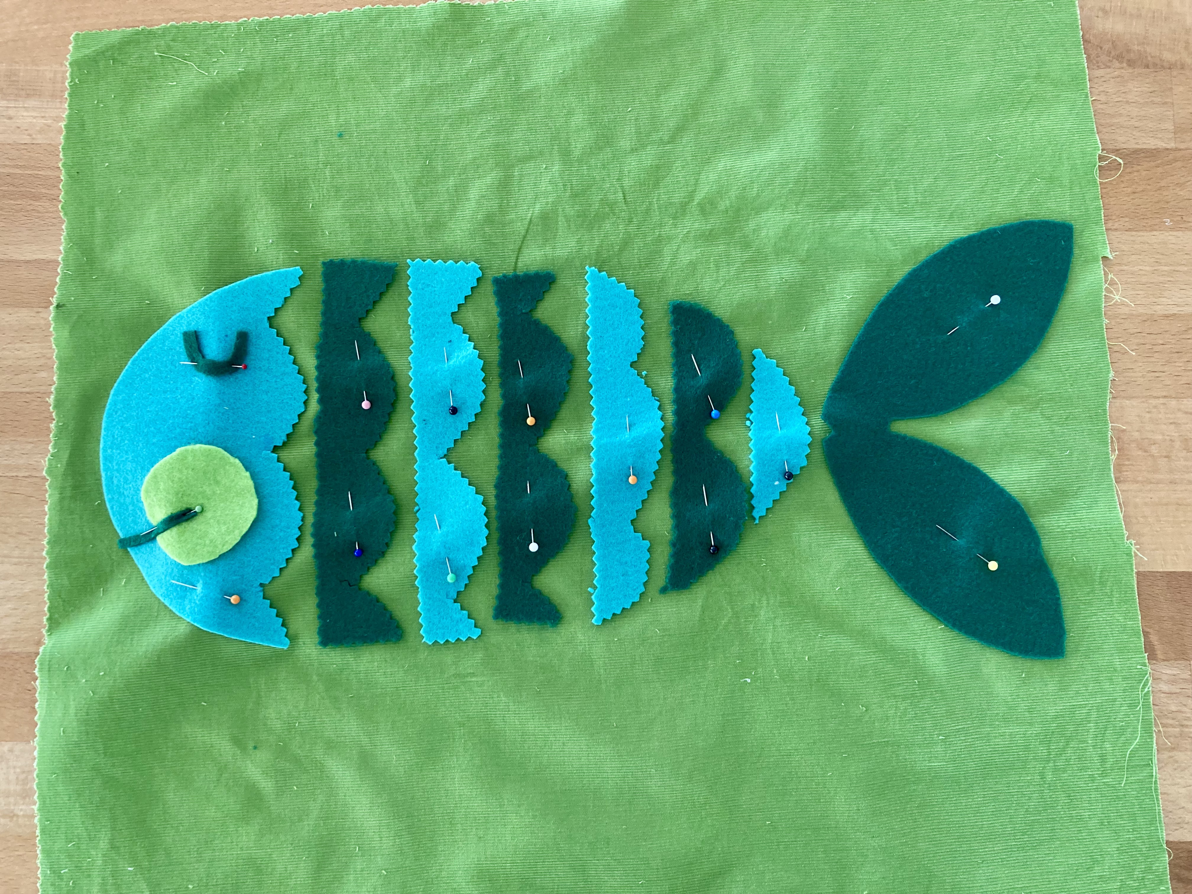 I tried out a few different ideas for the flowers before committing to sewing anything down. My design didn’t leave a lot of room for seam allowances, so I left off the decorative lines on the sides. A single flower at the bottom right looked good, but unbalanced, so I added two more flowers at the upper left and upper middle. I adapted the bow around the cat’s neck into a more simple collar and left off the bow on the cat’s tail.