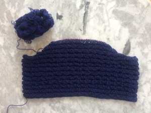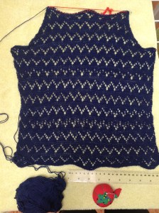 The lace stitch refused to block out flat, no matter what I did. I wash-blocked, stretched and pinned both sleeves before making the yoke (see photo above) and they had bunched up again by the time I was done knitting. I wash-blocked, stretched and pinned the whole garment after completion and the sleeves bunched up again five minutes after I unpinned it (dry). I pinned the sleeves and steamed them, then ironed them with the same result. Did I mention that this yarn is 75% wool and 25% acrylic, which normally blocks for good when any kind of heat is applied? Well, no matter what I did, it didn’t take. The yoke stretches out naturally while worn, but the sleeves bunch up. Since they are supposed to be below-elbow-length anyway, I decided to call it a design feature and live with it.