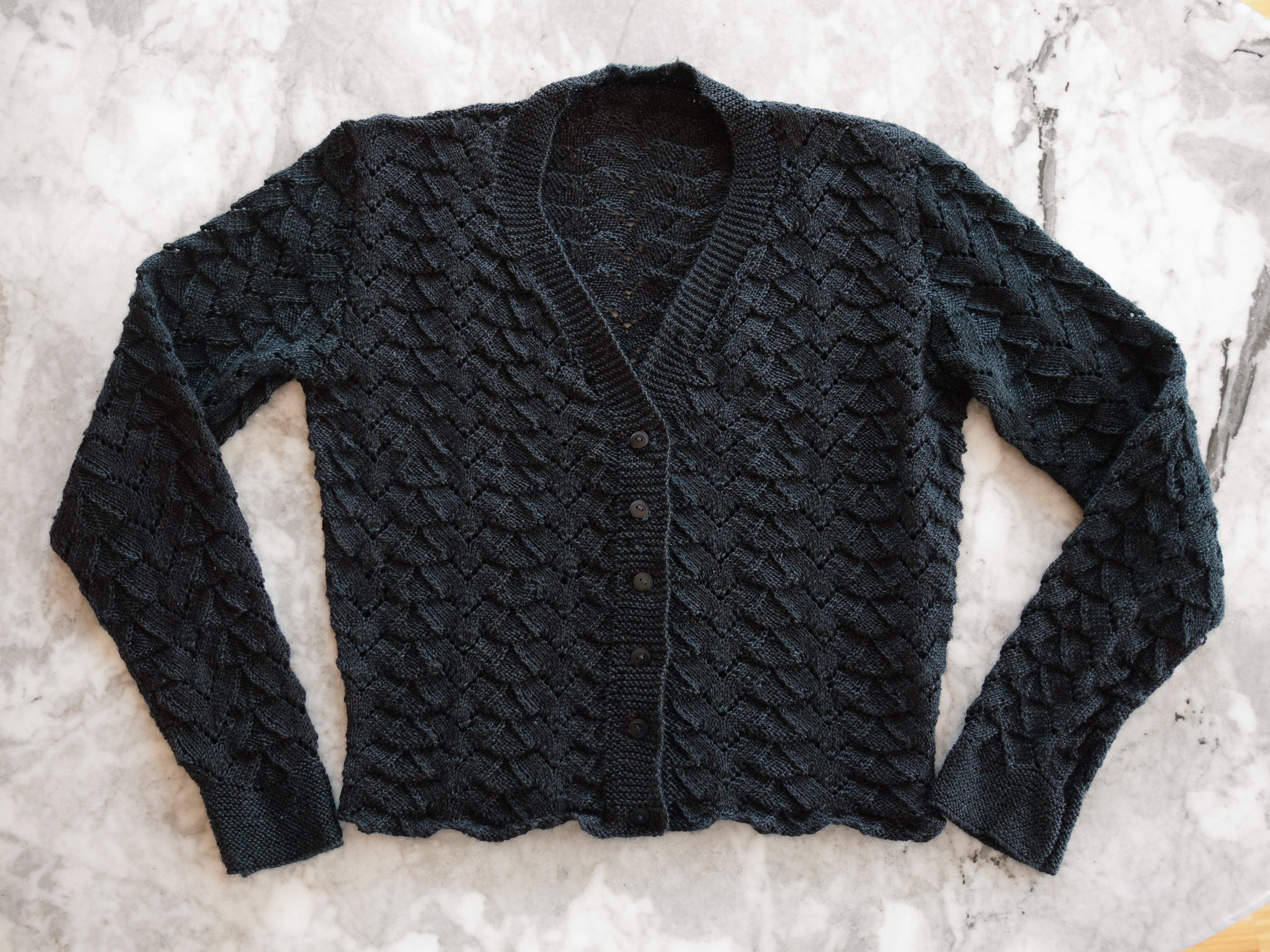 My buttonhole spacing on the cardigan was off, so I ended up sewing most of the holes closed ad carefully cutting new ones after backing the bands with ribbon (a common practice at the time, especially on tight-fitting cardigans, to keep the bands from stretching out and gapping across the chest.)