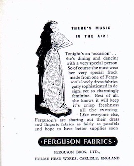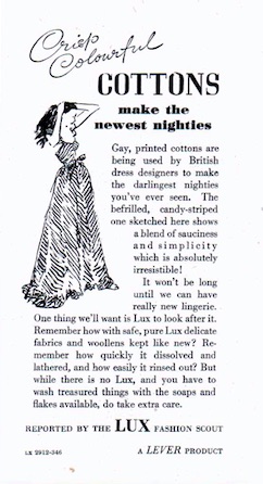 The influence of rationing can be seen in almost every aspect of 1940s issues of Stitchcraft: occasionally titles of designs, such as this one, but more often in recipes and advertisements. These two, from the pages of the 4-coupon pattern, promise that the company in question is “sharing out their dress and lingerie fabrics as fairly as possible” and reassure that “it won’t be long until we can have really new lingerie” (lace and frills were banned, and nylon was needed for parachutes et. al., hence the plain, home-sewn cotton nightgowns).