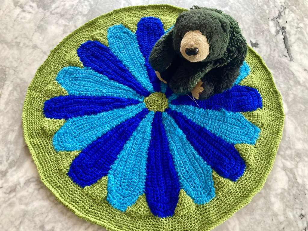I wash-blocked the blanket, which evened it out some more, and only then realised that I had forgotten to embroider the lines down the center of each petal. In the end, I decided against it. The dark blue and green yarns were all used up, I didn’t have any other colour that looked right and I honestly thought it was fine the way it was. The finished size is 23 1/2 inches or 60 cm in diameter, which will fit a baby’s pram nicely. Not having a baby on hand, here it is with a teddy bear for scale: