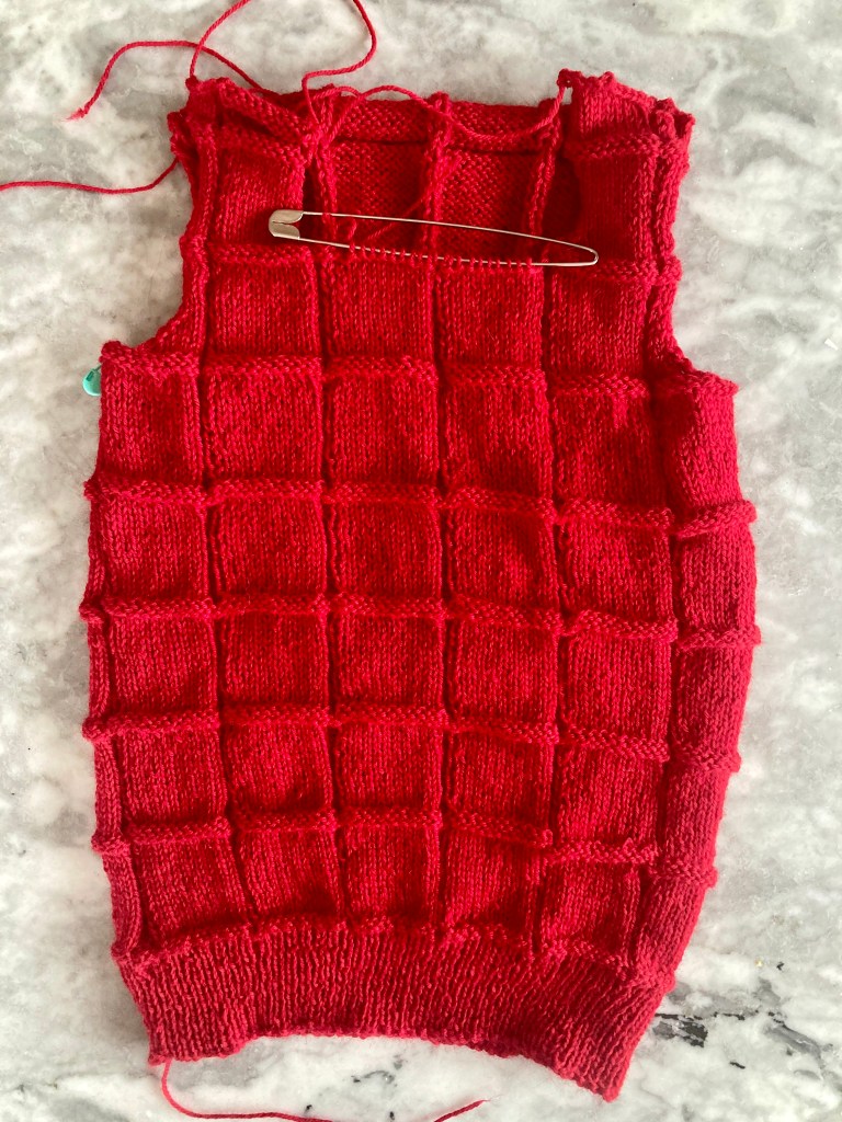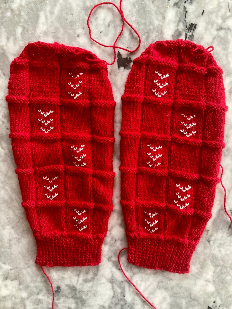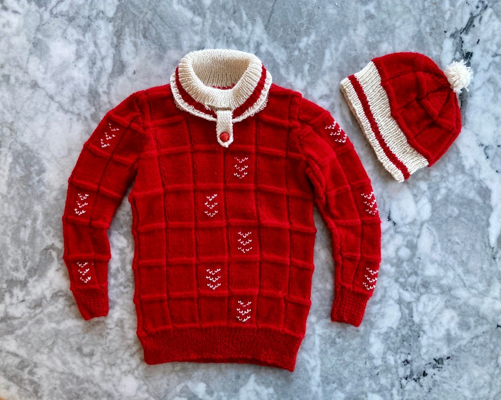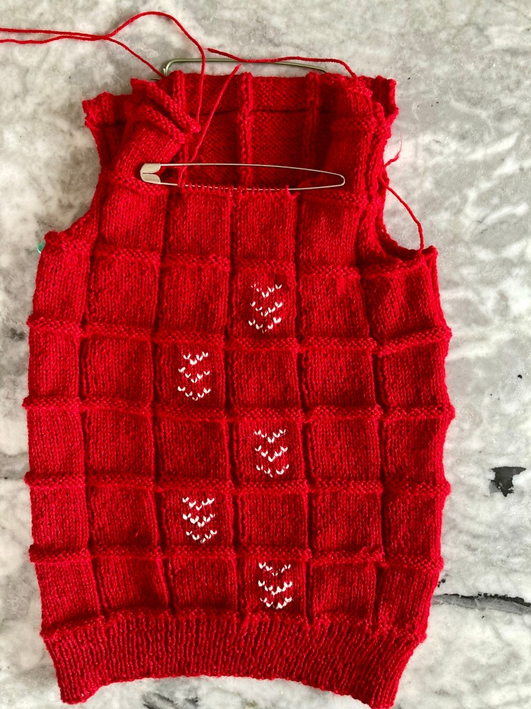 This month’s issue had a wonderful winter pullover for a larger child, featuring white “Swiss darning” (a.k.a. duplicate stitch embroidery) on a brilliant red background. I had also promised a friend to knit something for her toddler, whose favourite colour is red. Perfect!