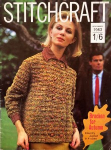 The autumn months are always the best for knitting magazines, with a mixture of heavy garments for colder days, easy-to-make holiday gifts, warm accessories and a few glamorous items for parties. Stitchcraft‘s November 1963 issue puts the focus on “warm family fashions… with the emphasis on colour and attractive textures that are interesting to knit and very becoming to wear”. There’s something for family members of every age and “for the petite to the not-so-slim.” The homewares and little projects are quick and fun to be finished in time for holiday decorating and/or gift-giving.