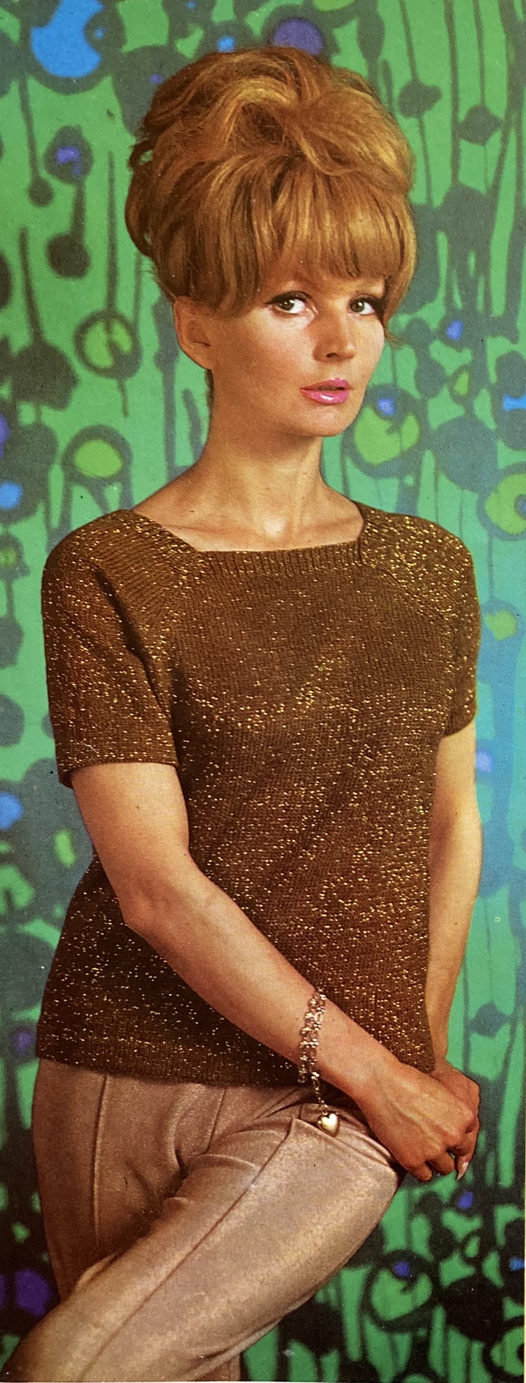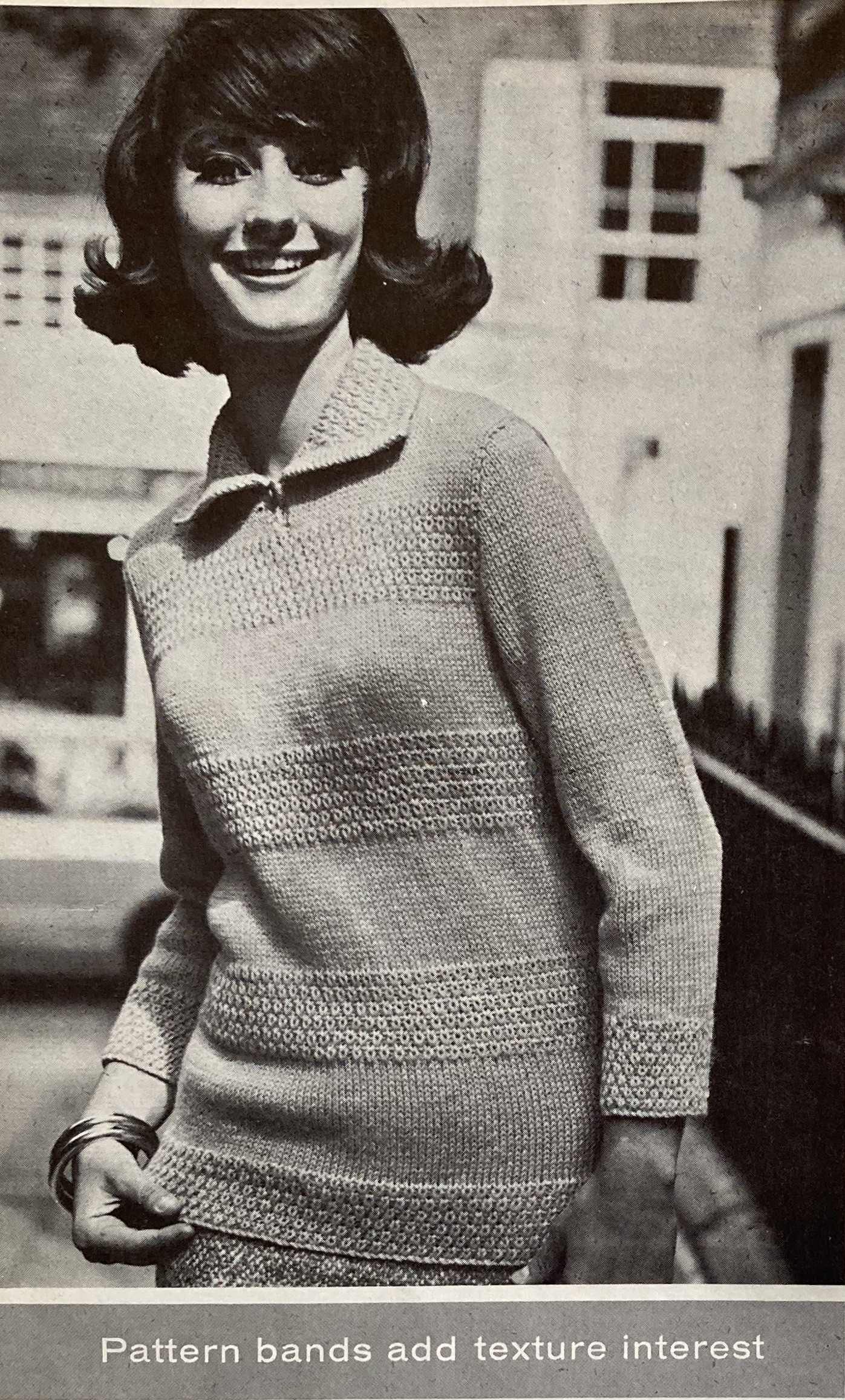 The “country jacket” on the cover continues the tweedy, variegated colour effect in fashion this fall, using Bracken Tweed wool for the main body and Totem DK for the collar and cuffs. I finally know what colour Totem “Oakapple” is! The other women’s outdoor-wear fashions include a zip-neck sweater with textured pattern bands in turquoise, an “overpull” with cabled neckline in flecked “Cantaloupe” colour (sadly, no colour photo, I have no idea how it looked in real life) and a simple brown top made glamorous by knitting the wool (Cameo Crepe 4-ply) together with a strand of sparkly Lurex thread. There’s also a warm, soft cape for winter reading in bed, knitted sideways in an easy zig-zag pattern. Aside from the green and white bedcape, shades of autumn brown as well as bold blues and red are the season’s trendy colours. Stripes, zig-zags and textures complete the Autumn 1963 look.