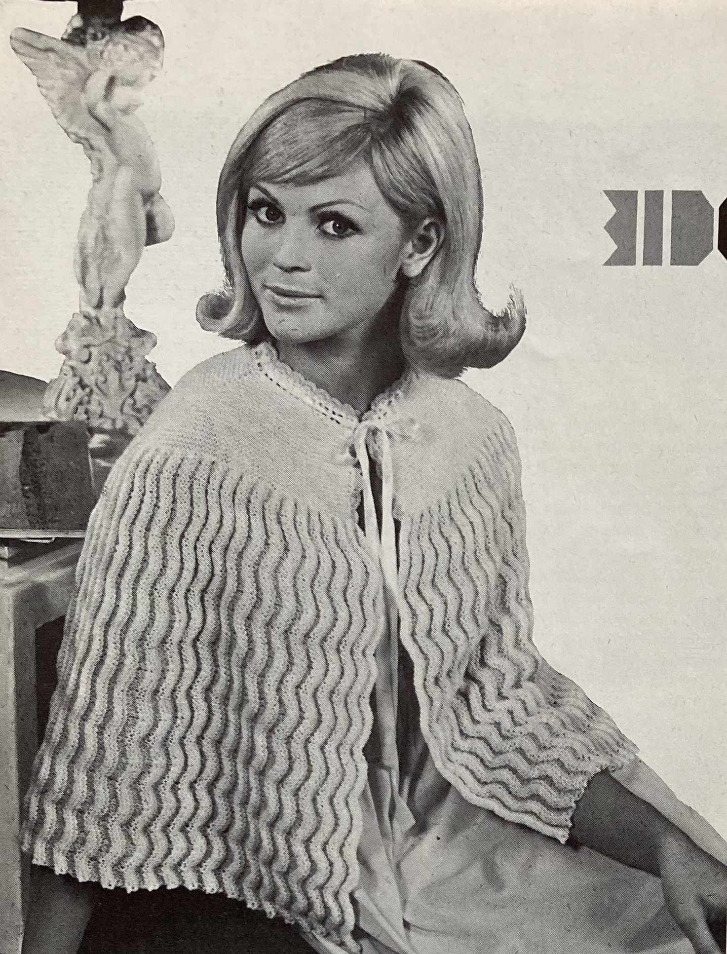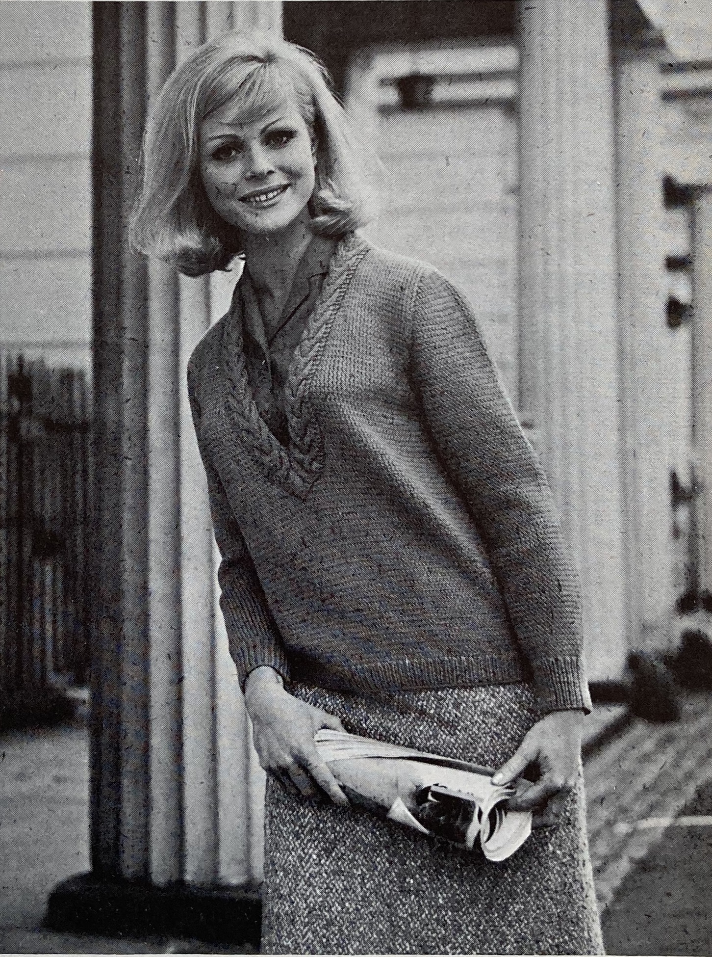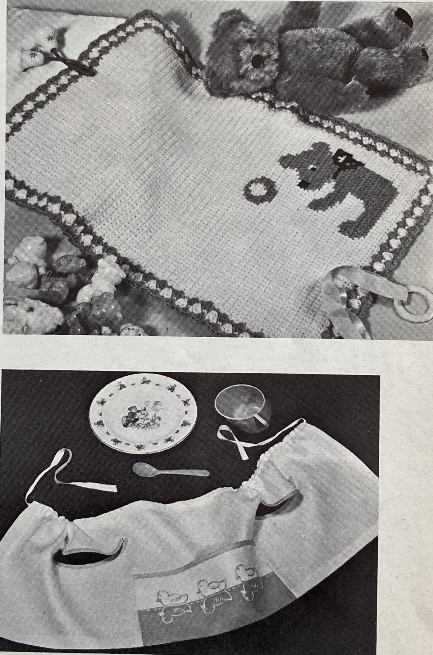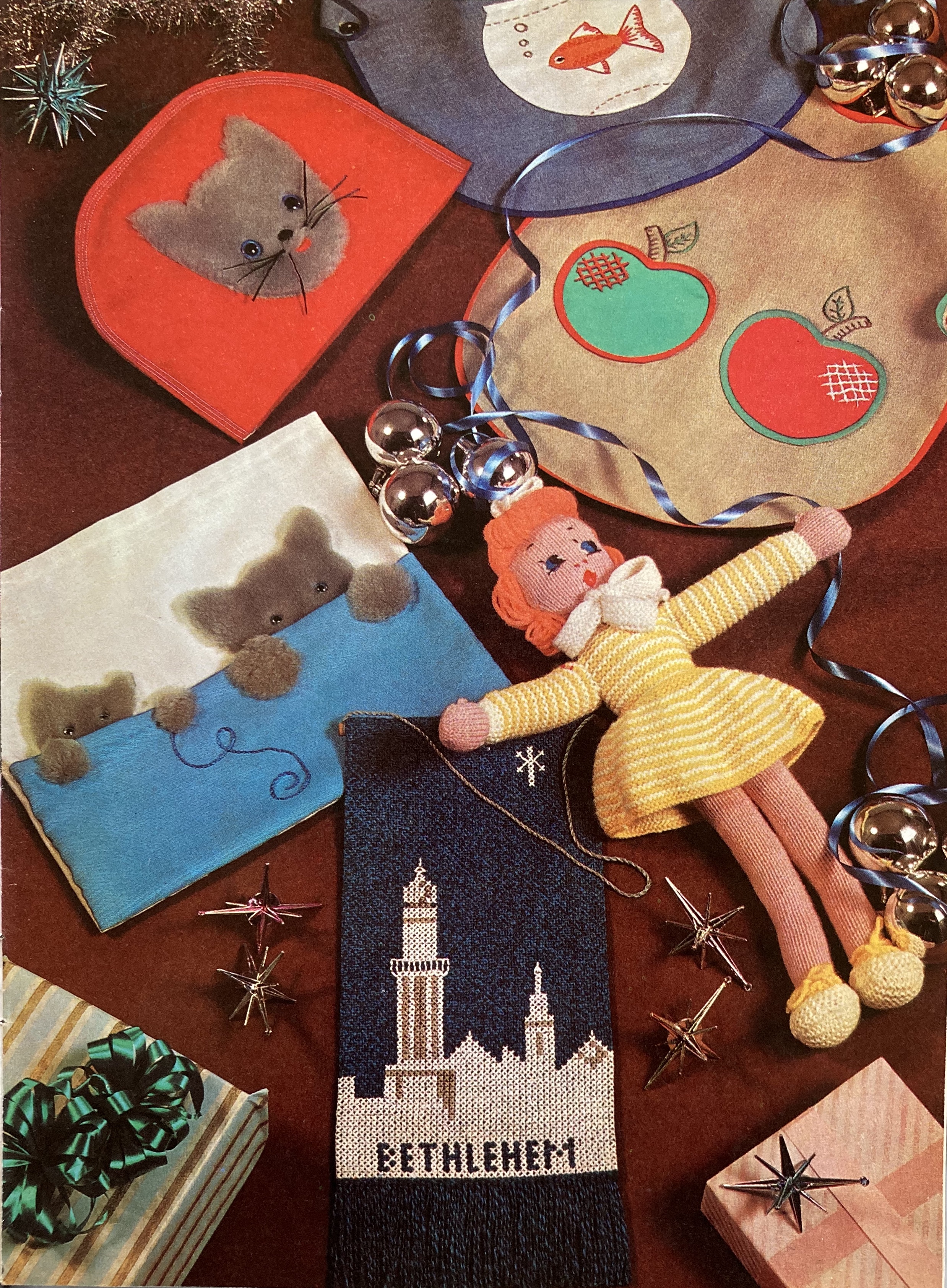 School-age children get their own “tough, tomboy sweaters” in Bracken Tweed wool. The suggested colours are “Black Olive” or “Gorse Heath”, which I assume is a sort of green-yellow tweed (no colour photo). Babies get a lovely shawl to match the layette from the September and October issues. It’s easy to knit, as the centre and borders are made separately. The other baby/nursery-age items are crocheted, sewn or stitched: a pram cover with a teddy-bear motif, a little nightcase with fluffy appliquéd kittens, a knitted doll, an embroidered “feeder”, sewn and appliquéd pinafore smocks…