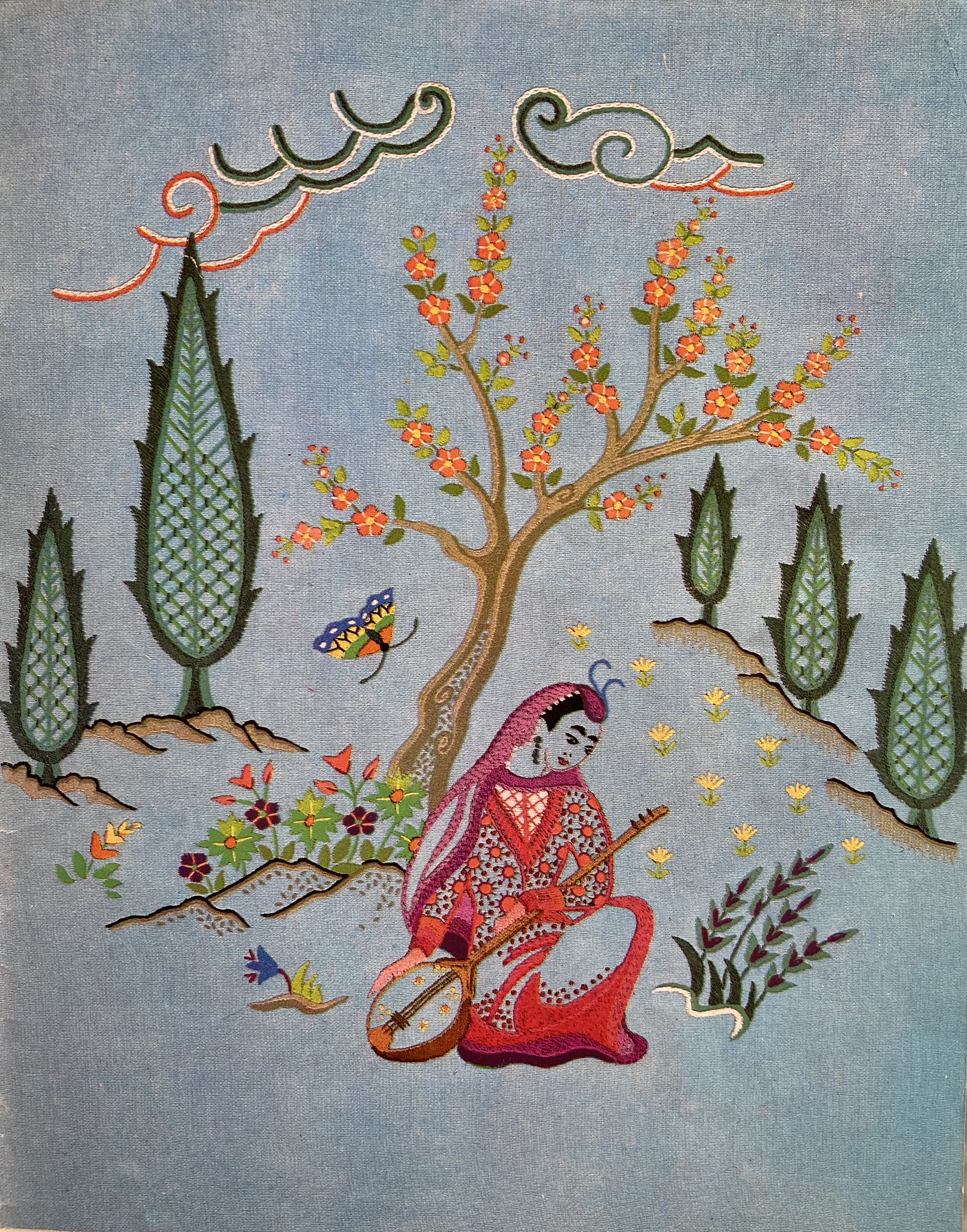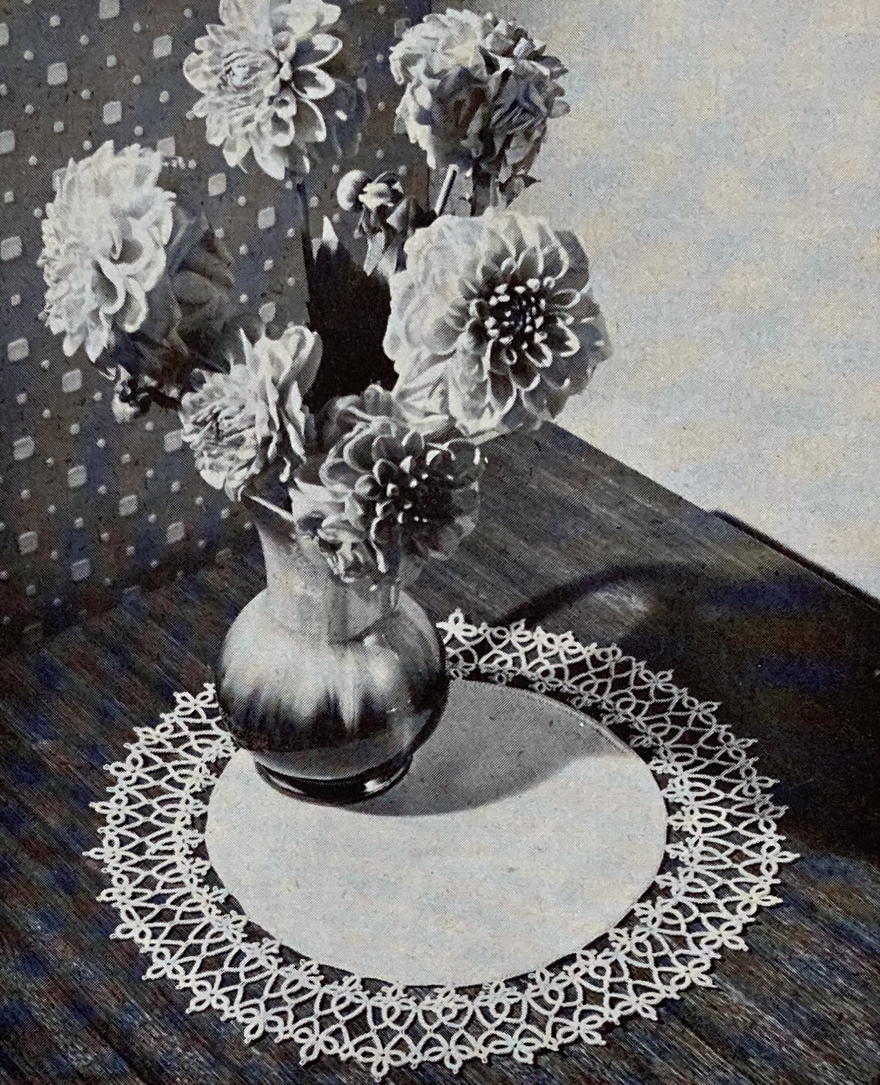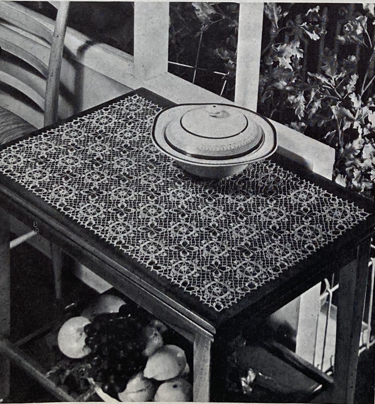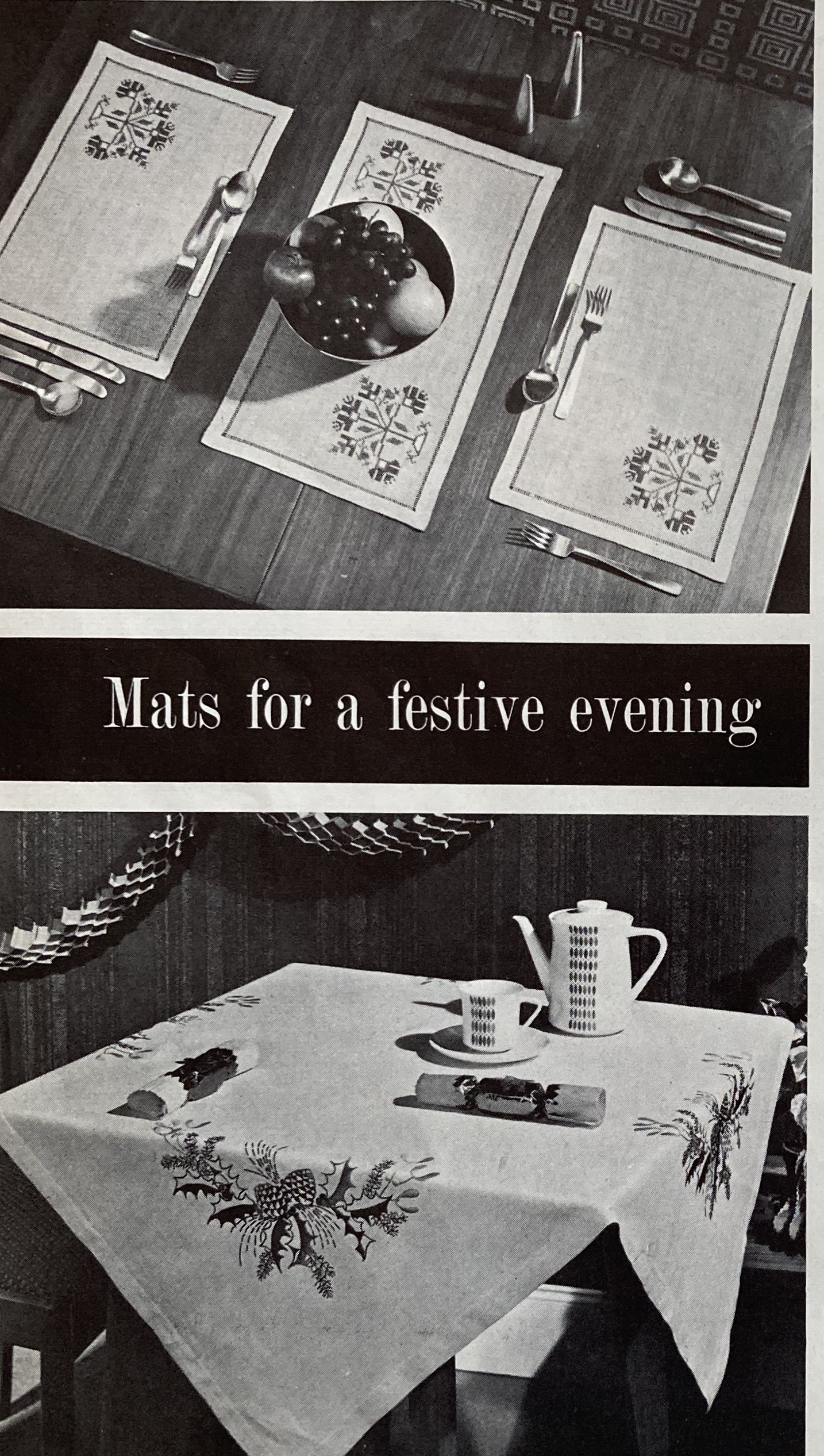 With all this bounty, the homewares are mostly standard: embroidered table mats and a Christmas-design tablecloth, a decorative panel with the Star of Bethlehem for more religiously-minded households, and a very impressive tatted doily and crocheted trolley-mat. The show-stopper is a lovely decorative panel “taken from a book of Oriental designs” embroidered in Filoselle silk on linen. (The design is allegedly of Persian origin, though of course neither Stitchcraft nor its typical readers of the time gave much thought to questions of authenticity, nomenclature, exoticism or any related issues that we would regard and discuss today.) It is a pretty picture in any case, and was probably not too difficult to embroider, consisting mostly of standard seed and straight stitches, French knots, and so on.