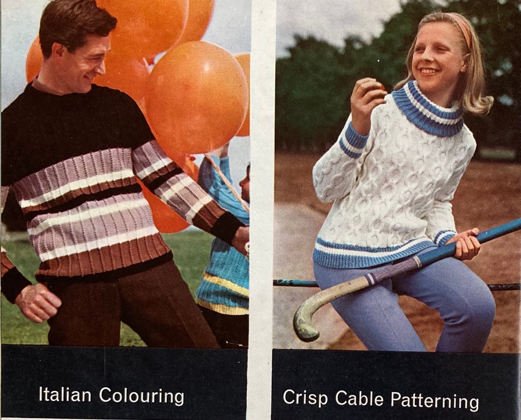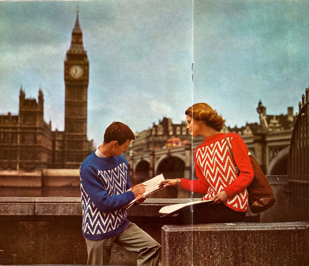 Men’s fashions are just as colourful as the women’s, or even more so (less use of plain brown…) and show more of the zig-zag trend. Here are some bold designs for “him and her” using bulky Big Ben wool (and photographed in front of…). The construction is the same for both, with the smaller design for bust sizes 33-35 inches and the larger for 39-41 inches, with the advice that “Plumper girls could follow his size”. The man’s pullover in “Italian colouring” uses stripes and textures, toned down by the use of more neutral colours. The blue-and-white cabled sweater in the photo next to it is for teenagers.