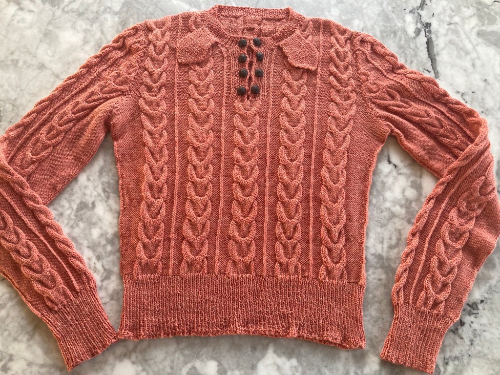 As most patterns of this era, there is only one size given, for 34 inch bust. I calculated out a somewhat larger size using a percentage multiplier (no. of sts x 1.05) and just added the extra stitches onto the reverse stocking-stitch base that extends on the sides. I also added 2 patterns to the length and 2 patterns to the sleeve length.