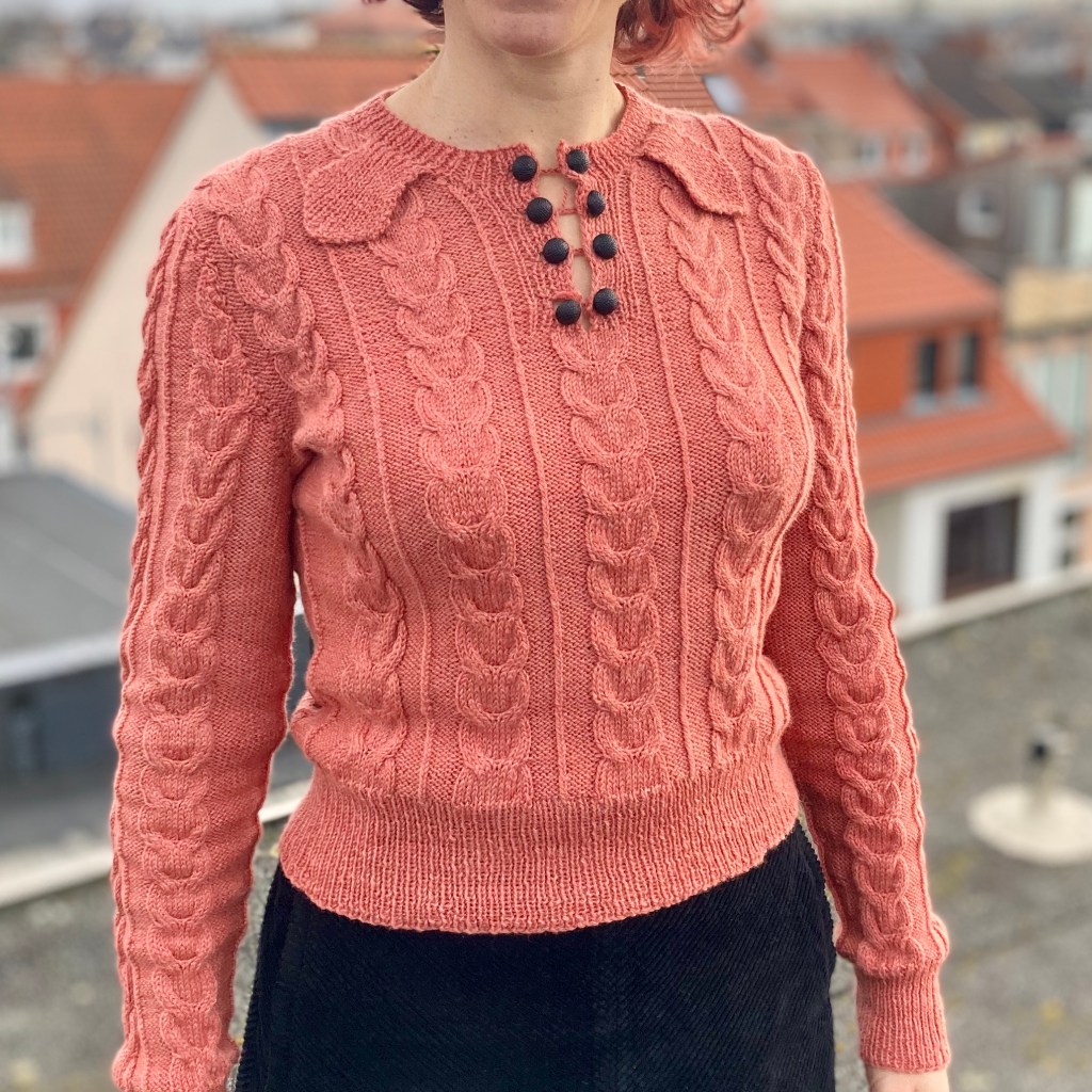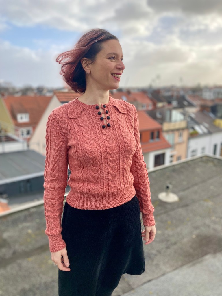 I particularly love the little design details of this pattern: the mini-rib lines (just ktbl on a reverse st st background) dividing the cables, the funny tabs at the neck and the double buttons (attached together with a crochet chain.) I could make the chains a little shorter to make the placket line up straight.