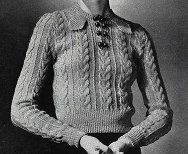 From what I can see in the Ravelry database, Spool Cotton Company patterns were primarily for accessories and homewares crocheted in cotton (as one might expect with a brand named “cotton”). The leaflet which contained “Clarel” was entitled “New Knitted Fashions”, with coats, dresses and suits as well as knitted blouses, and was inspired by British fashion of the time (though “fun to knit because of their easy-to-follow American instructions”.) Apparently they were written to be used with Red Heart yarn.