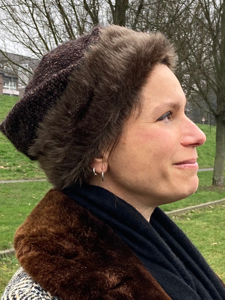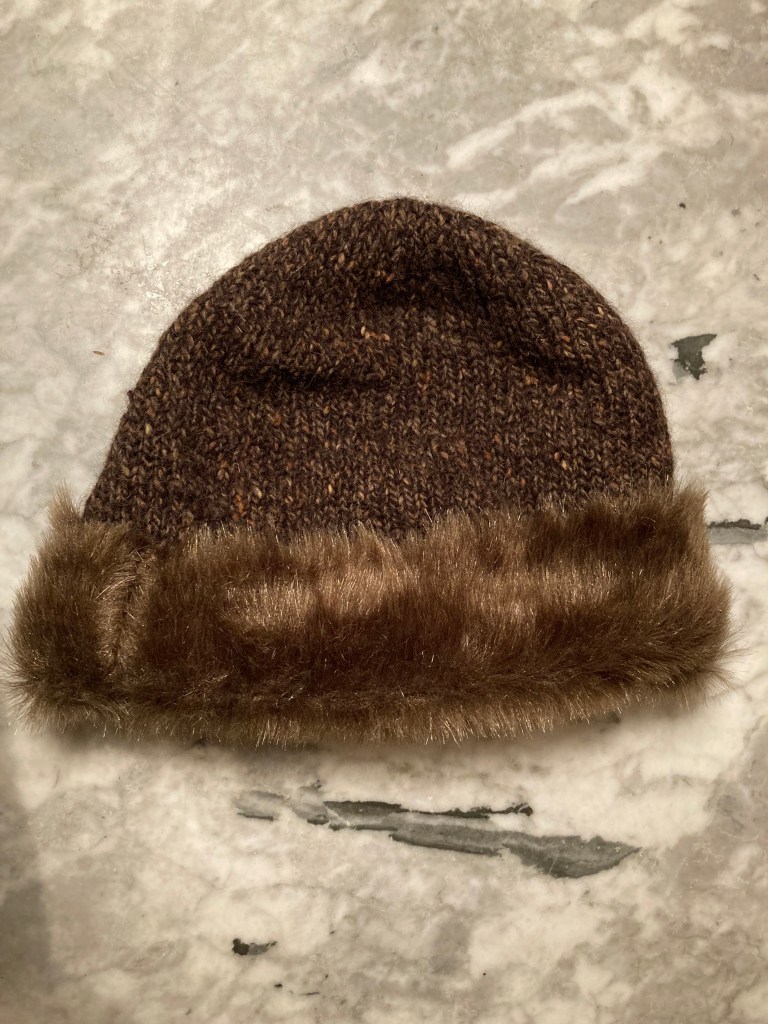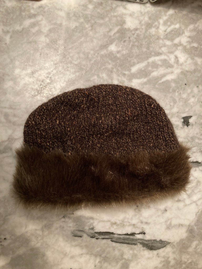 I made this hat for a friend’s daughter, but I would gladly make another for myself. It’s warm and fun and looks very, very 60s. I wore it for the photo with a coat inherited from my grandmother which also features a dramatic plush “fur” trim. (Sadly, the sleeves are way too short for me. They are also plain wool, and every year I search for a plush fake fur that matches the collar, so that I can make matching cuffs. I never, ever find this right colour and degree of plushness, but am considering using the same fake fur from this project, since it’s the closest I’ve ever found).