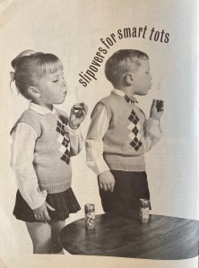 My March project was a cute slipover (vest, sweater-vest, tank top, pullover or whatever you call a knitted over-shirt garment with no sleeves and no front opening) for “tots with a fashion sense.” The tots in the photo definitely look very smart and very 1960s, with the little girl in her tiny micro-miniskirt and the boy sporting a bow tie.