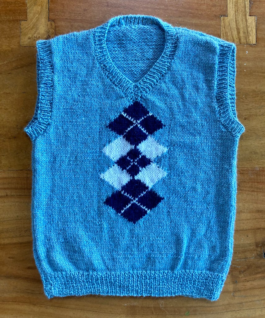 I used modern sock yarn (Meilenweit by Lana Grossa), an 80% wool / 20% polyamide mix which comes pretty close to the original Nylox yarn, and kept the original colour scheme of light blue with the diamond motif in white and navy, so this project was quite authentic to the original. The only change I made was to lengthen the body somewhat to fit the intended wearer, who is on the taller side for his age.