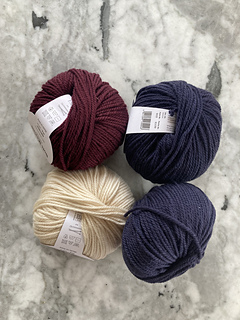 The pattern, from 1923, is written for Bear Brand Bucilla wool in stripes of fawn and brown, with additional contrast motifs in “Henna”. My friend did not want a beige and brown cardigan but did want a period-appropriate colour scheme, so we settled on navy blue and white with burgundy-red contrast, a popular “sport” combination of the time. My yarn was “Soft Merino” by Wolle Rödel, a very normal, easy-to-knit-and-care-for DK 100% wool.