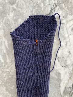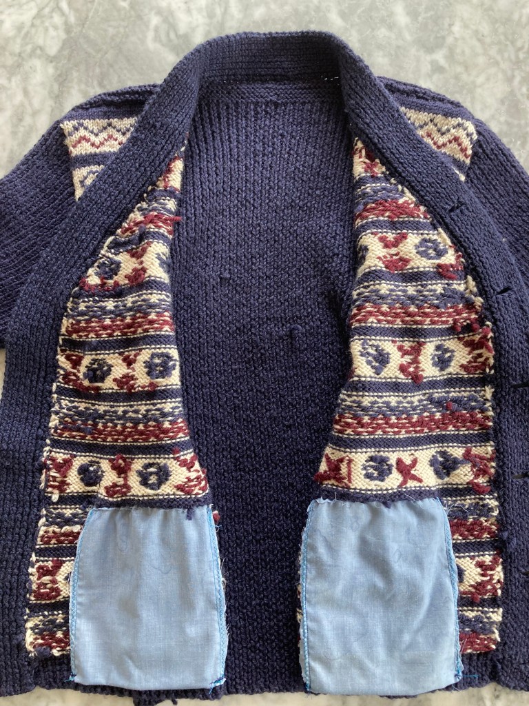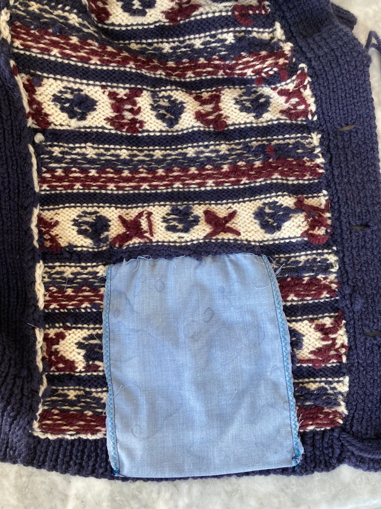 For a final surprise, the pockets are not knitted, as I am familiar with from 1950s and 1960s pocketed garments, but made of “some strong fabric” and sewn in. Thinking along with the sportswear theme, that makes sense if you are going to put a heavy golf ball in your pocket — a knitted pocket would sag under the weight, but the woven fabric (I used a bit of cotton-poly ex-pillowcase from the upcycling drawer) keeps its shape nicely. The pockets were made extra large by request and it was surprisingly difficult to sew them in place, but they turned out fine.