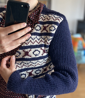 The sleeve cap construction was fascinating. Because the back is done entirely in ribbing and the front in flat colourwork, the front and back pieces have a naturally different shape above the armhole even though the bind-offs and decreases are symmetrical. The sleeve cap accounts for this by casting off three stitches every other row on the front-facing sleeve side and one on the back sleeve side. That made a very lopsided sleeve cap which fit perfectly into the lopsided armhole. Wow. I would never have thought of designing a sleeve cap like that, but it makes perfect sense and produces a very neat, squared-off shoulder.