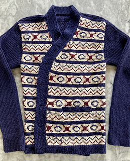 The pattern was full of surprises, starting with the back, which is knit entirely in single-colour 1×1 ribbing. It is consequently very narrow, much more so than the wearer’s back, but stretches with movement. I was convinced it would make the cardigan too tight, or make the bands gap too much in the front, but the ribbing has enough “give” that it works out perfectly with the flat-knit Fair Isle fronts. The overall effect is sleek and slim-fitting, but allows for plenty of easy movement — I can see why it was intended to be worn for playing golf or other sports with lots of upper-body movement.