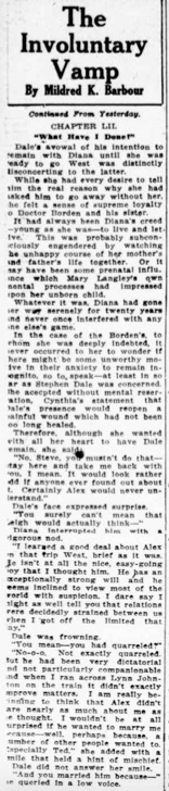 And that was that! The story, by the way, was “The Involuntary Vamp” by Mildred K. Barbour, published in 1921 in the Washington Herald, and concerns itself with the adventures of young Diana Langley, who was “cursed” by her aunt Marjorie with the “gift” of “lure” — all the men are after her, but the only one she really wants (Stephen Dale, an older friend of the family) cannot marry her, as insanity runs in his family. So she marries another man out of spite, jumps off her honeymoon train in the southwestern U.S. desert with a different man, gets semi-kidnapped by yet another man, gets away and finds sanctuary with yet another man (and his sister) who we later find out is responsible for the whole hereditary insanity situation… or non-situation, as it turns out (did I mention that the plots of these stories are often ridiculous, but thoroughly entertaining?) and then has more adventures before being united with Stephen Dale, who is actually quite mentally healthy and was in love with her the whole time. Diana’s first-husband-out-of-spite has meanwhile conveniently died, leaving the happy couple free to marry!