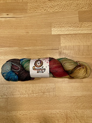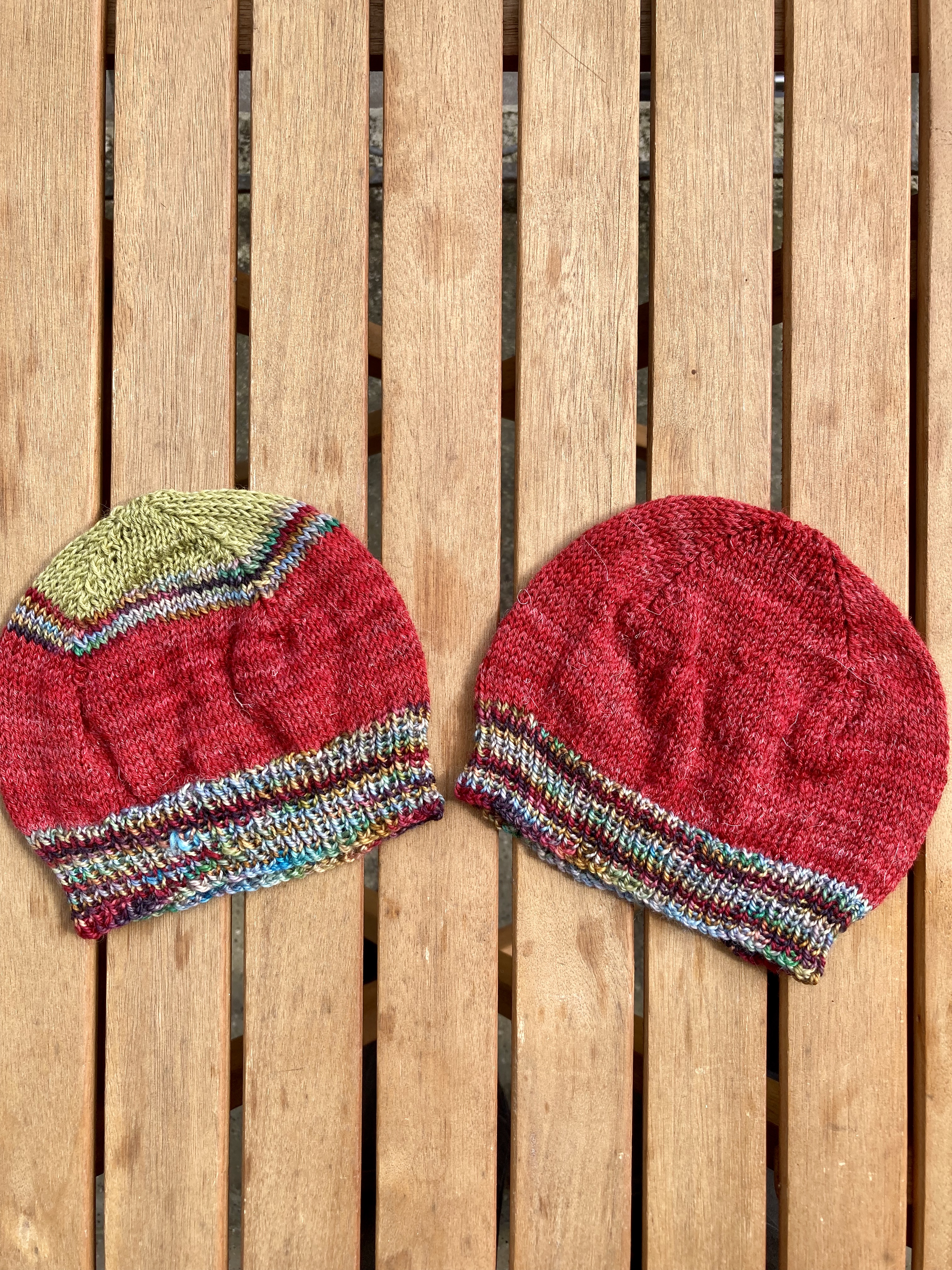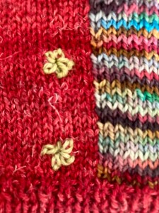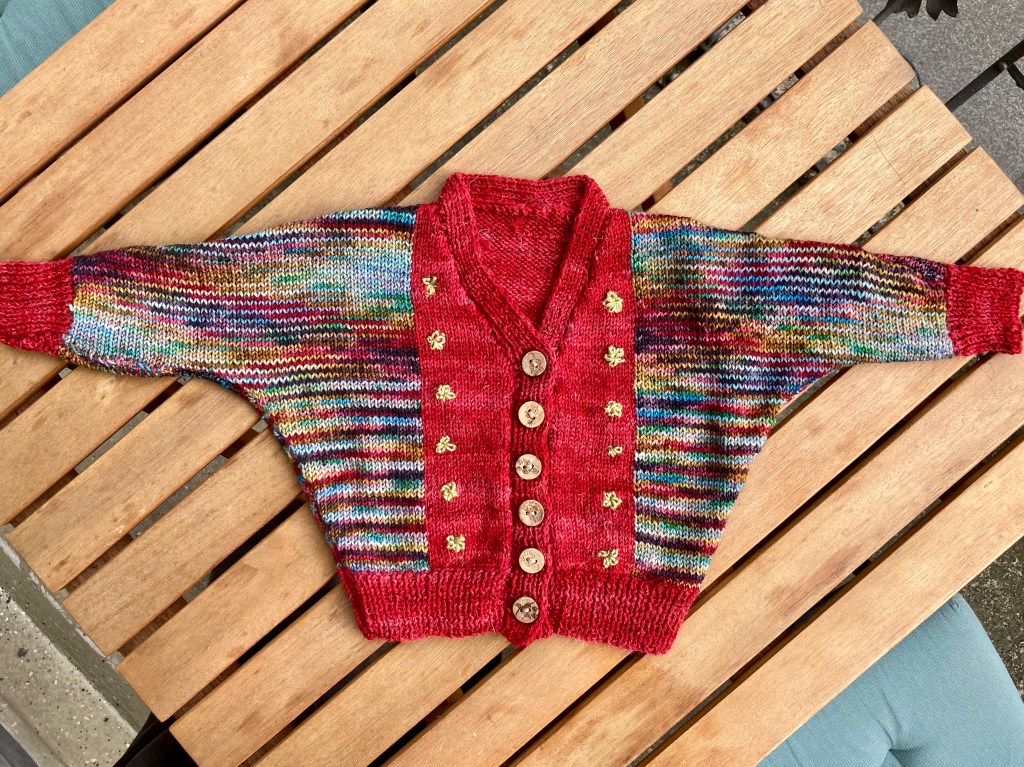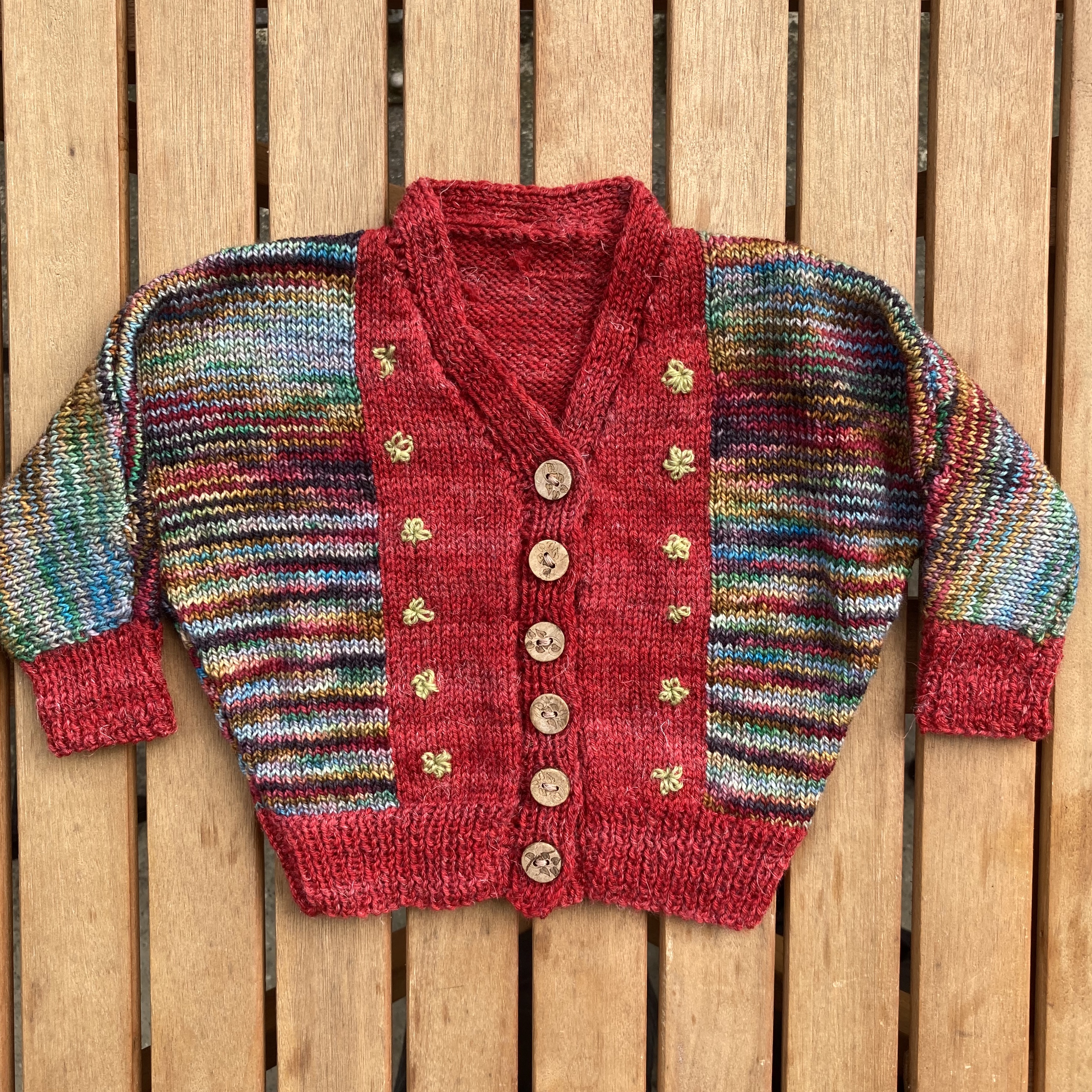 One 100 gram skein of the multi-colour wool and one 50 g ball of the red were enough to make this cardigan, another “fraternal” cardigan (plain crew-neck with set-in sleeves) made without pattern using the multi-colour yarn for the body and the red for the sleeves and ribbing, and almost two hats with multi-colour ribbing and a red body. The crown of one hat was finished in the green Onion sock, which I also used to embroider two larger flowers near one shoulder of the no-pattern cardigan.