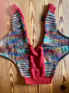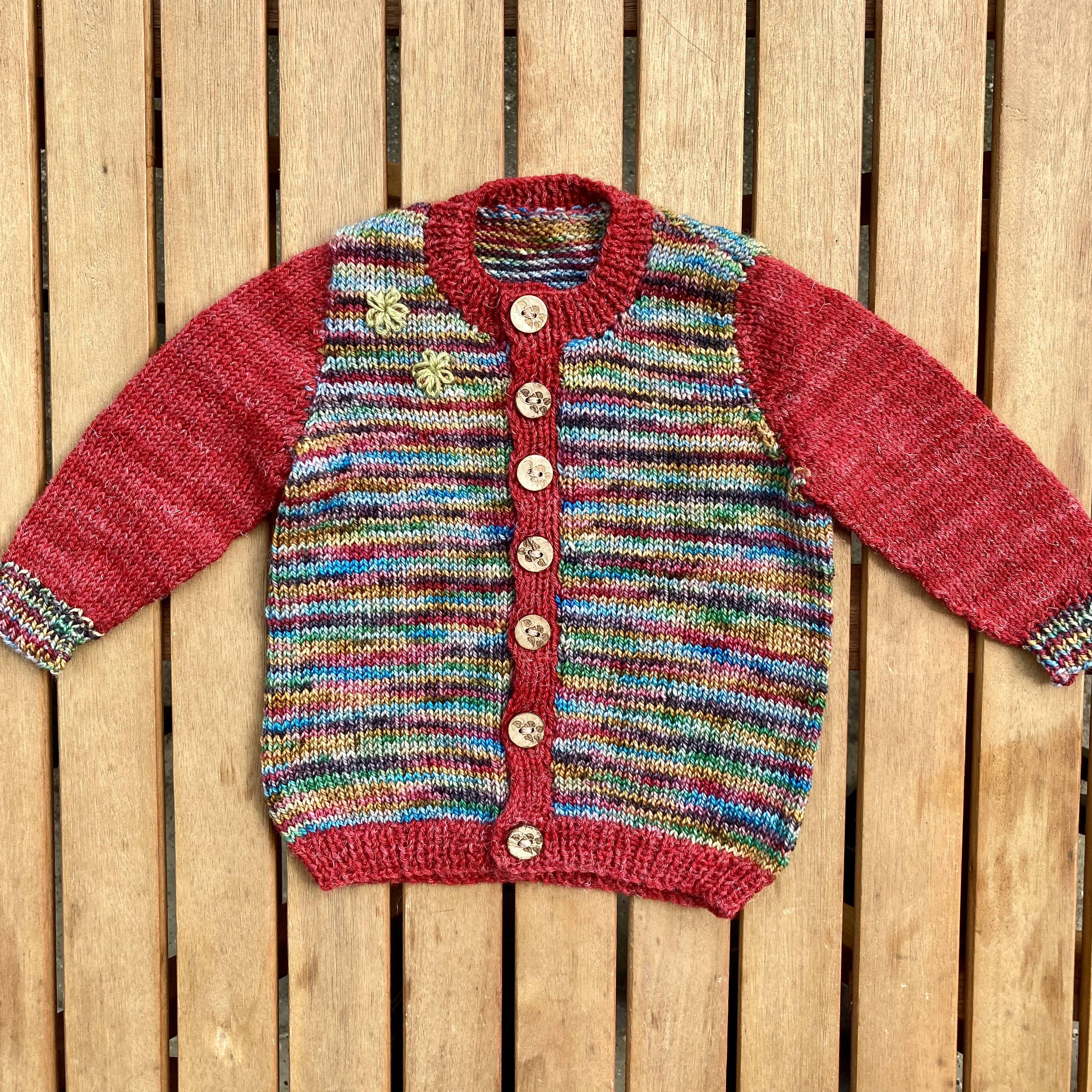 The pattern calls for Patons Beehive 3-ply Baby Wool at a tension of 8 stitches to the inch for a cardigan that is 19 inches around the underarms. My wools were Becoming Art Cielo fingering in the colour combination “Carousel” (multi) and Schöppel Admiral Hanf in red — admittedly not a very vintage colour combination or standard baby-pastel, but I like knitting bright colours for babies, and the mother’s favourite colour to wear is red, so I loved it.