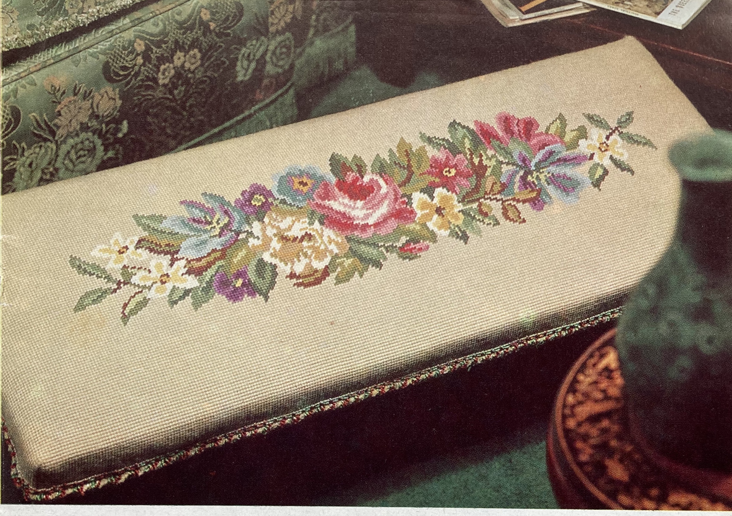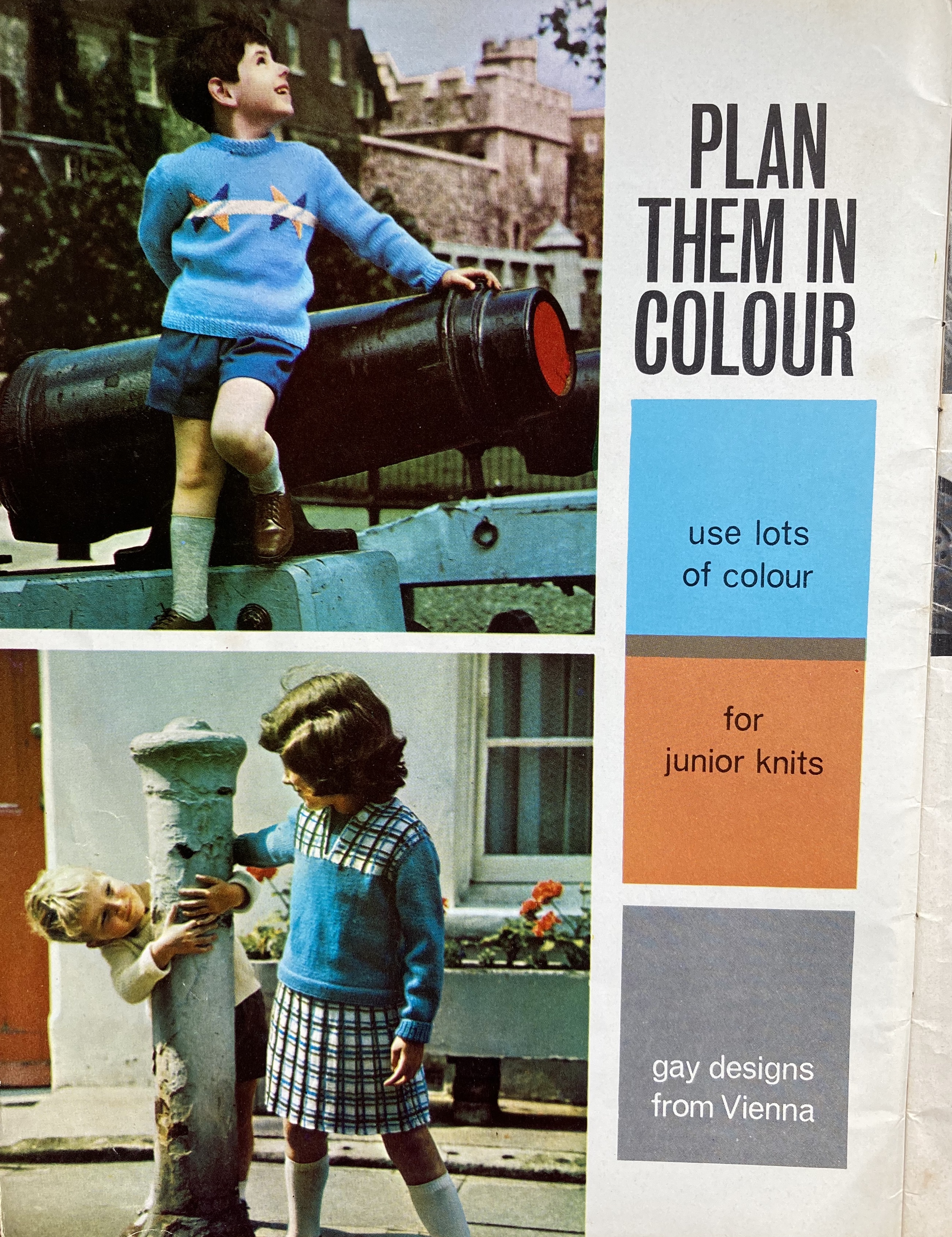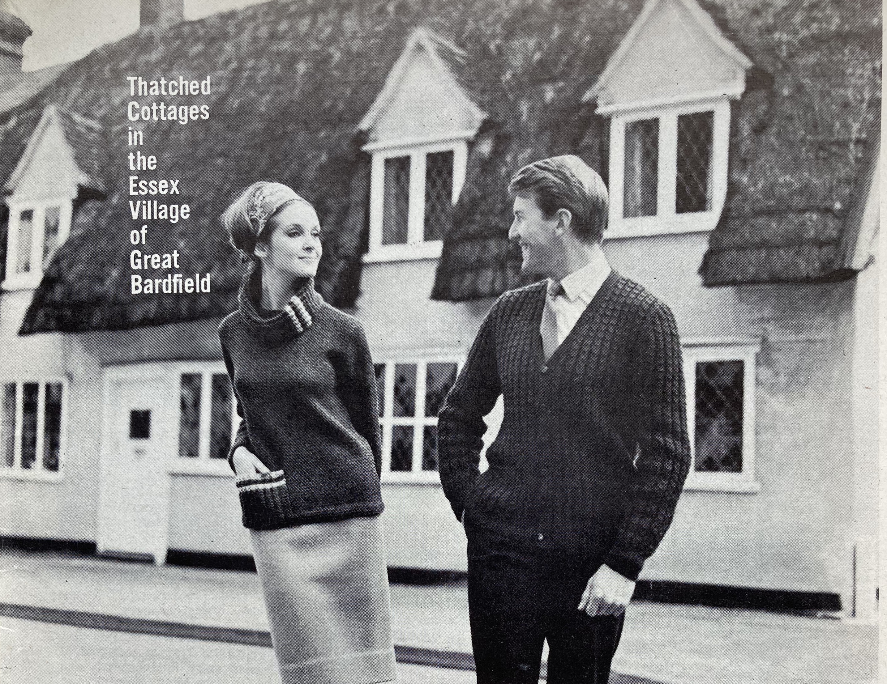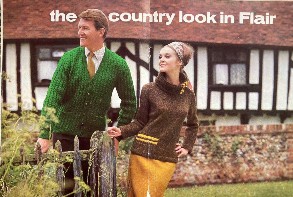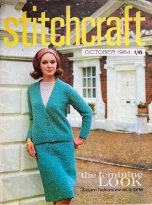 October is the start of the best season for knitting, and the October 1964 issue of Stitchcraft rose to the occasion with multiple themes and more colour pages than ever before (photographed in the villages of Great Waltham and Stebbing in Essex). There are knit designs for “him and her” as well as for different ages of babies and children, embroidery, tapestry, rugmaking and appliqué projects, “novelties” and even a few extra tidbits in the back “Readers’ Pages.” Shall we… fall in?