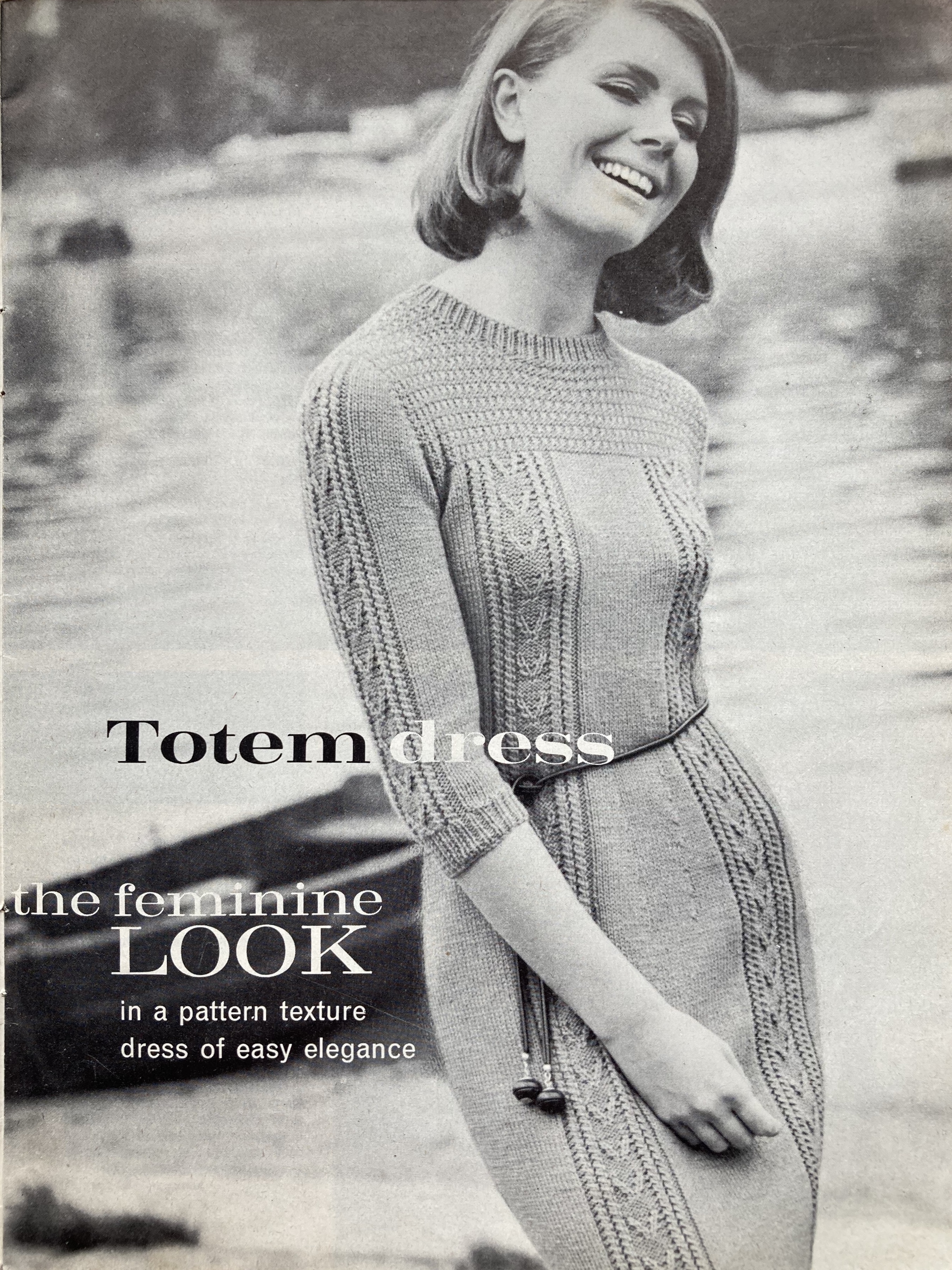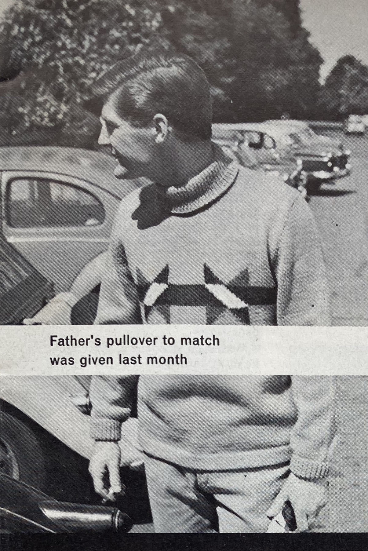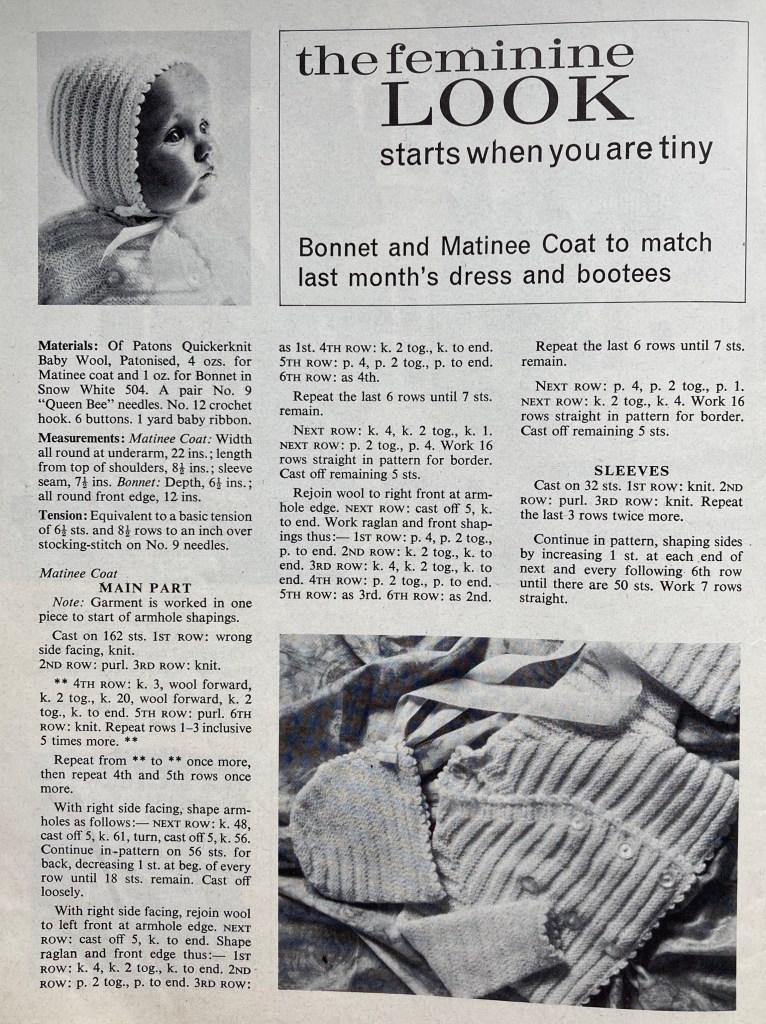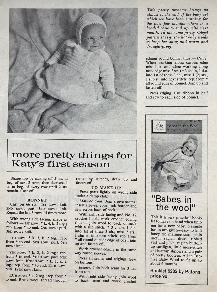 Continuing the baby-outfit series from the previous months’ issues, the (girl) baby of the family gets a bonnet and matinée coat. “The feminine LOOK starts when you are tiny” — i.e. get used to having cold legs now! The set is certainly pretty, and there’s a very practically placed ad for a Patons’ baby-pattern booklet, “Babes in the Wool” on the page as well.