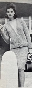 In any case, the cover-photo suit with coordinating jumper for underneath is simple and elegant, and probably quite comfortable to wear. It’s made in still-popular nubbly Rimple wool in DK weight and a slightly tweedy shade of light blue. The jumper is made in fingering weight and has a diagonal pattern.