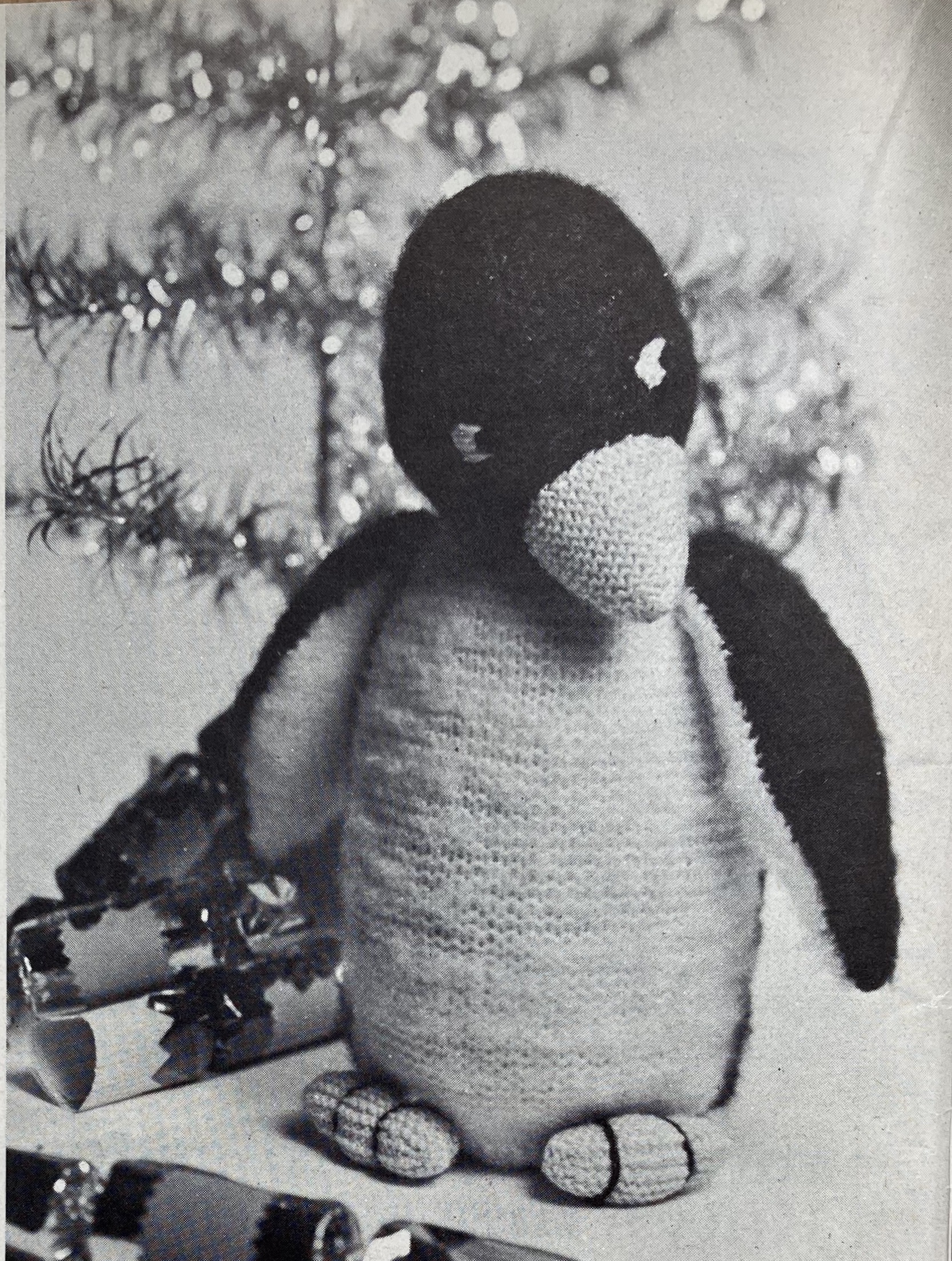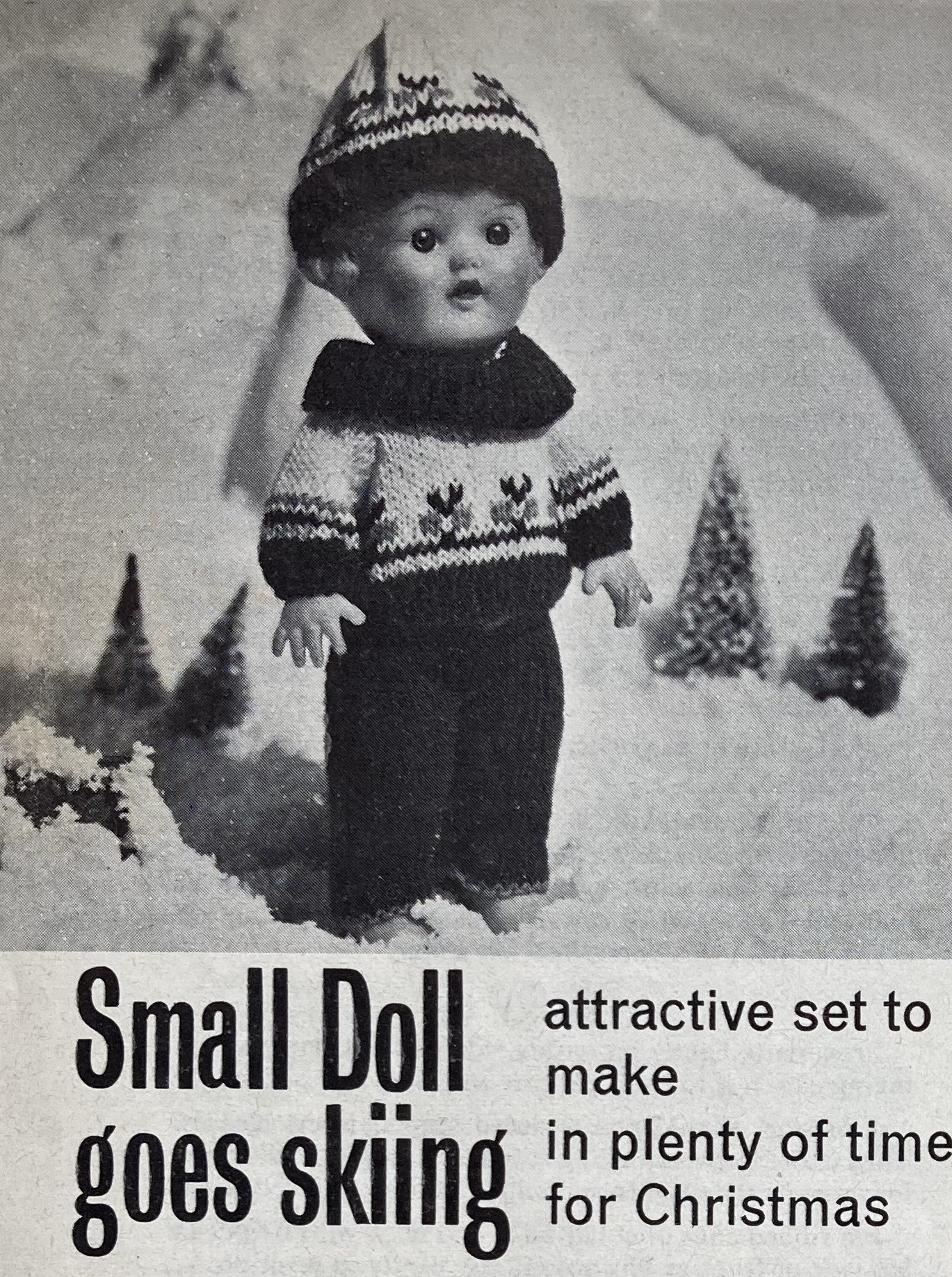 And don’t forget the “novelties”, which are not quite as weird in this month’s issue as we have seen in other issues. There’s a little stuffed penguin toy with very funny feet, and a night-case in the shape of a knitted duck. There’s also a winter ski set for a doll, with ski-pants and a warm stranded pullover and cap. (If the doll looks a little worried and not quite warm and comfortable, it’s probably because it’s standing barefoot in the snow.)