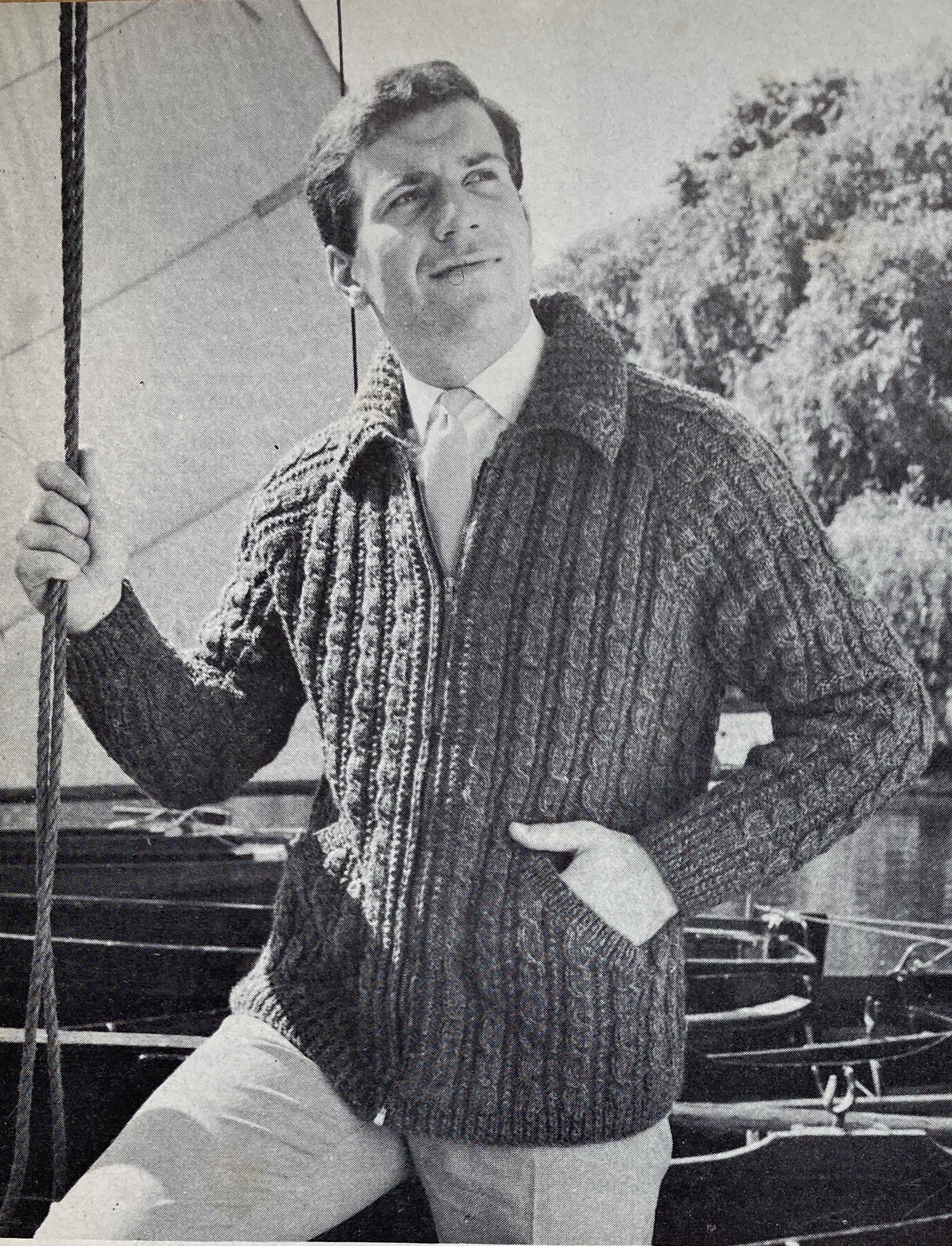 The women’s “feminine” fashions include a great cable-pattern dress as well, in smooth, DK weight Totem wool, and a less “feminine”, but probably very cosy, roll-collar pullover with an aysmmetrically-placed pocket. The mock-cable pattern on the pocket and collar is used as an all-over pattern on a man’s classic V-neck cardigan, and there’s another man’s cardigan as well in a very similar design, with “real” cables, a zip fastening and in bulky Ariel wool.