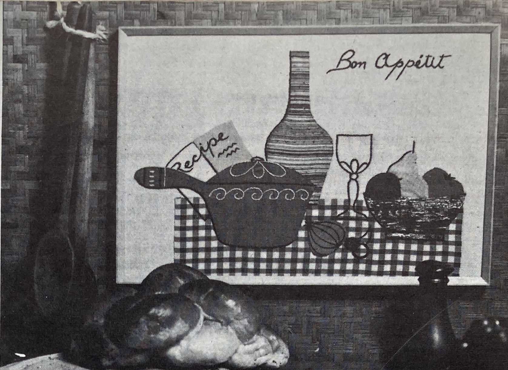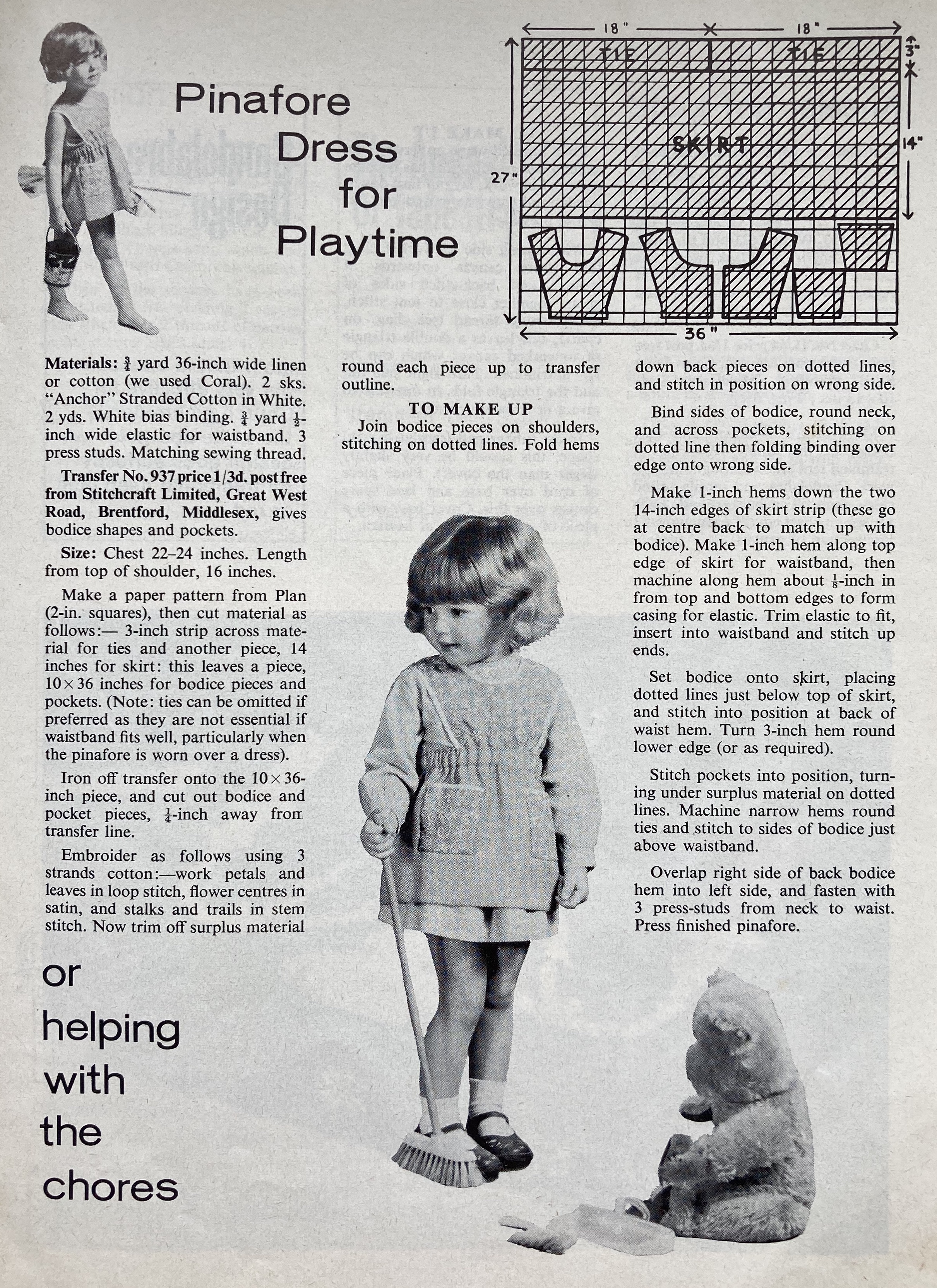 … and an appliquéd wall picture with a “kitchen”-themed design. Do I have terrible taste if I admit that I love this wall hanging? It’s utterly kitschy and very 1960s! There’s a little sewing design as well, for a child’s pinafore smock… “for playtime or helping with the chores.” Beware, little girl, that feminine look comes with its own designated activities.