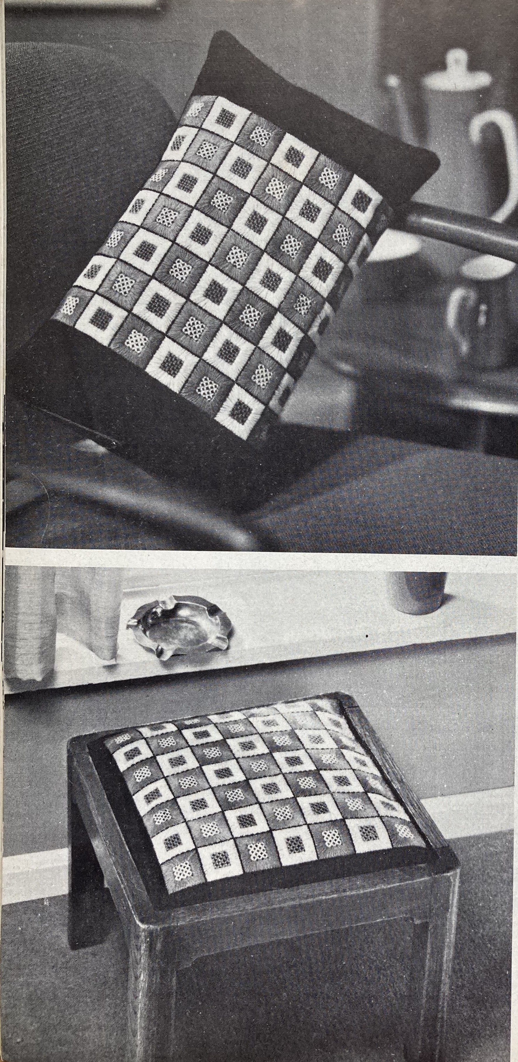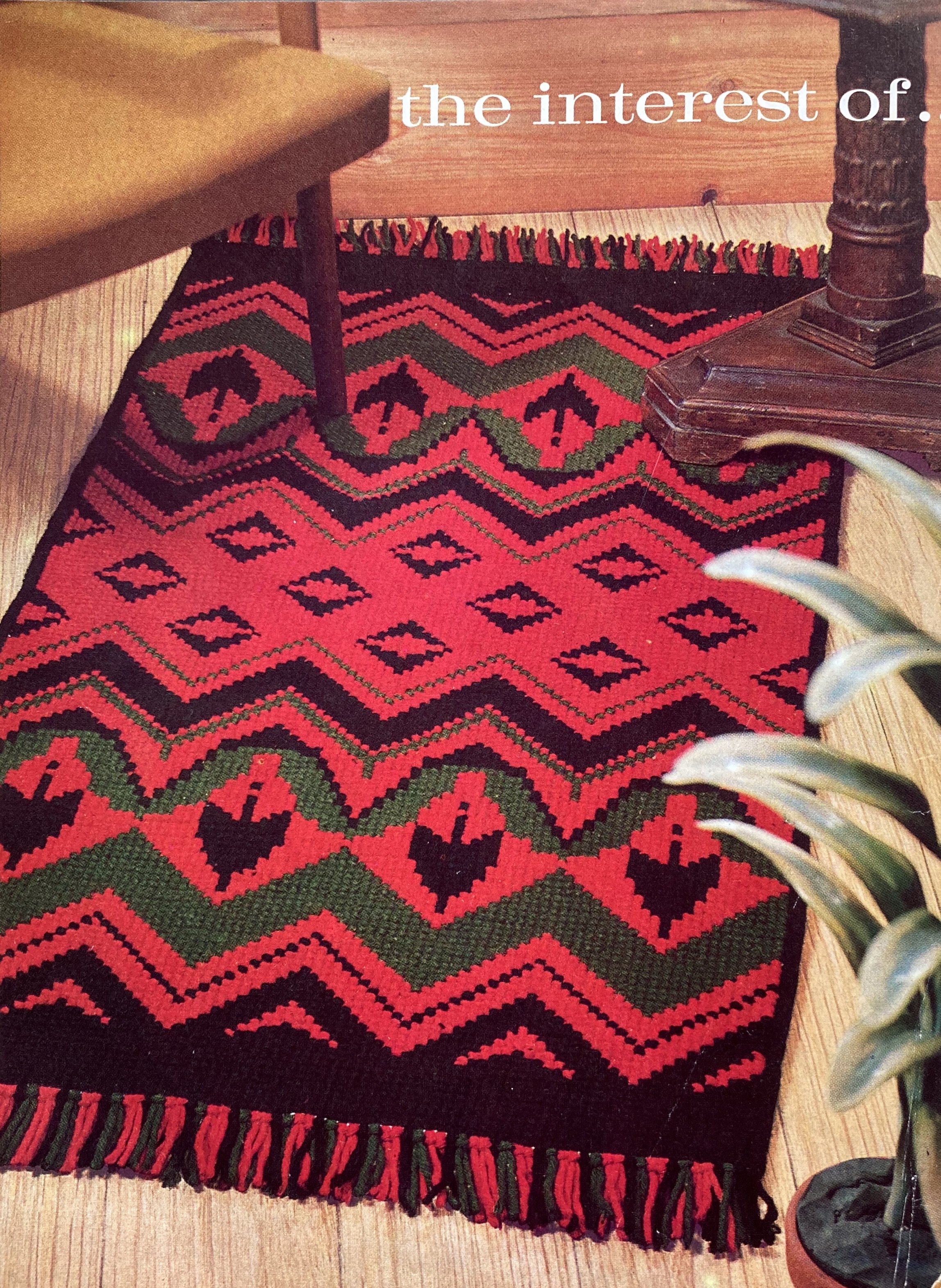 With all these great knitting designs, you’d think the homewares department would be skimpy, but they really went all-out on this issue: in addition to the usual cushions, stool-tops and chairbacks in huckaback work or tapestry, there’s a bold red-and-green “traditional Austrian” rug photographed in colour (notice how a traditional Austrian design is not called “peasant”, interesting…)