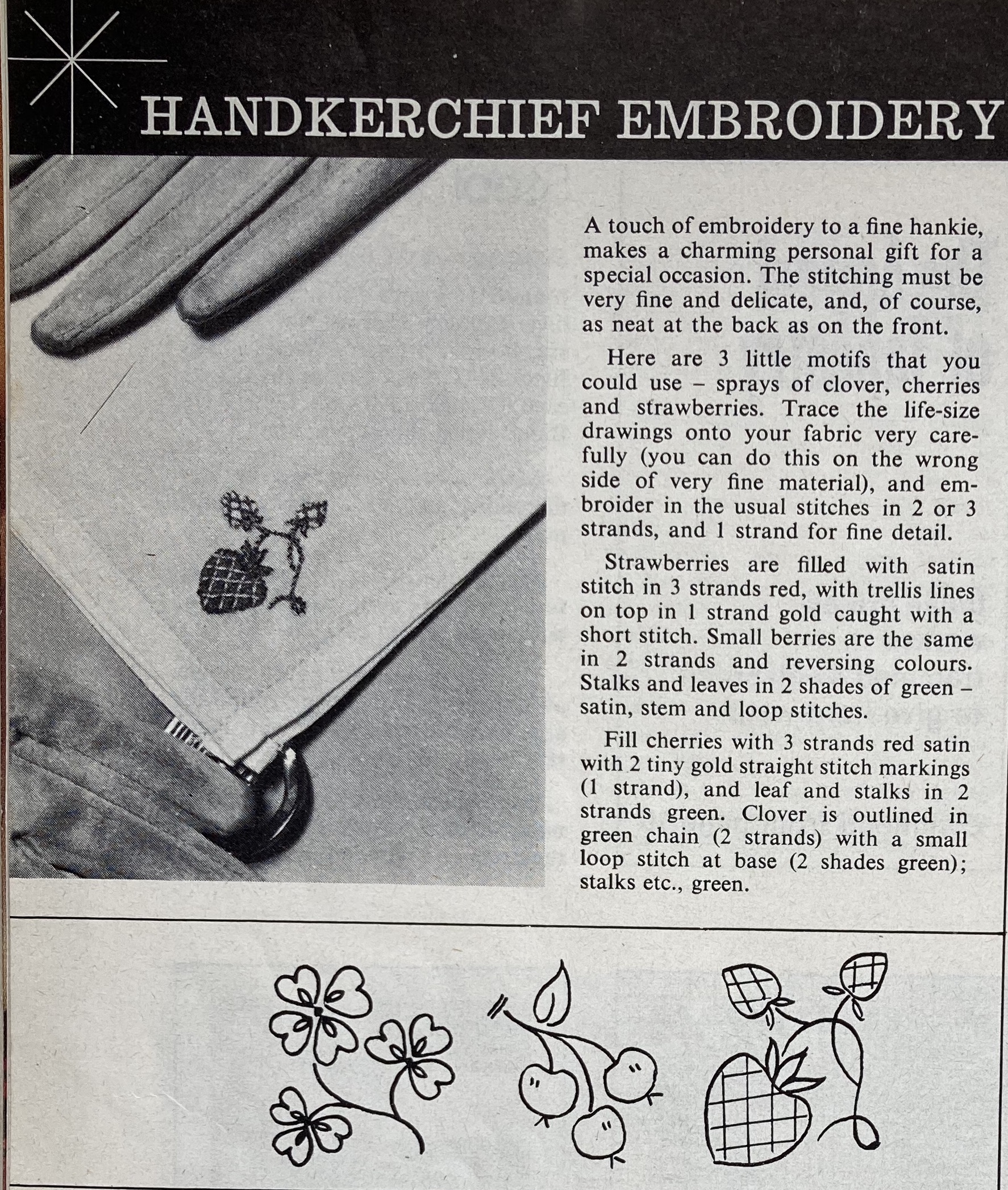 But that’s not all! In addition to the usual comic (Anne learns how to embroider an owl and a swallow using different embroidery stitches), the “Readers’ Pages” in the back of the magazine have a reprint of a 1944 knitting pattern for warm “cami-knickers” underwear, and some dainty stencils to embroider onto handkerchiefs. I love embroidered handkerchiefs, having inherited some beautiful ones from my grandmother and occasionally bought more on ebay. If I ever find any plain new ones to buy (shouldn’t be that difficult), I could try my hand at embroidering them myself.