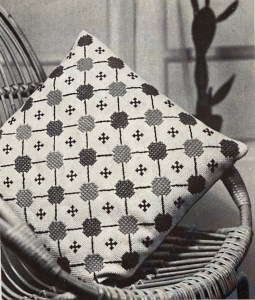 For this month’s project, I wanted to try something different and convert a cross-stitch pattern into knitting. The April 1965 issue of Stitchcraft had two designs for counted-stitch cushions embroidered with tapestry wool on coarse “Portree” cloth. Portree seems to be a grouped-thread fabric similar to Aida, but doesn’t seem to be manufactured under this name anymore. (If you know anything about it, please tell me!)