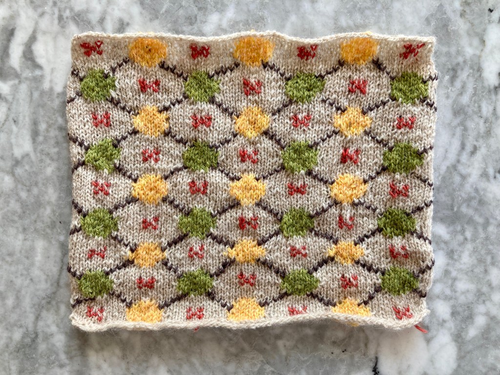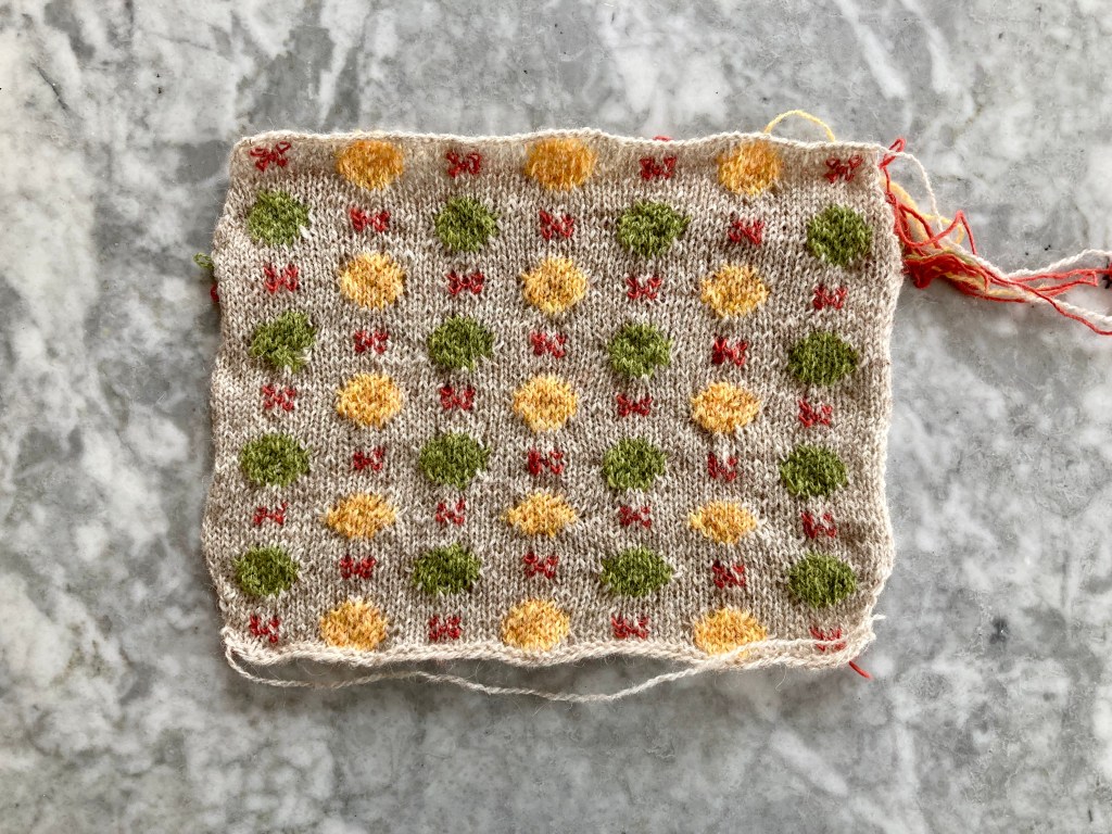 The original pattern uses Lime, Orange and Brown wools on natural colour cloth (how very 1960s.) I had lots of scraps of Shetland wool and used green (lime, I guess) and yellow (lemon?) for the spots on a slightly pink natural background. For the little motifs between the spots (brown in the original design), I chose some pink silk-wool blend of which I also had a small amount left over. The spots are 3, 5, 7, 7, 7, 5, 3 stitches wide and I stranded the wool on the seven-stitch rows and twisted the background and spot colours together at the changes on the edges of the spots. I made a modified square with slightly rounded edges, thinking if I didn’t know what to do with it, I could always mount it in a circular embroidery hoop-frame and hang it on the wall. Nine rows of spots made a piece about 10 inches wide and 9 inches long. Here it is after blocking, but before adding the duplicate stitch lines: