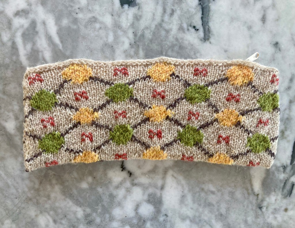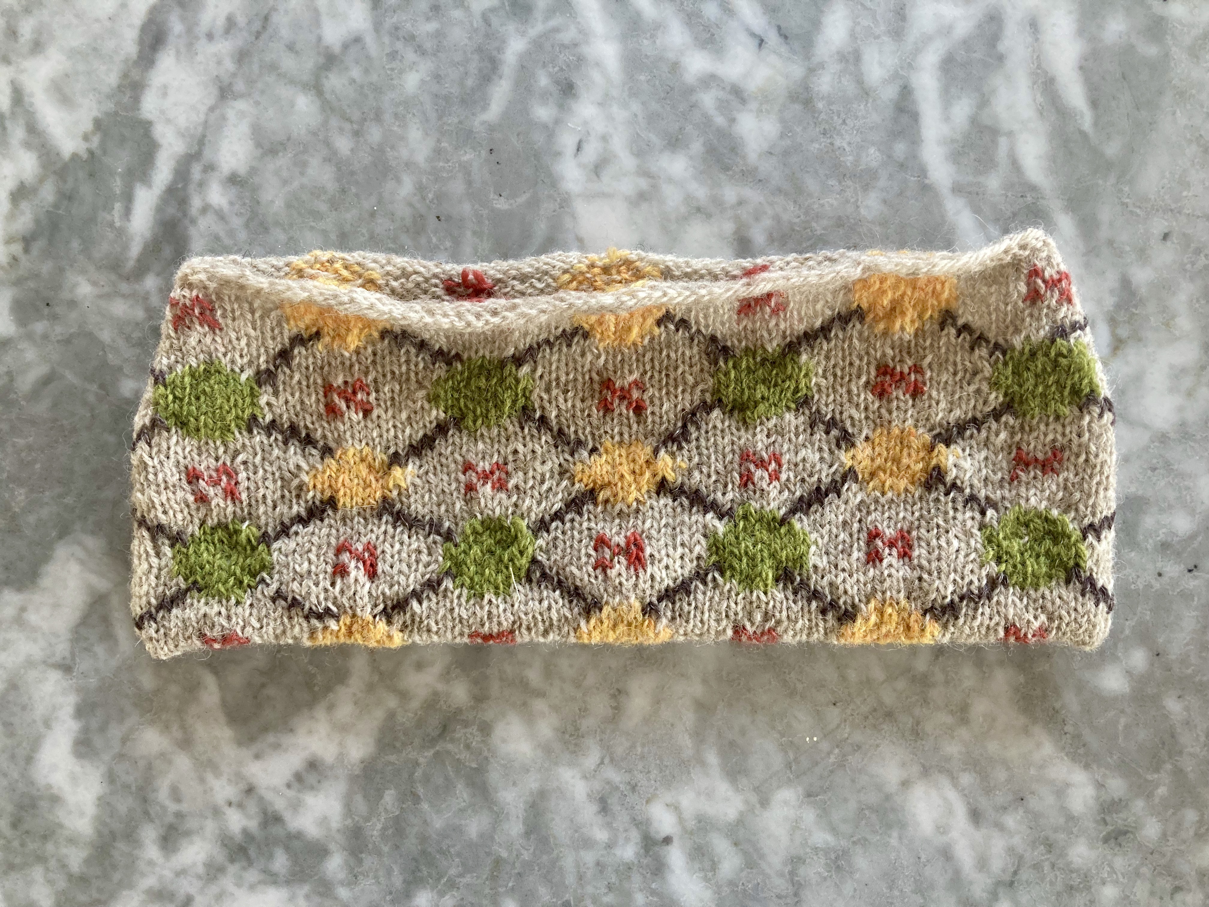 Anyway, I don’t like counted cross-stitch and I have enough cushions, but I was interested to see how one could convert the cross-stitch pattern into knitted form and what type of object or garment it would be suitable for. Theoretically, any counted-stitch chart can be used as a knitting chart. In practice, many cross-stitch patterns are not suitable for stranded or intarsia knitting due to the number of colours in a row or the placement of motifs. I thought this design would work as an intarsia design because the motifs are small and self-contained. The diagonal lines could be added in later either with embroidery on the finished knitting, or with duplicate stitch.