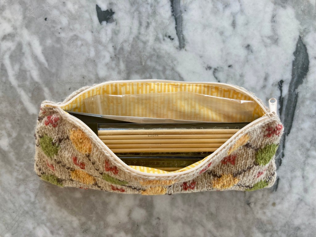 At this point, I had realised that I could fold it in half to make a little rectangular case for pencils or double-pointed needles. Not that I need that, particularly, but if it turned out well enough, I could give it away or sell it or something. I bought a small piece of yellow cotton for the lining and a zipper, sewed it up and there it was.