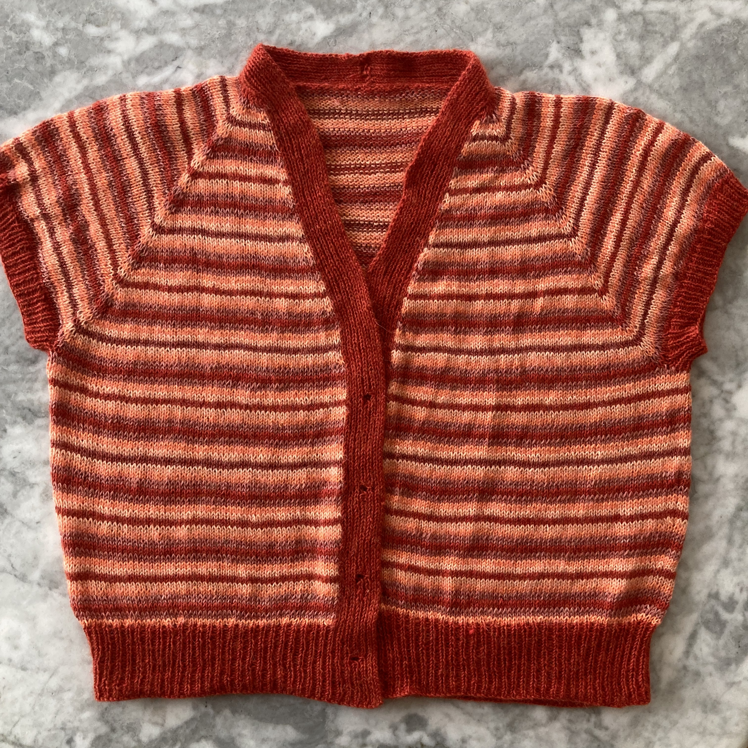 I ran out of the light peach yarn first and hardly had any dark orange left at that point, so had to buy another ball of the dark orange to finish off the ribbing (so much for the idea of using up scraps…). I expected to not want to wear or keep the finished garment, since the “cropped and boxy” look is not a great one on me. (It is, however, currently in fashion, so I figured I could sell the cardigan.) Strangely, though, I love it! It looks playful and fun and does not me look nearly as squared-off-and-put-in-a-box as I thought it would. The wool-silk-linen blend yarns and cap sleeves make it a perfect-temperature top for slightly cooler summer days.