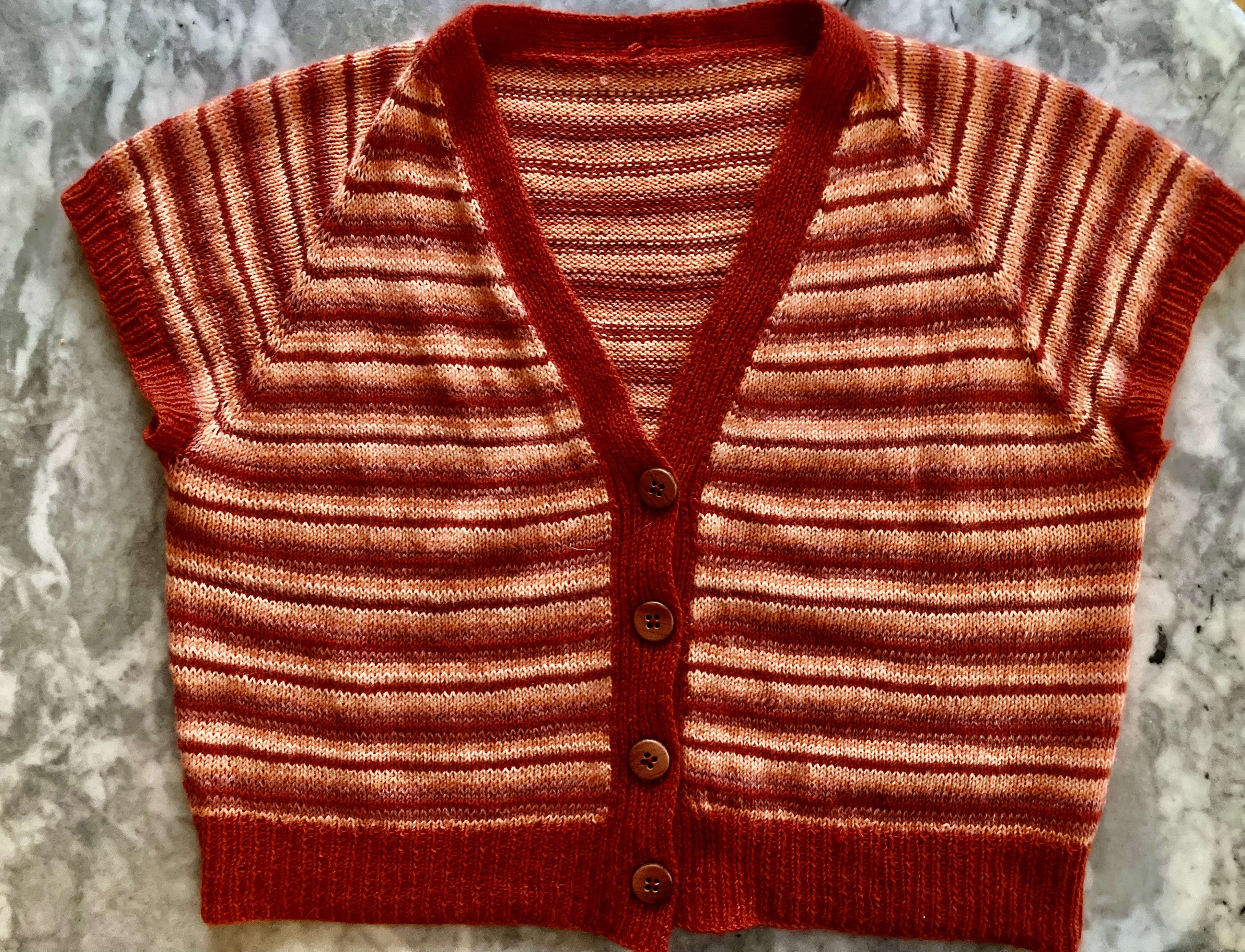I say “inspired by” because I saw the project as a way to use up the different shades of orange wool I used in my “Shaded Blouse” project from last month, as well as the leftover pink from my “Clarel” and even a little bit of leftover orange from this lovely 1961 sleeveless top I made a few years ago. I figured I could just make narrow stripes until the first colour ran out and then see how to best finish the cardigan.