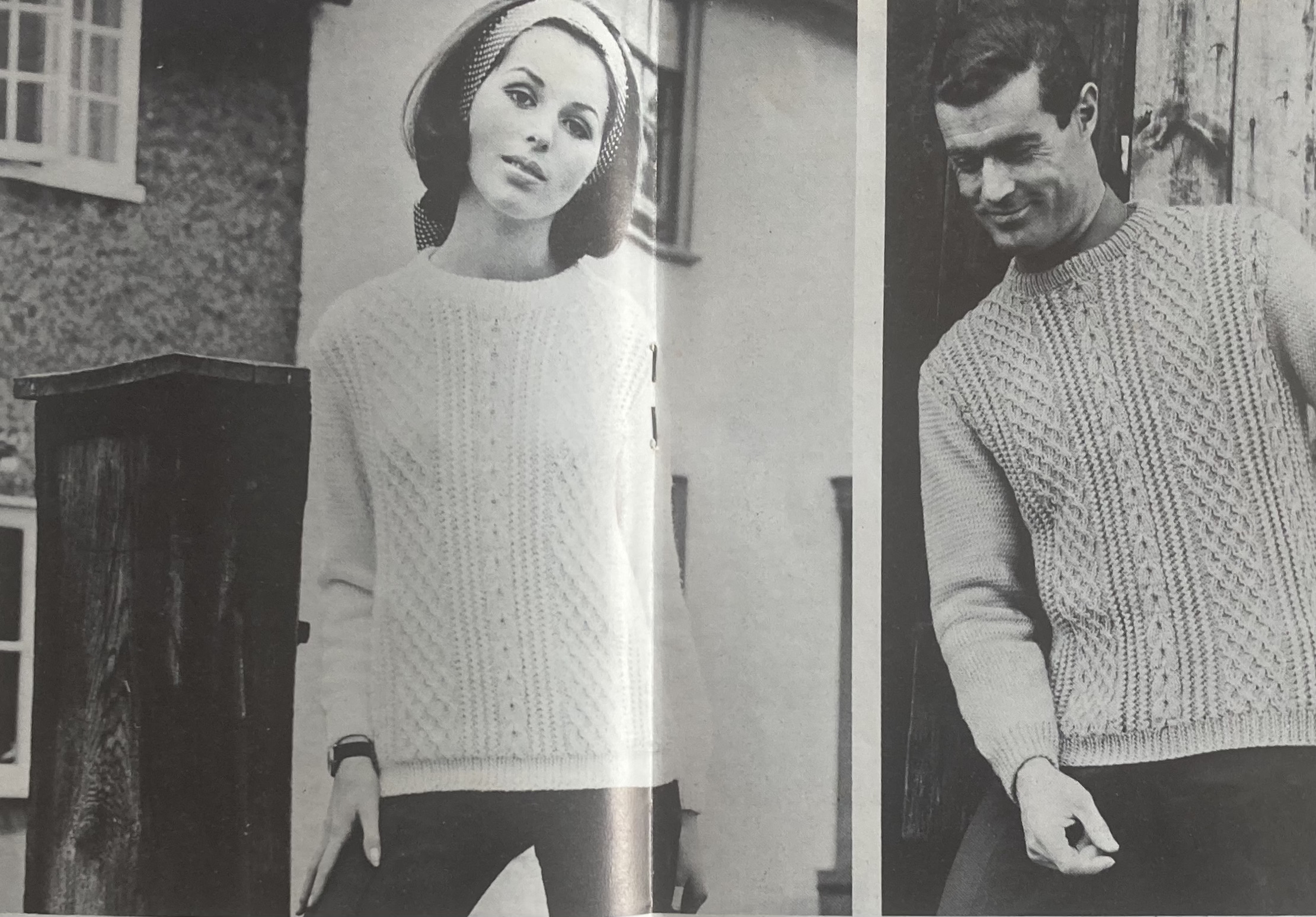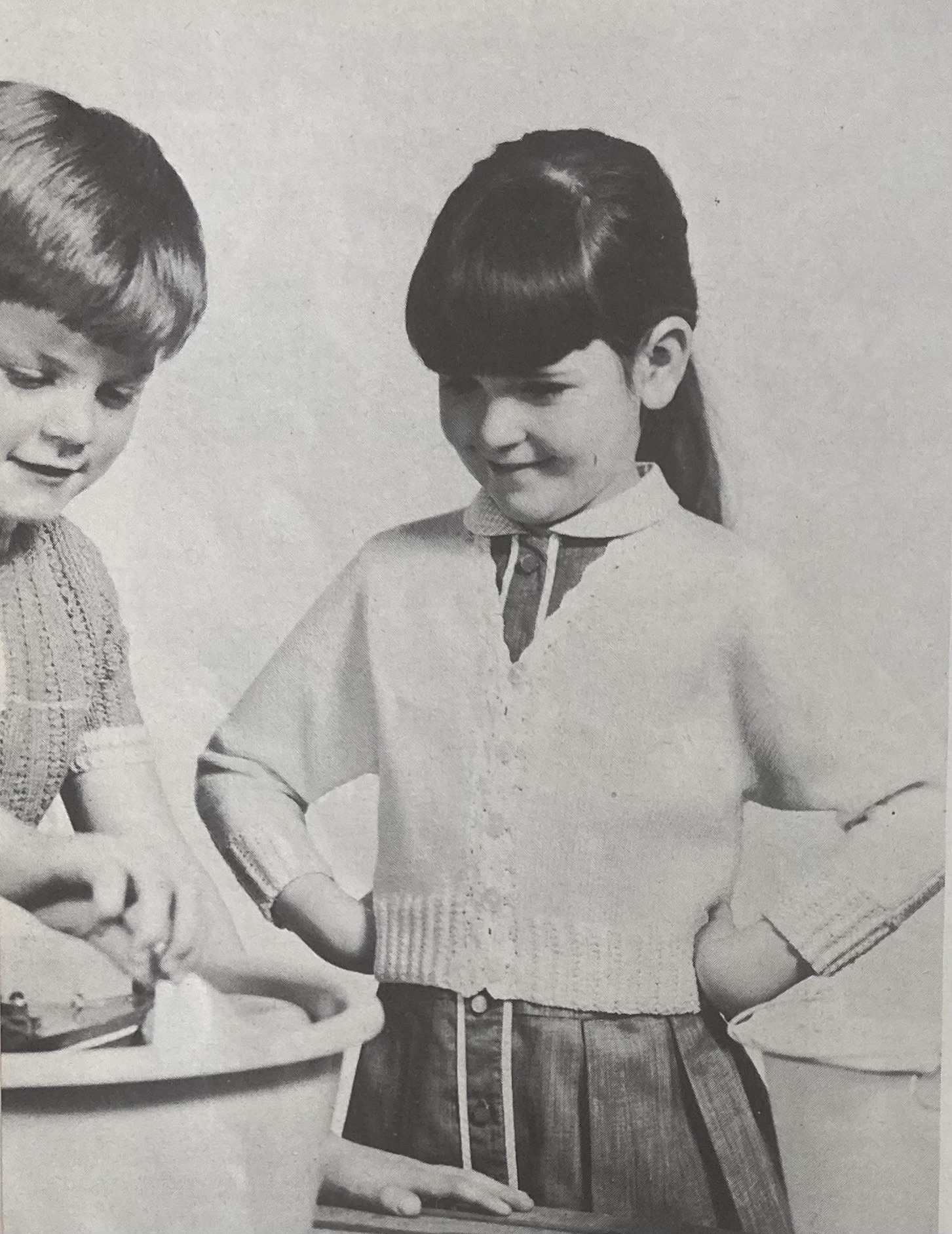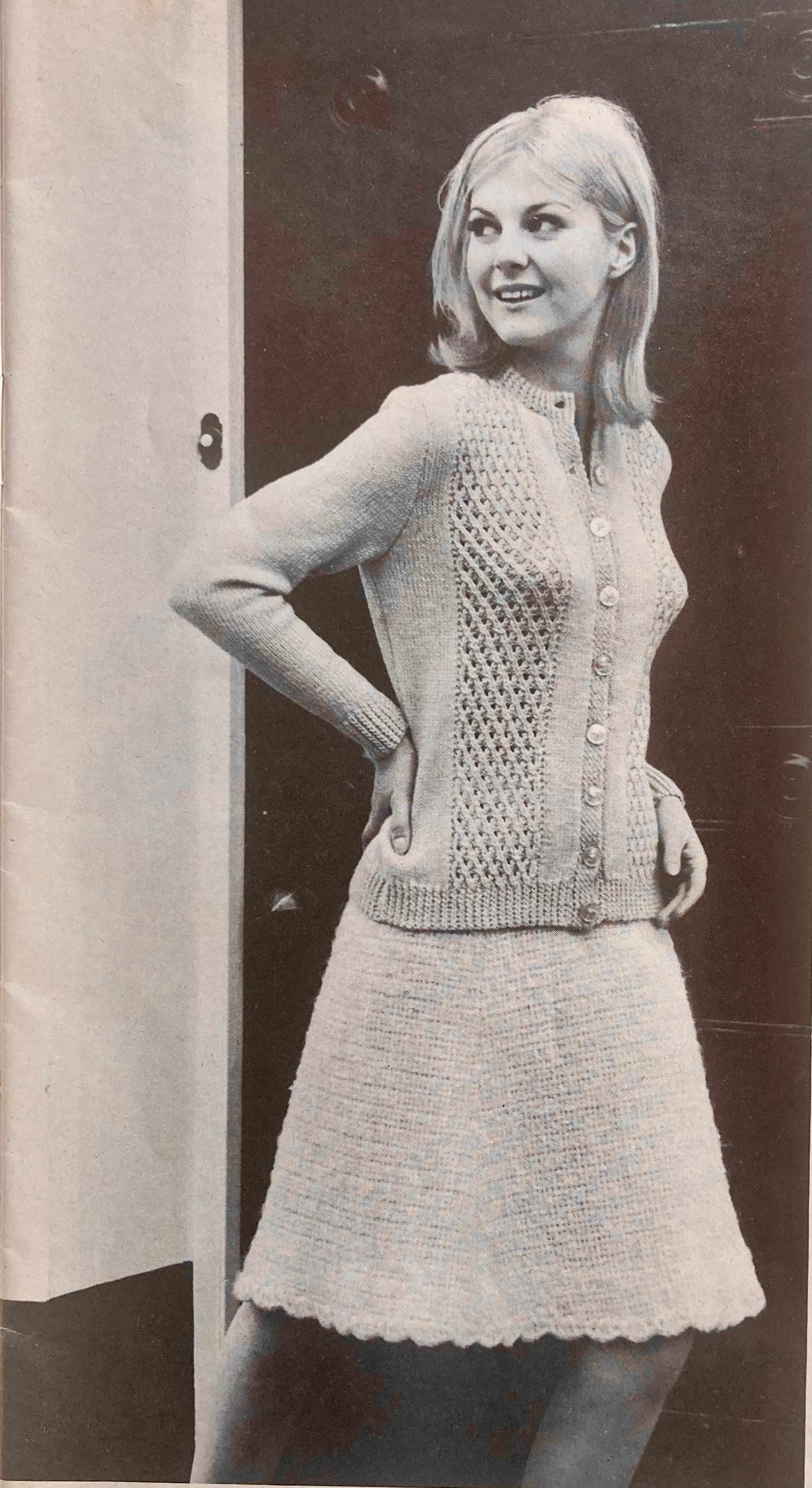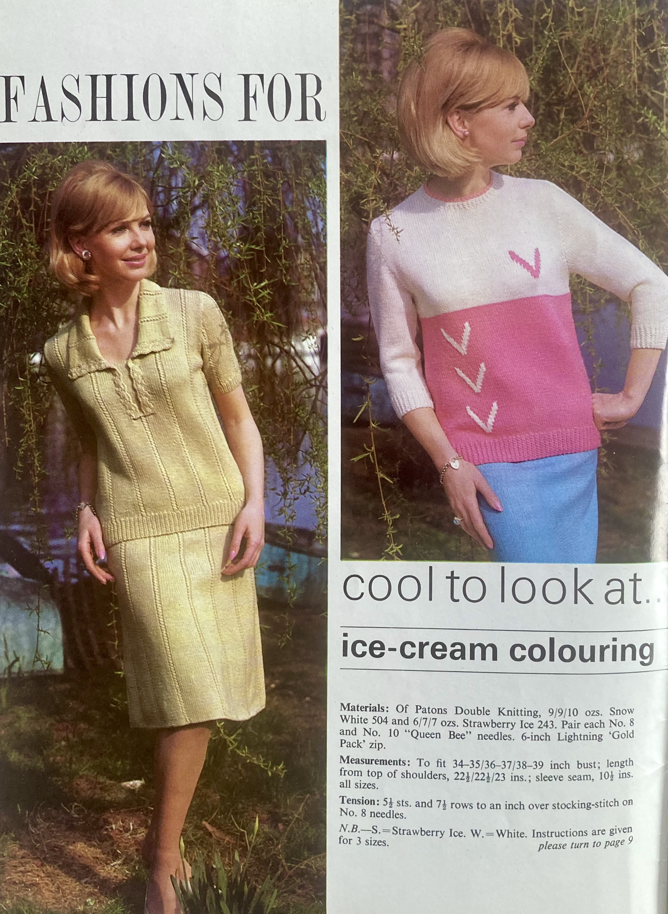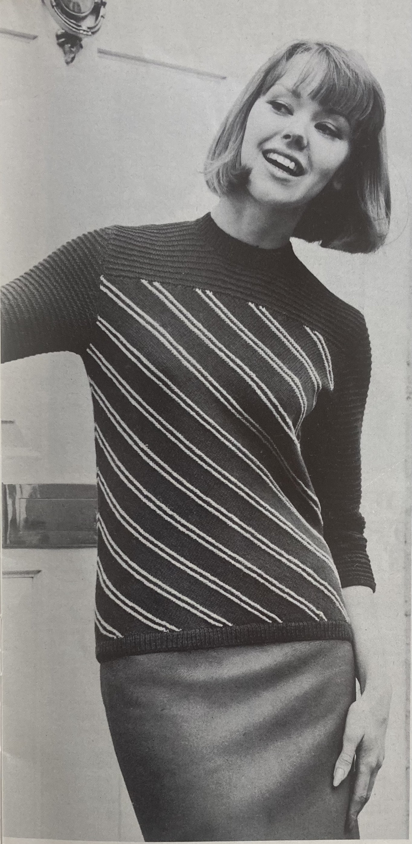But I digress! The cover photo shows Aran sweaters in the partner-look for him and her, made in slightly-heavier-than-DK “Flair”, a wool-synthetic mix. Other fashions for women strike a balance between “cool to look at… warmer to wear” and include a two-piece DK dress with a short-sleeved top or a DK sweater in “ice-cream” colours of bubblegum pink and white. For the coming autumn days days, there’s a DK cardigan made warmer and heavier by the use of trellis-stitch panels on the front and back, or for a lighter touch, there’s a 4-ply jumper with diagonal stripes, knit diagonally — basically two rectangles for front and back, then picking up stitches for the vertically-knit yoke, and separate sleeves. The colour scheme is definitely still summery, with the striped jumper in navy blue and white and the trellis cardigan in light “Beau Blue”.
