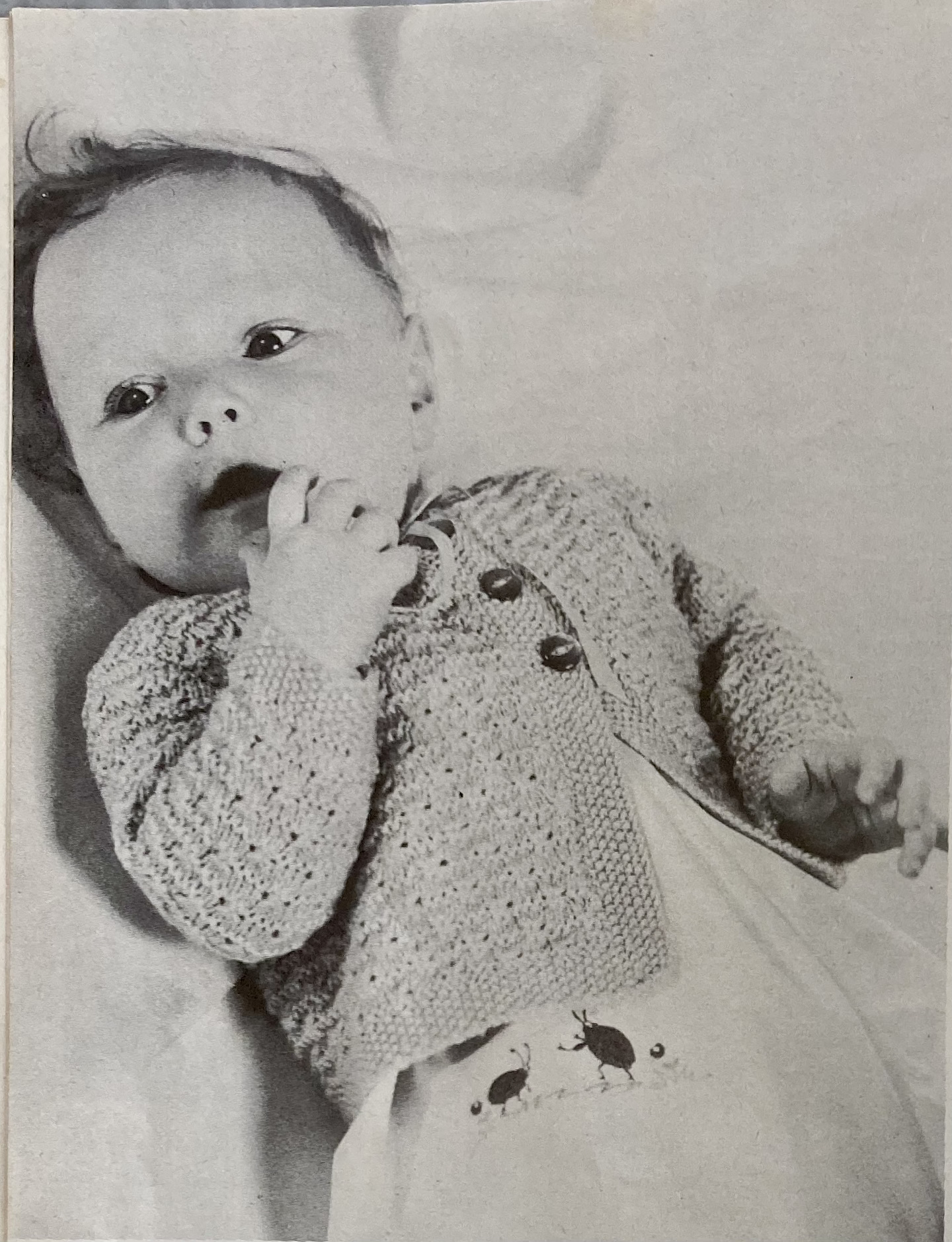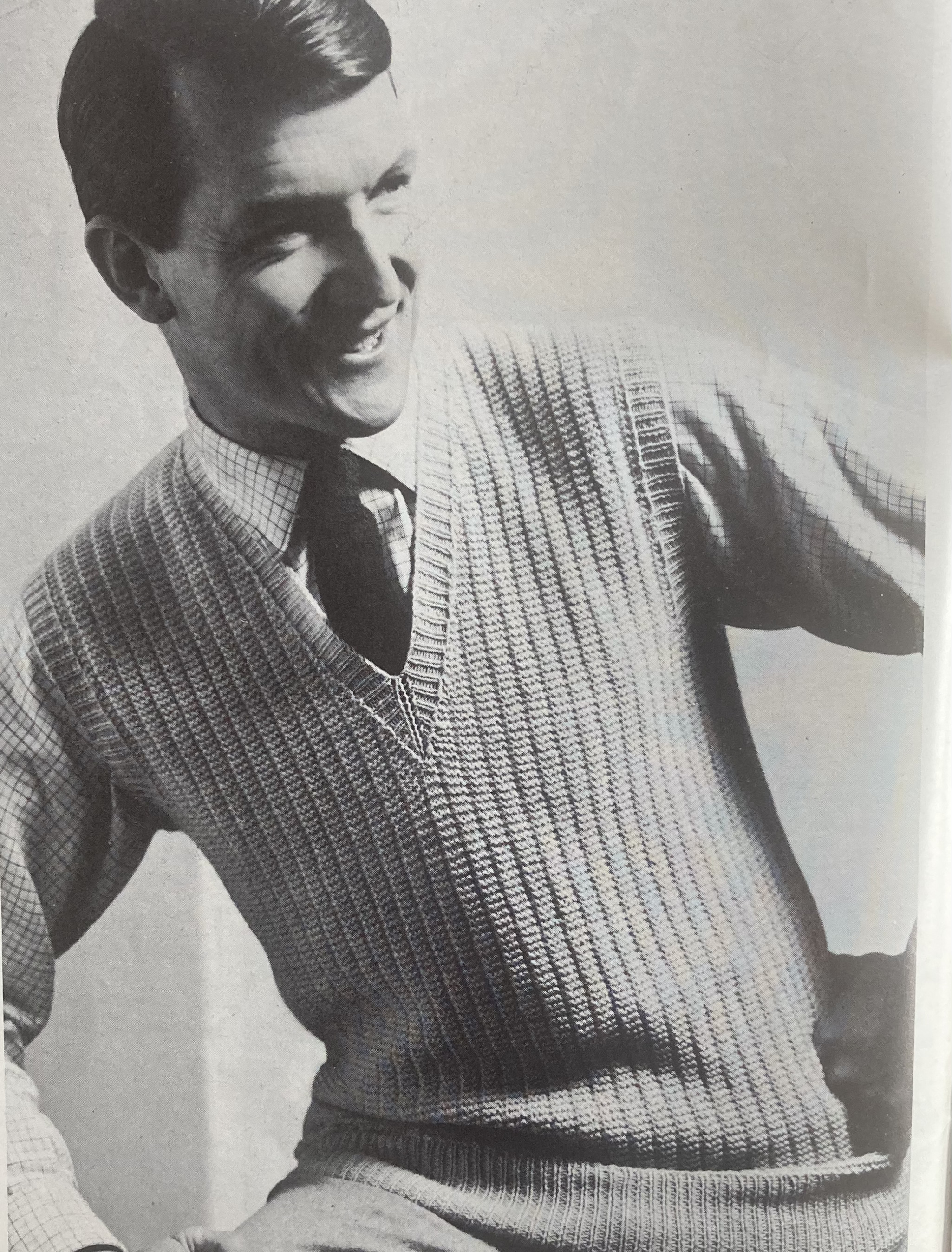 This month, we once again have children’s fashions for all ages. There’s a dolman cardigan for girls up to a 29 inch chest and a cute unisex “play shirt” up to 28 inch chest, all in sunny colours of gold, white, “Gay Turquoise” and “Sunglint”. Baby’s turquoise “extra jacket” is worked in one piece up to the armholes in a stitch pattern that looks a bit like the one for the man’s slipover, but is more complicated: