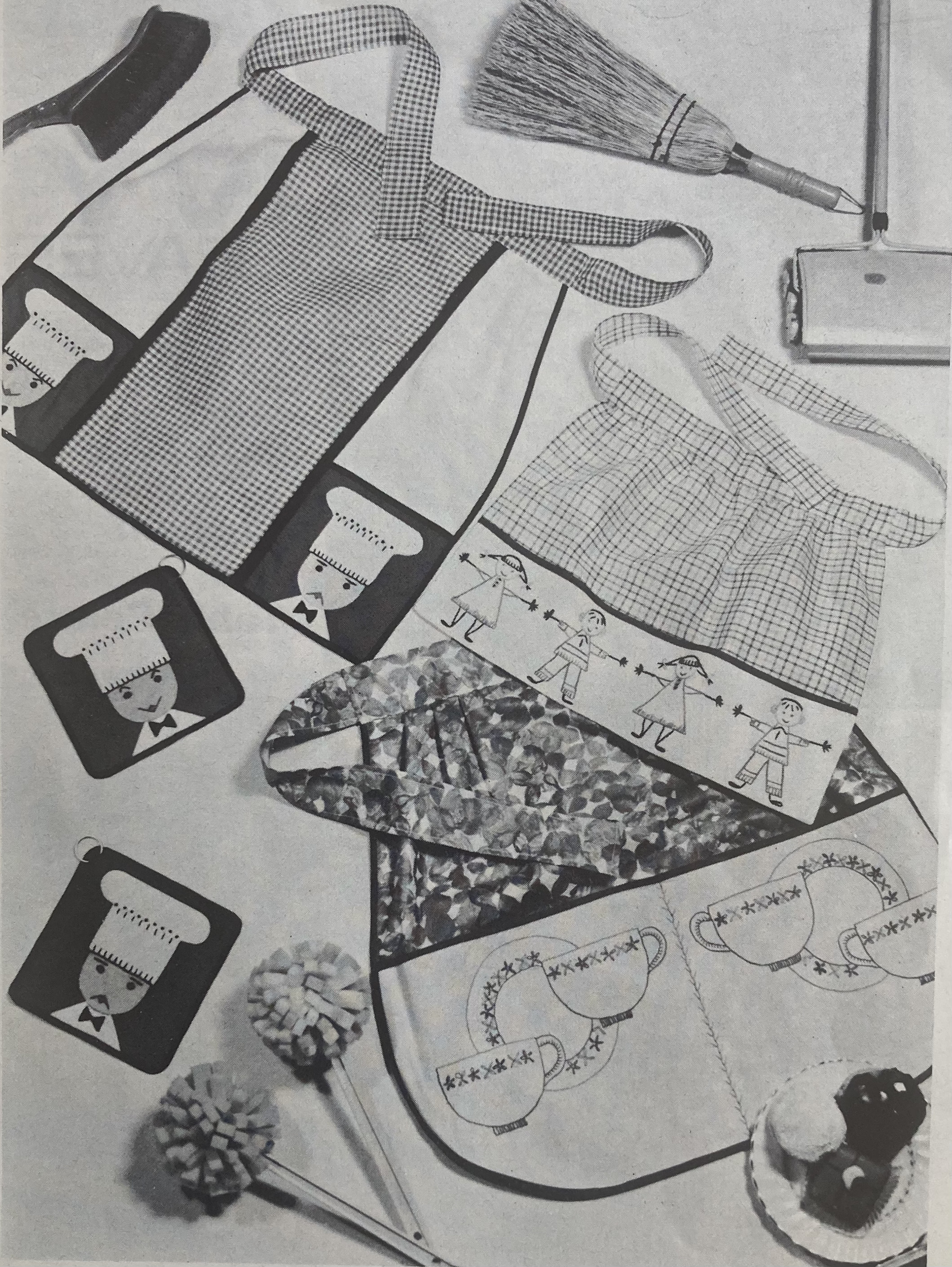 It wouldn’t be a proper issue of Stitchcraft without bizarre-bazaar ideas, though these are not nearly as weird as some of the items that we’ve seen in the past. The theme is clearly “kitchen” this time, with embroidered or appliquéd aprons and pot holders. Sometimes the chef looks happy with the food, and sometimes he definitely has l’air déçu!