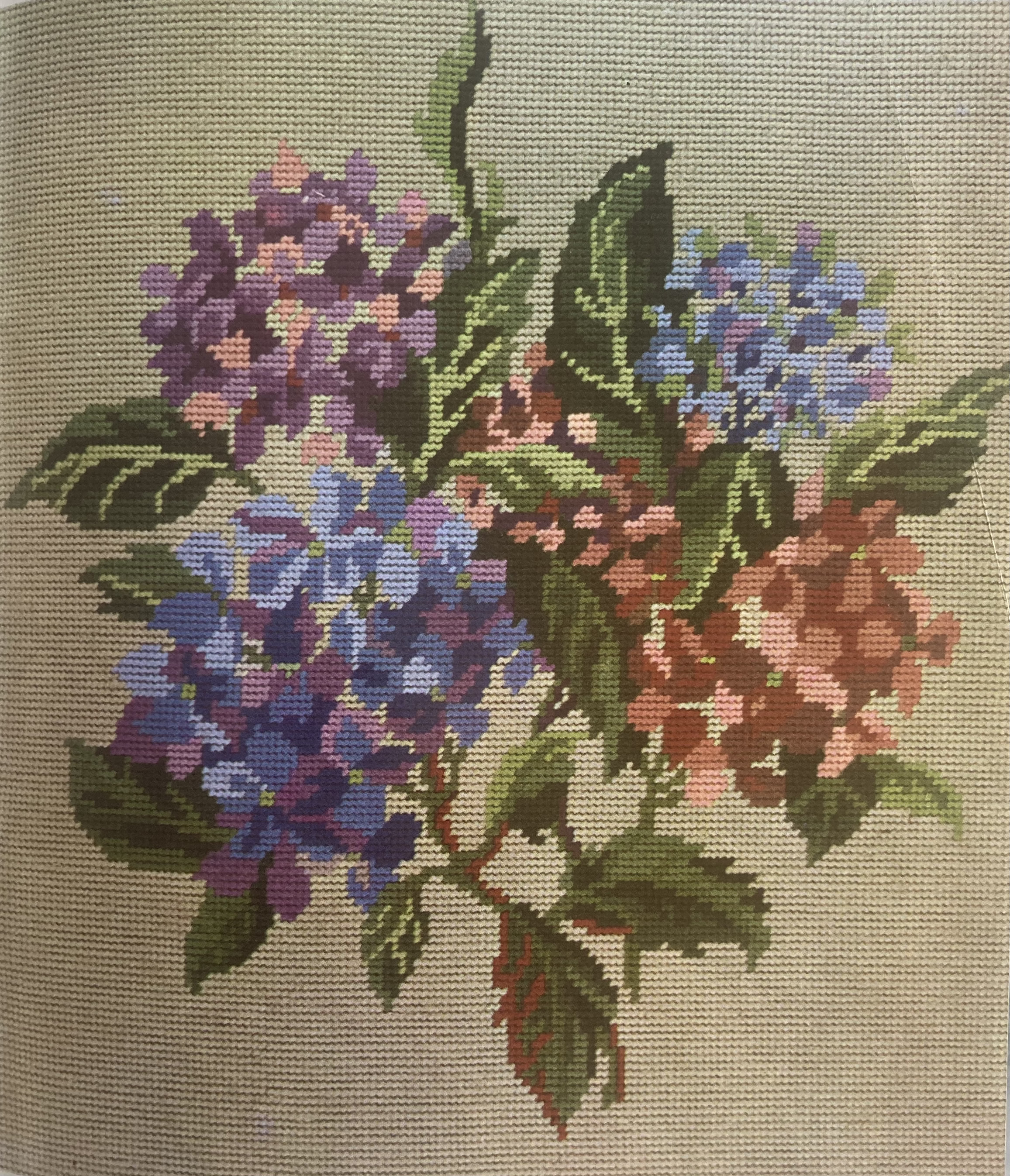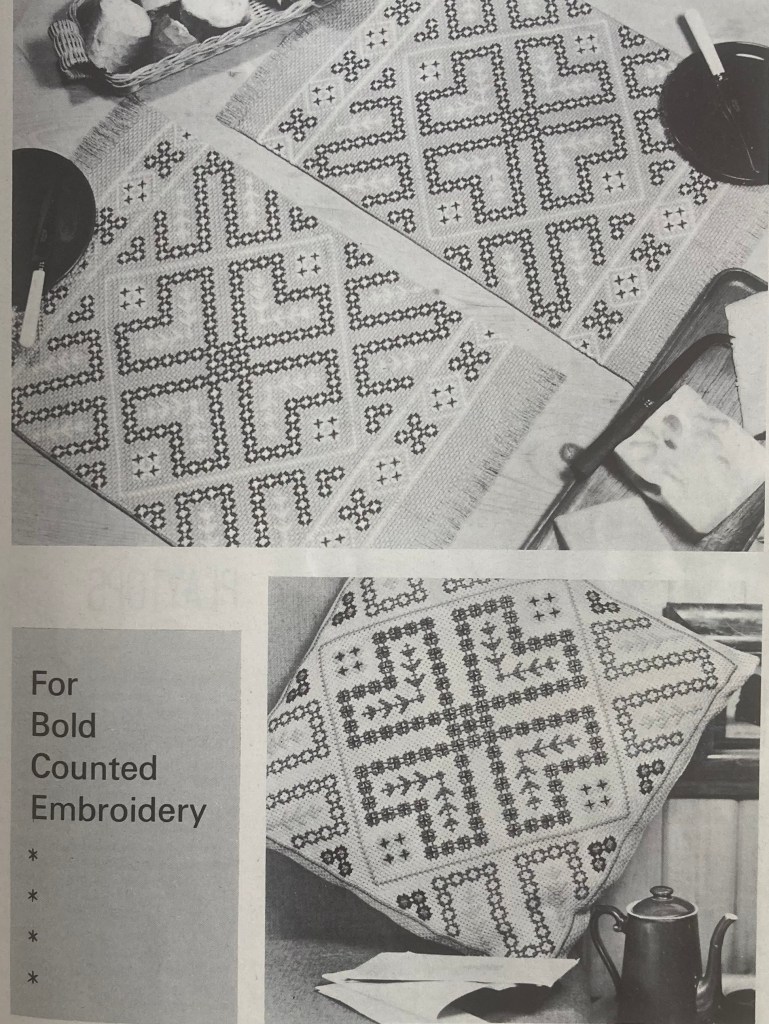 In the homewares department, we have the usual selection of versatile designs for different items and uses. The cross-stitch ivy border, for example, is suggested for “cushions, table mats and chair-backs, or as a border for curtains” , the wavy “design from Greece” is featured on a chair-back, cushion and rug, and the Swedish-inspired design “for bold counted embroidery” works on table mats as well as cushions. Even the tapestry hydrangeas can be used as a wall picture or fire-screen.