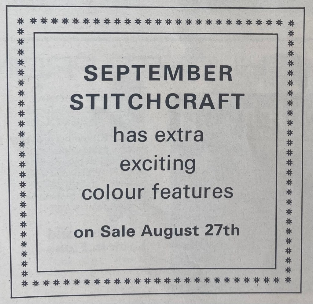It’s “late summer” over at Stitchcraft magazine, and this month’s designs are still summery-looking, but warmer, with an eye towards the coming autumn and cooler weather. Also, production costs were apparently increasing, so readers were informed that as of September 1965, the price for individual issues would be raised to 2s. 0d. The increase to the current subscription rate of £1 8 s 0d for one year or 14s for six months, post-free to any part of the world (!) was scheduled to be explained in the September issue, with existing subscriptions running out at the old price.