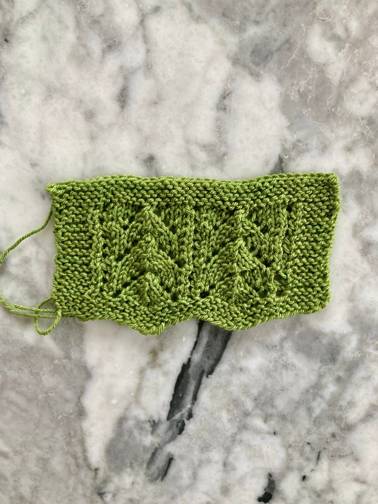 The pattern is from 1946 and, as with many patterns from that decade, information about sizing, ease, tension etc. are minimal. It’s written in one size, for 32 inch bust, with (calculating from the tension given in the pattern) 2 inches of positive ease in the bust — odd for a 1940s pattern, actually, which usually have a quite a bit of negative ease, as do lace patterns, since they stretch so easily. The vintage knitting expert and owner of the BlackwaterVintageNtz Etsy shop Gunwaru on Ravelry had conveniently knitted the jumper herself and wrote in the notes that — made to gauge as specified — her version easily fit a 38 inch-bust dress form. I wasn’t sure if my wool would stretch as much and wanted to reproduce the easy looseness of the pattern photo, so I made a swatch on 3.5 mm needles (pattern calls for 3.75) and added one pattern repeat to each of back and front. This should have given me a 37 inch finished bust, which is a bit of negative ease, but shouldn’t look too tight. I made it one pattern repeat longer as well, as I do for all pre-1960s patterns (I am taller than an “average”-sized woman of the 1940s or 50s and long-waisted).
