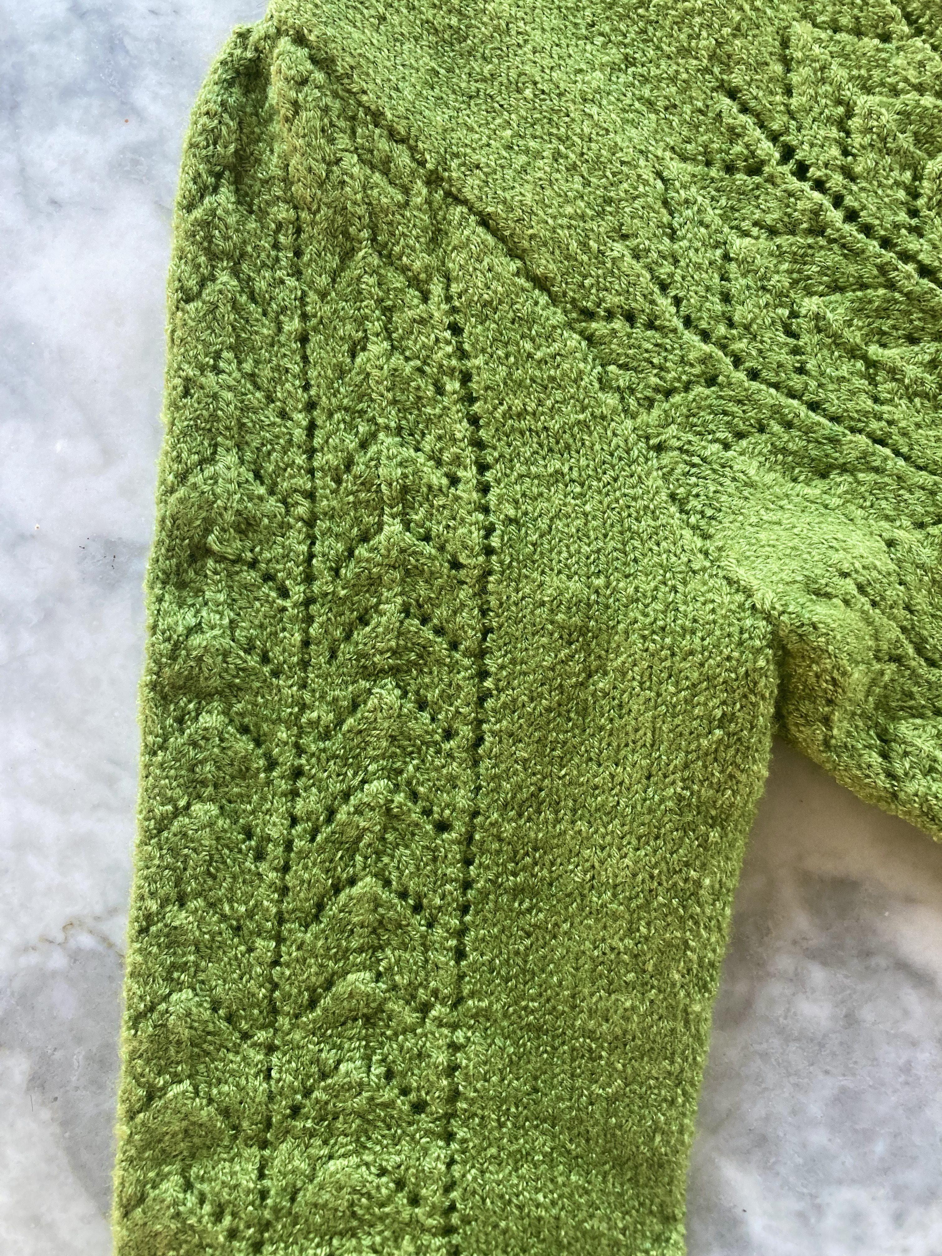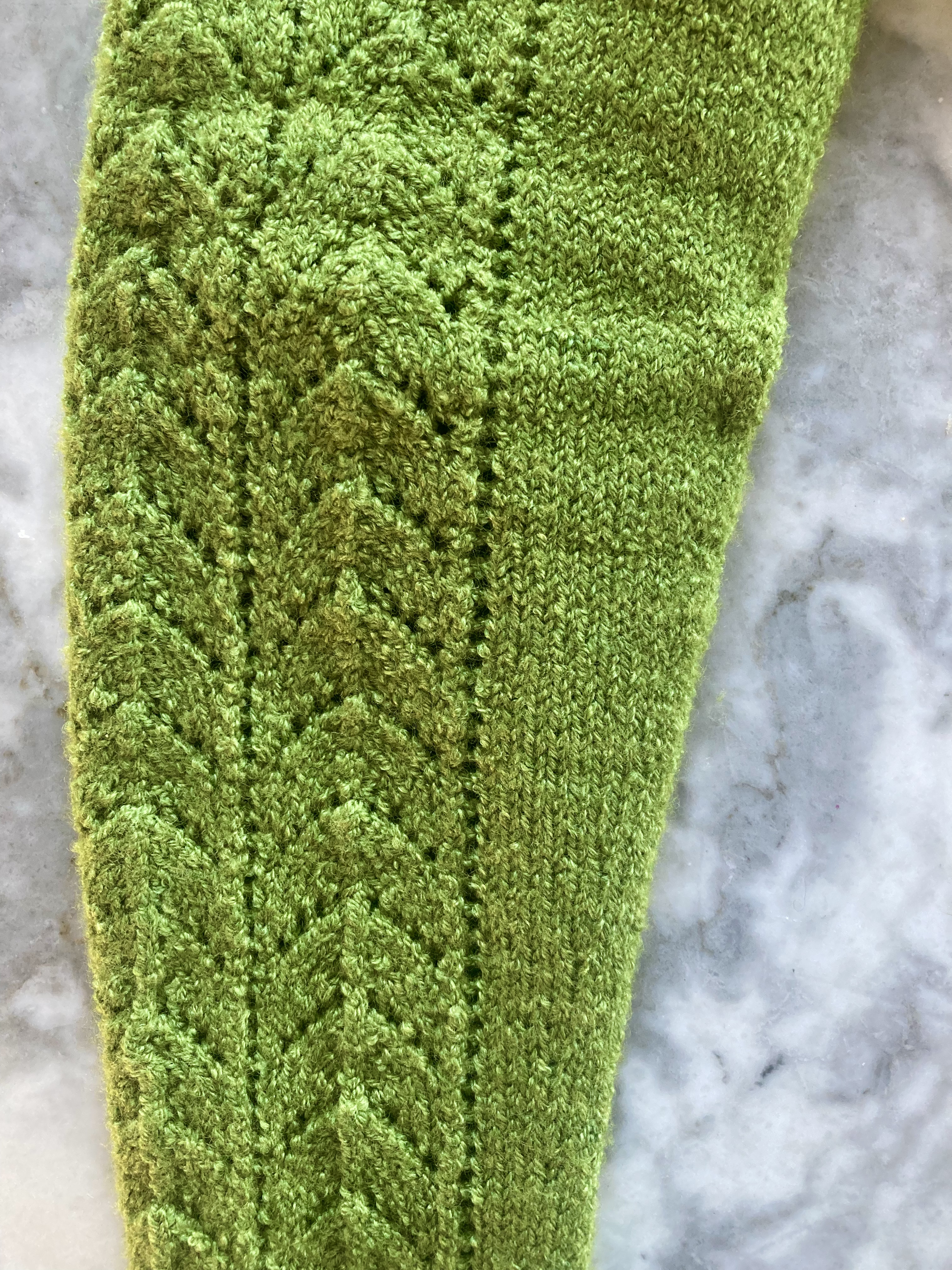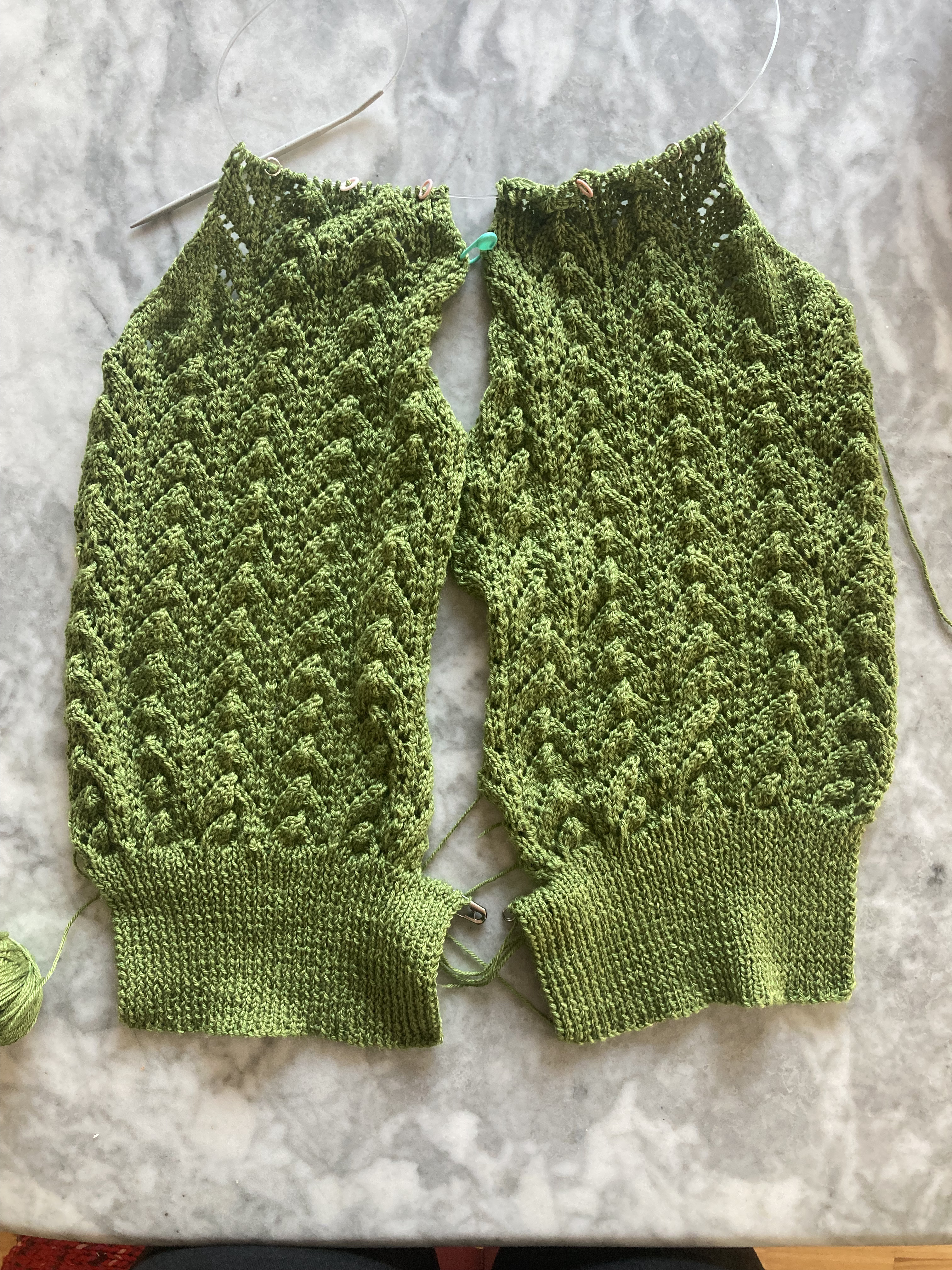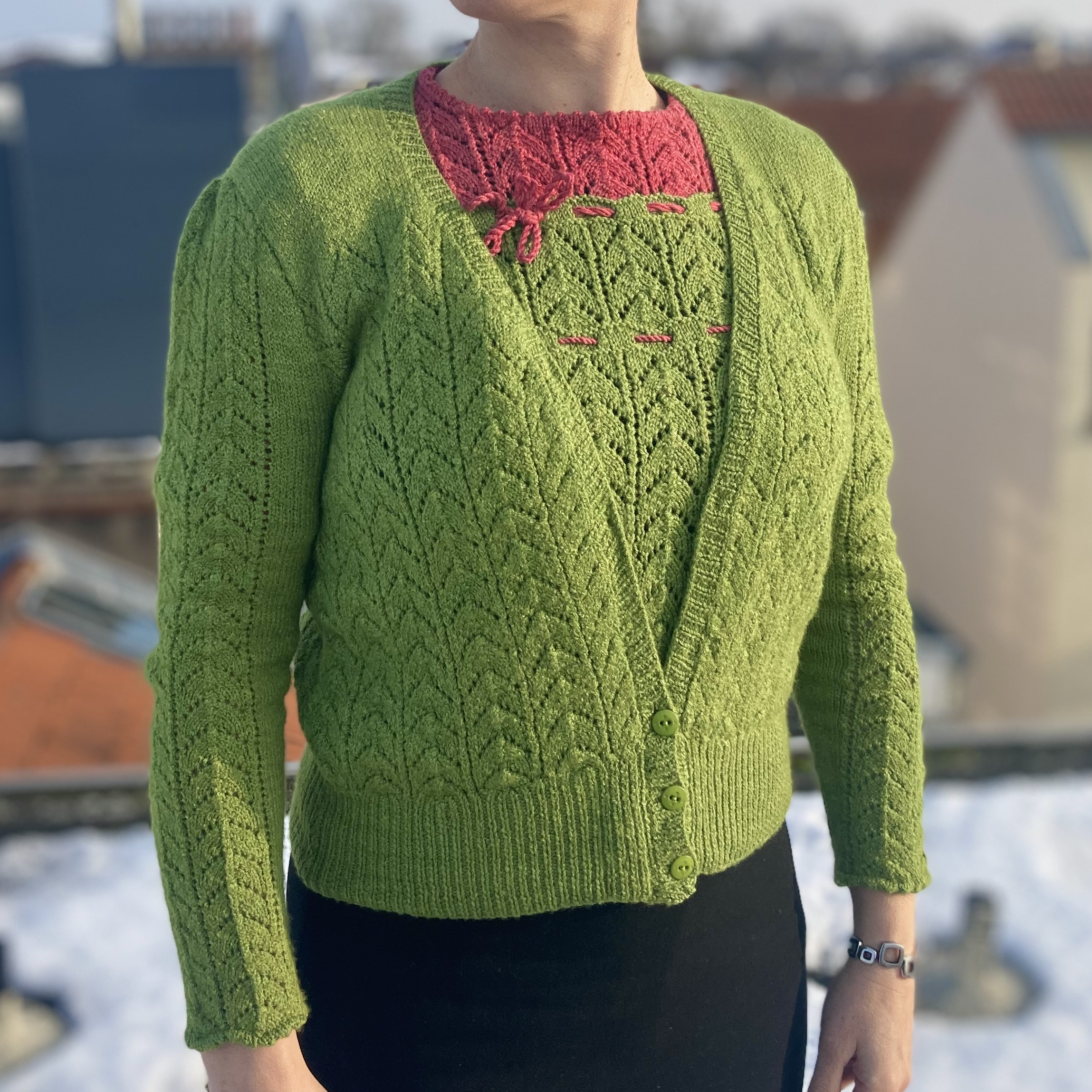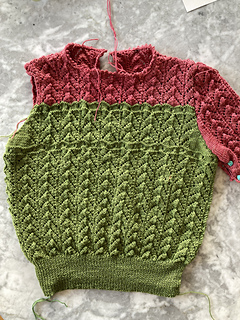 On to the cardigan. There is no pattern for it, so I adapted ideas from the jumper. Sizing was a dilemma, since the jumper was so huge before the dryer manoeuvre, but of course you can’t make the cardigan smaller than the jumper. I decided to make it exactly the same size (plus front bands) and hoped for the best. As for the colour scheme, I wasn’t sure if I would have enough pink yarn left to make both sleeves and yoke, but also not sure if I would have enough green yarn to just make the whole thing in green. This led to a piecemeal approach, since (for example) it would look fine to have just the upper yoke in pink, but not one shoulder of one sleeve. I made at least the start of the front bands together with the fronts for this reason as well. I didn’t want to deal with too many increases in the lace pattern on the sleeves, so I made 4 pattern repeats on a base of stocking-stitch (similar to the way the increases and armhole decreases were made on the jumper.)