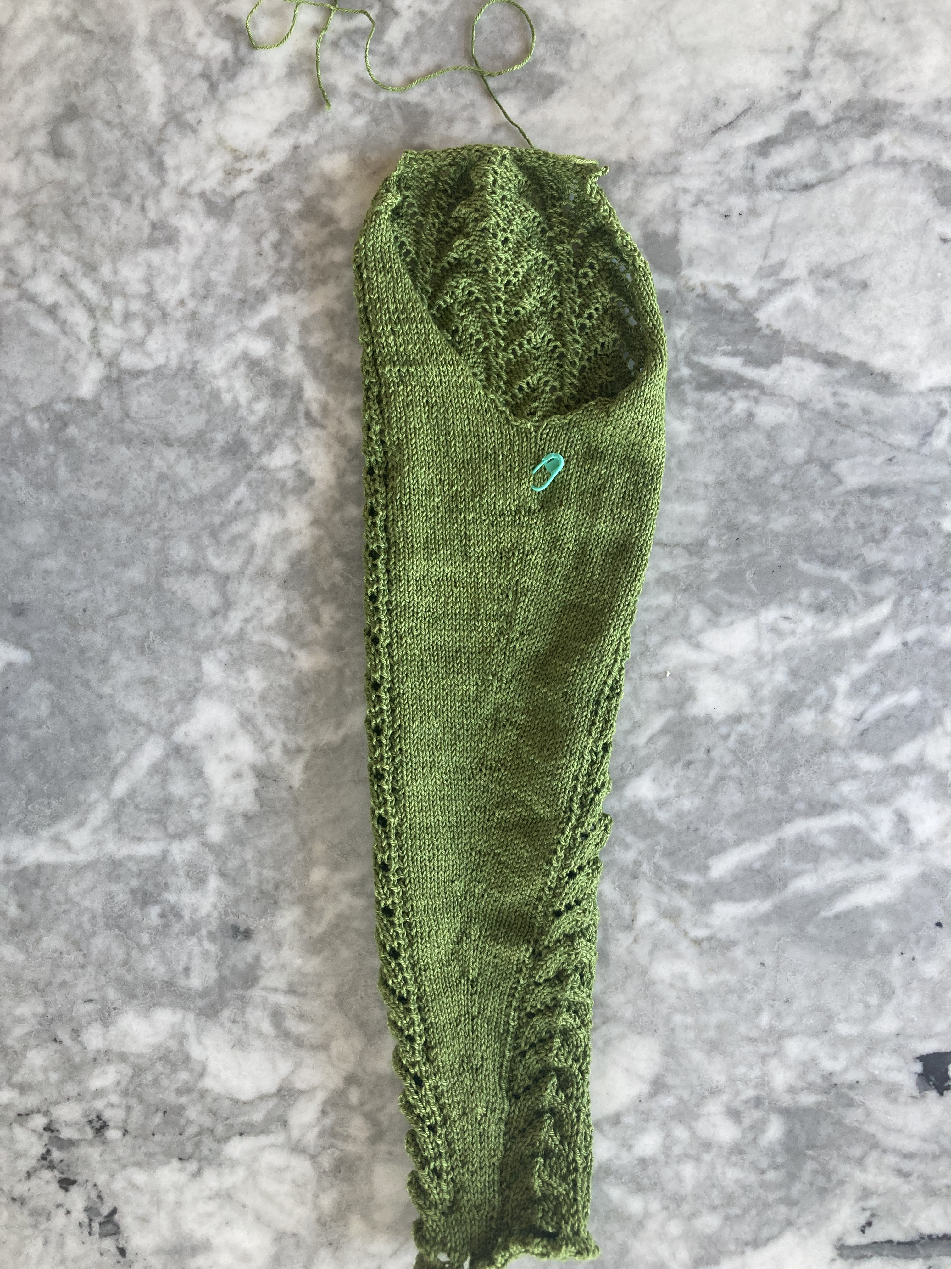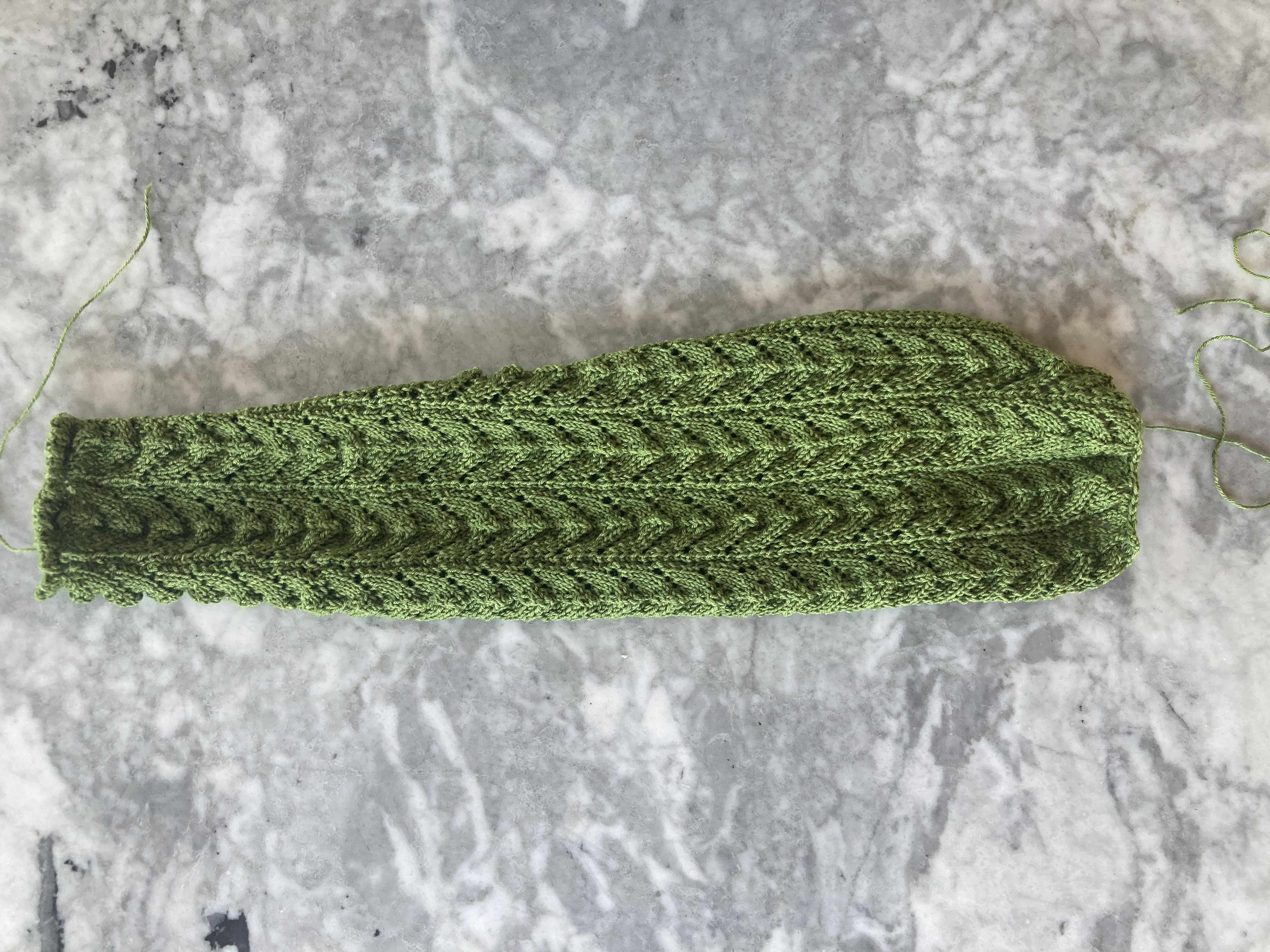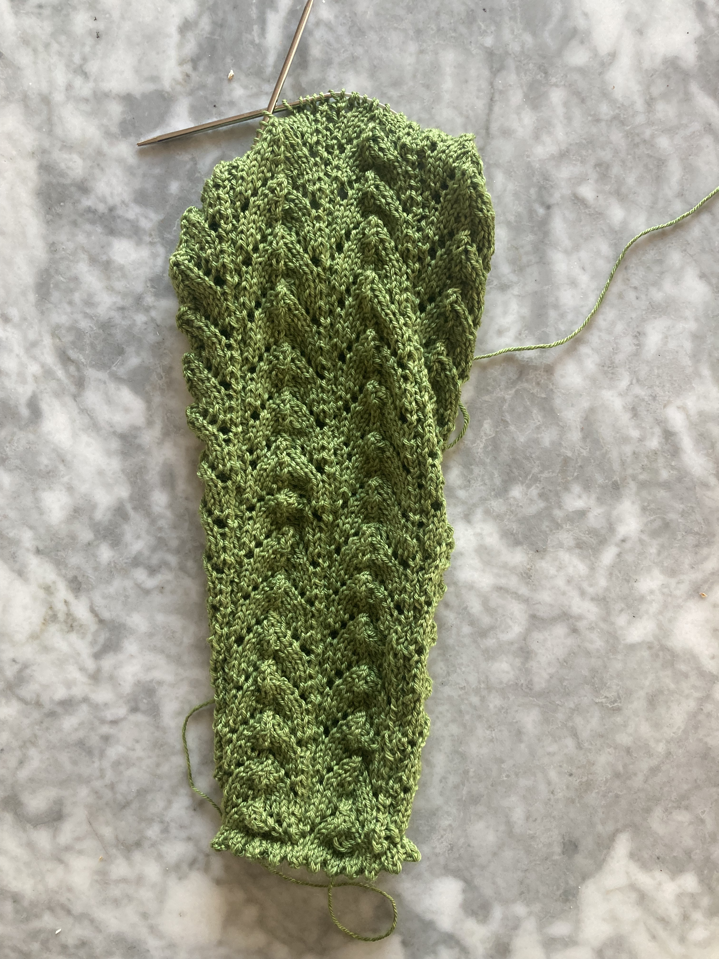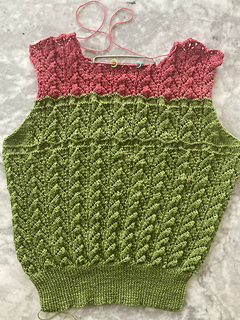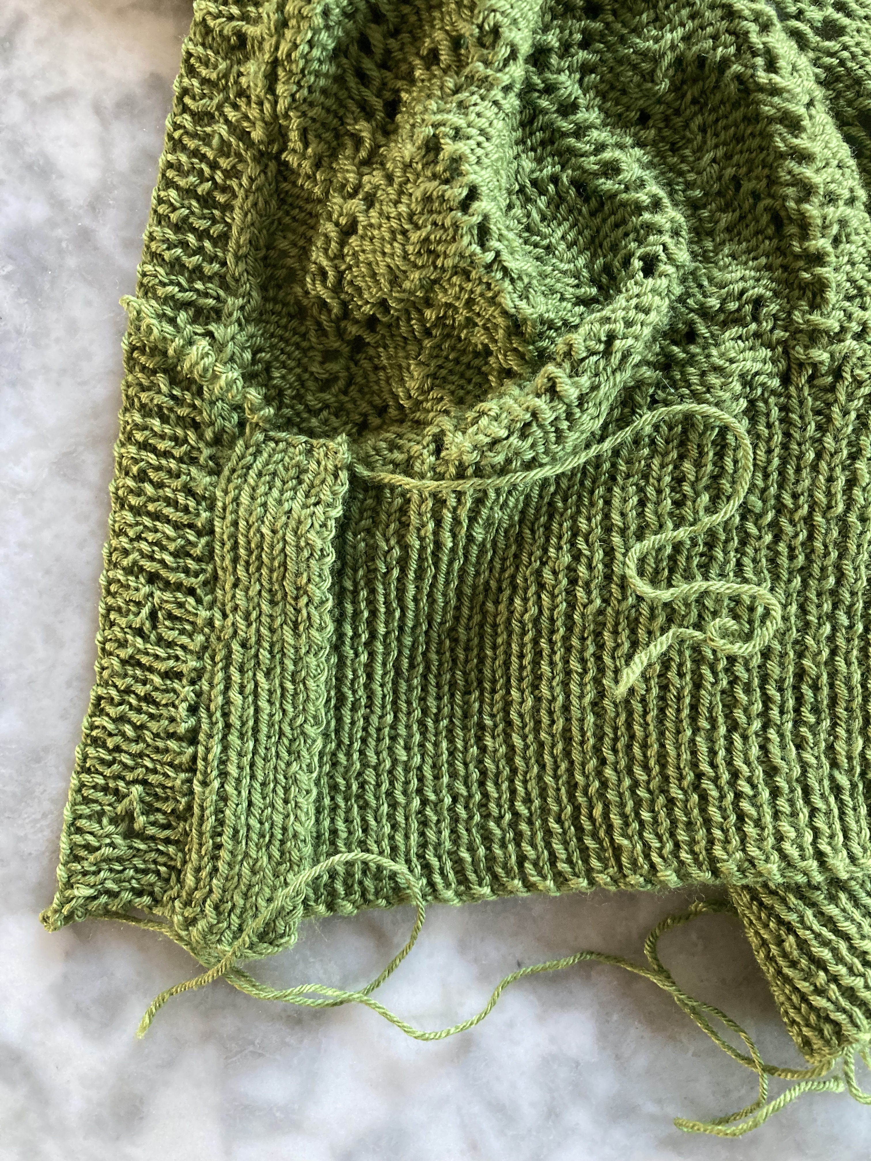 On to the cardigan. There is no pattern for it, so I adapted ideas from the jumper. Sizing was a dilemma, since the jumper was so huge before the dryer manoeuvre, but of course you can’t make the cardigan smaller than the jumper. I decided to make it exactly the same size (plus front bands) and hoped for the best. As for the colour scheme, I wasn’t sure if I would have enough pink yarn left to make both sleeves and yoke, but also not sure if I would have enough green yarn to just make the whole thing in green. This led to a piecemeal approach, since (for example) it would look fine to have just the upper yoke in pink, but not one shoulder of one sleeve. I made at least the start of the front bands together with the fronts for this reason as well. I didn’t want to deal with too many increases in the lace pattern on the sleeves, so I made 4 pattern repeats on a base of stocking-stitch (similar to the way the increases and armhole decreases were made on the jumper.)