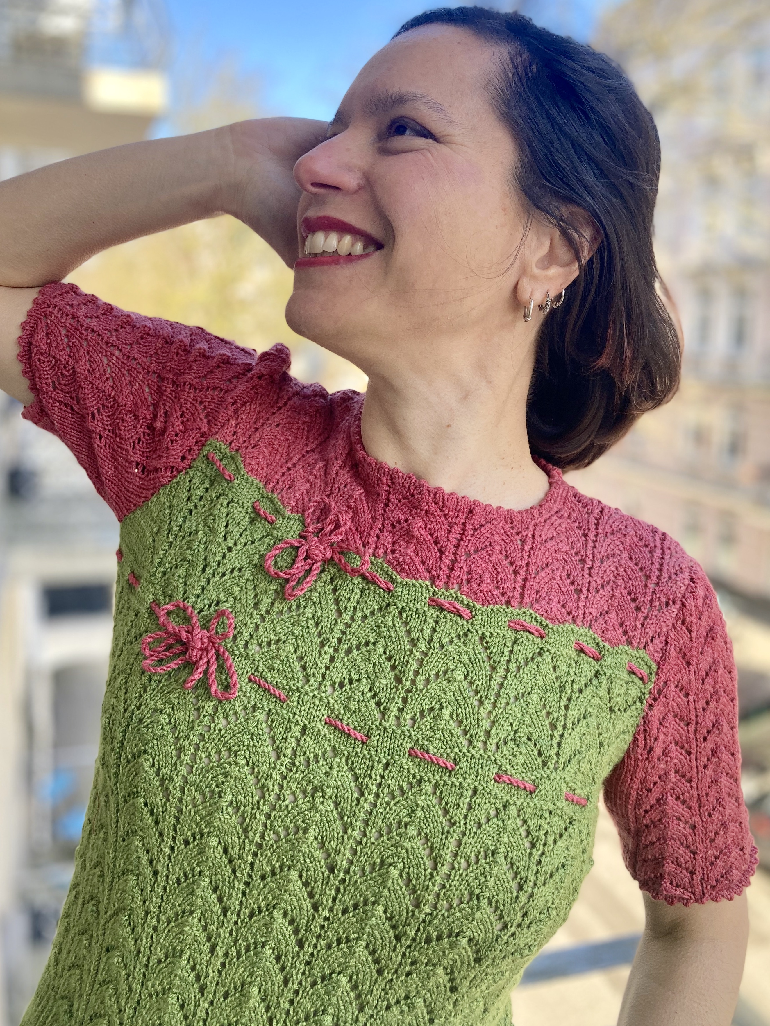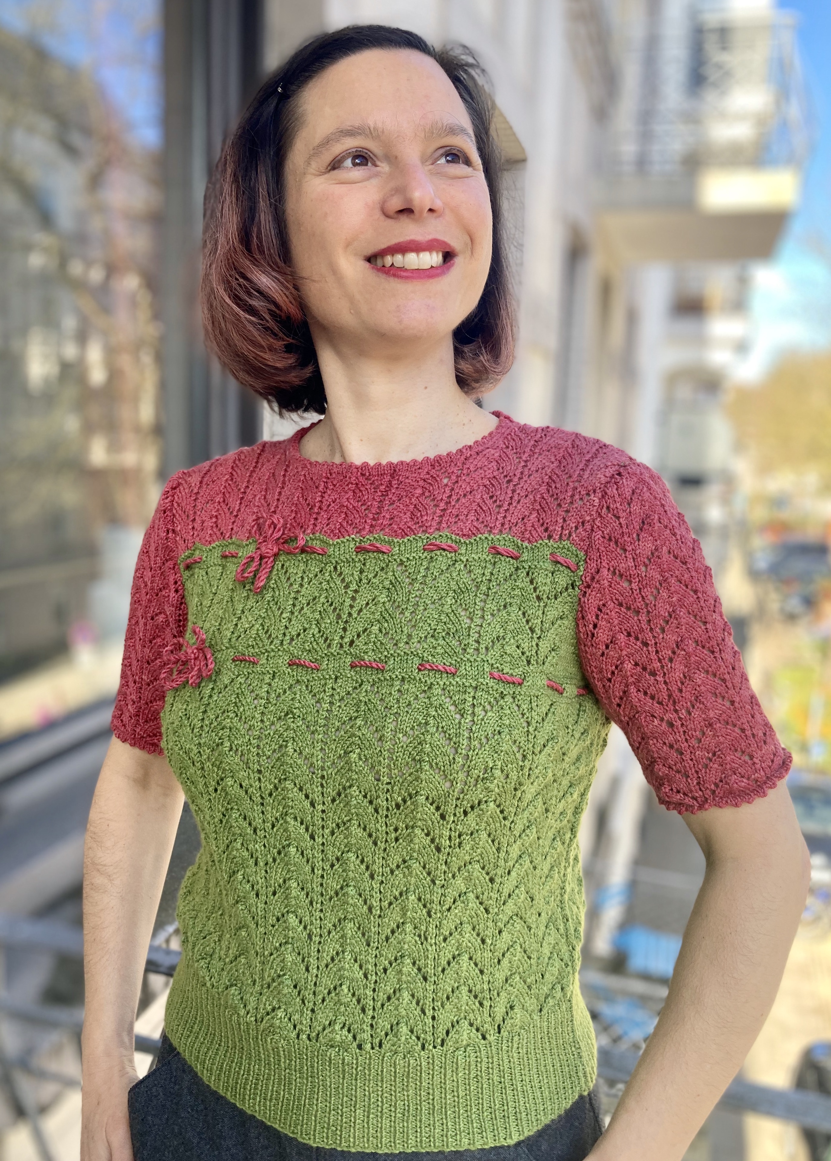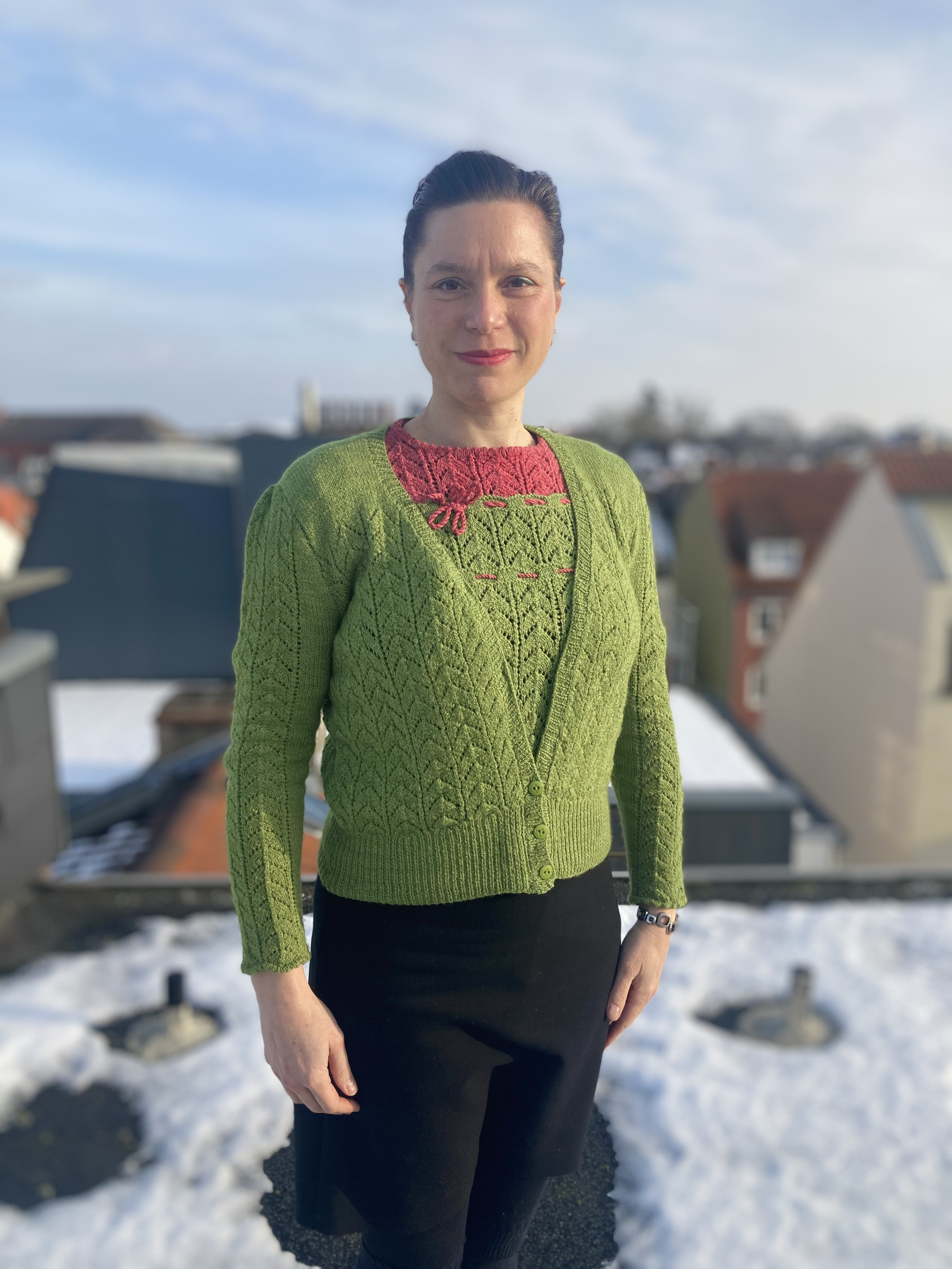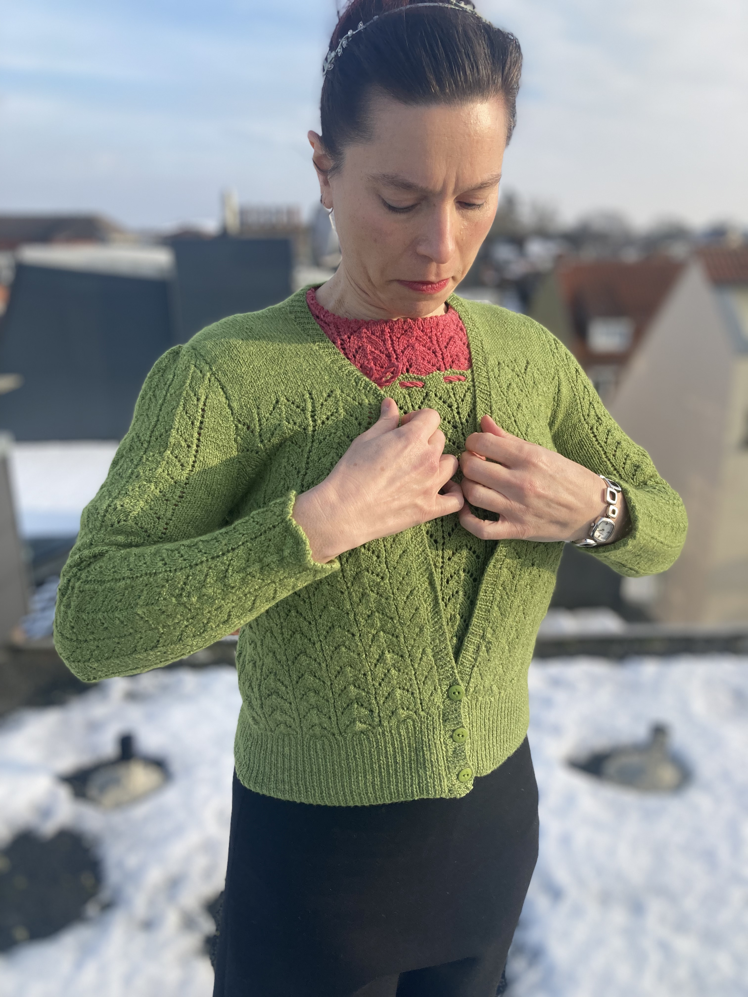 I bought the pattern from the wonderful BlackwaterVintageNtz shop on Etsy and the wool (Yundi & Grete Felice Fingering Puro) from last year’s wool festival in Sulingen (Germany). The wool is a mix of 75% merino and 25% silk, which gives it a lovely softness and shine. I bought 500 grams of green and 200 grams of pink with no set plans for what to do with it, and as often happens, it lay around for a while before it found the right project.